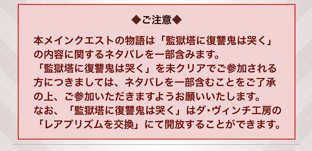 本メインクエストの物語は「監獄塔に復讐鬼は哭く」の内容に関するネタバレを一部含みます。