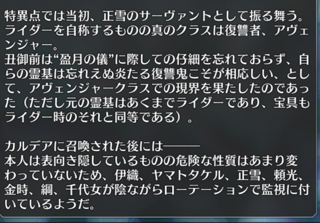 丑御前はいつかは去るつもりではあるらしいから、あえて残ってるか、定義が本来のアヴェンジャーとは若干違うとかなのかなあ。あるいは単純にユニヴァースみたいに他の世界の成立だからかまぁ残ってるアヴェンジャー達ってロスト組と違ってファッション復讐者感あるから・・・。