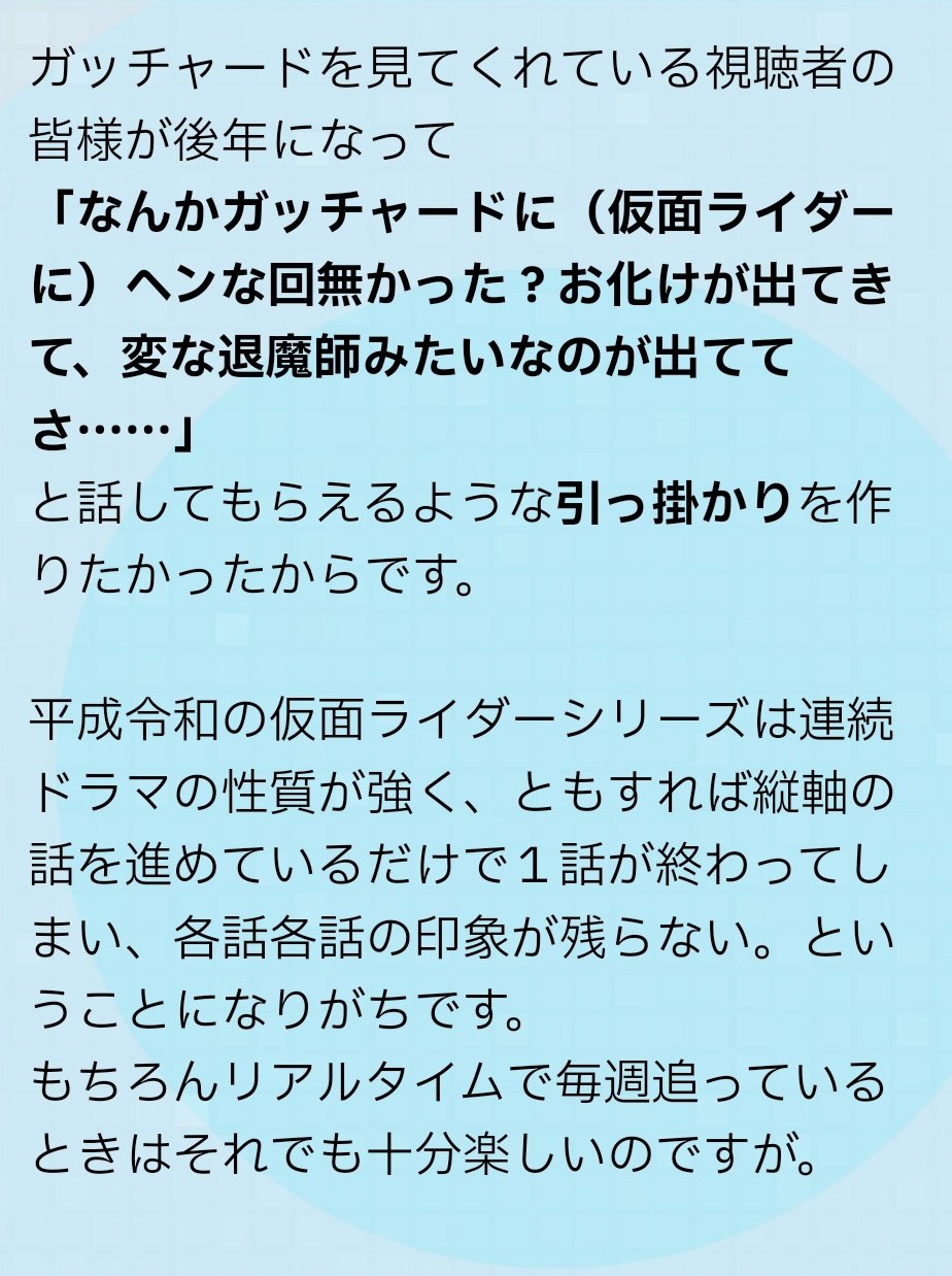 中盤はどうしても忙しくなるからねガッチャードのこの中盤になっても日常単発回や新規怪人やってくれる感じW〜ウィザード のあたりの平成ライダー味がある