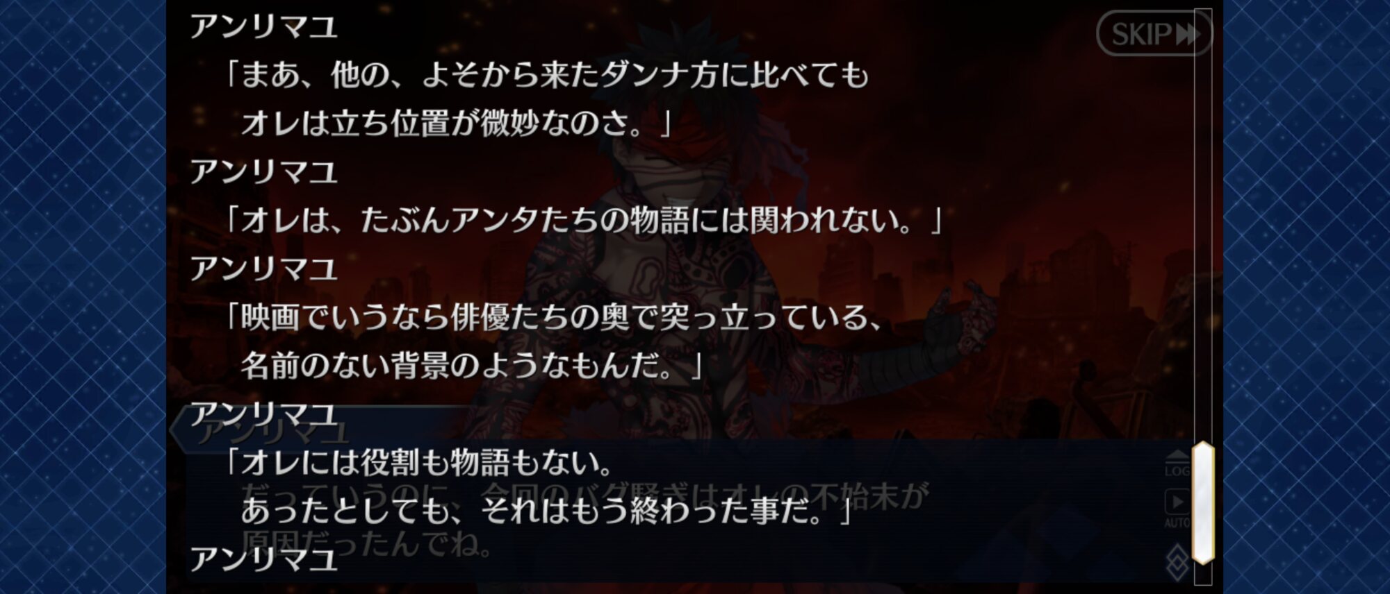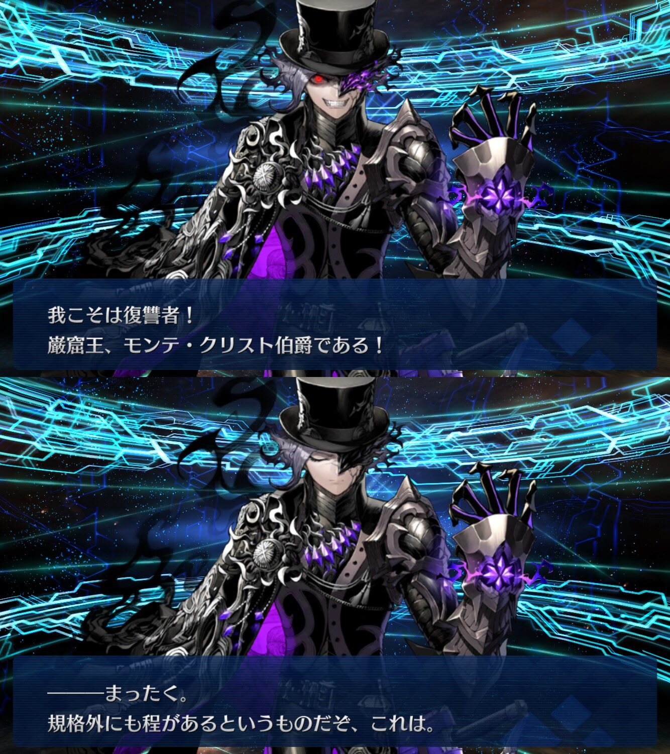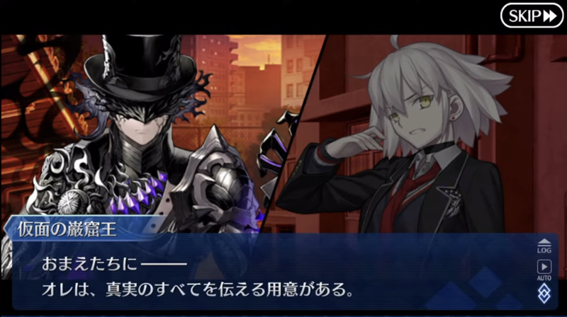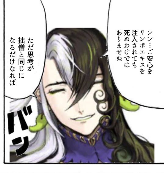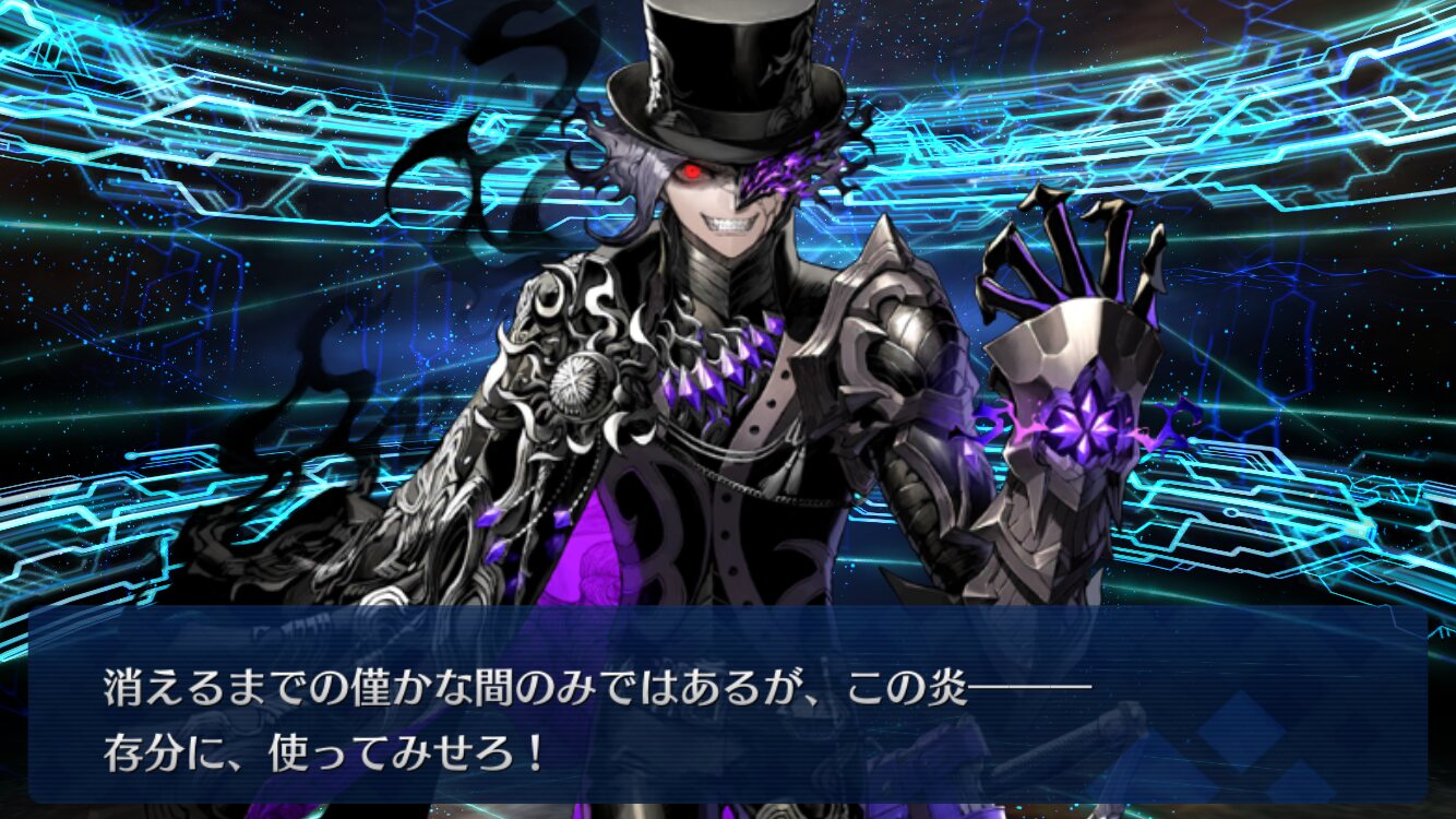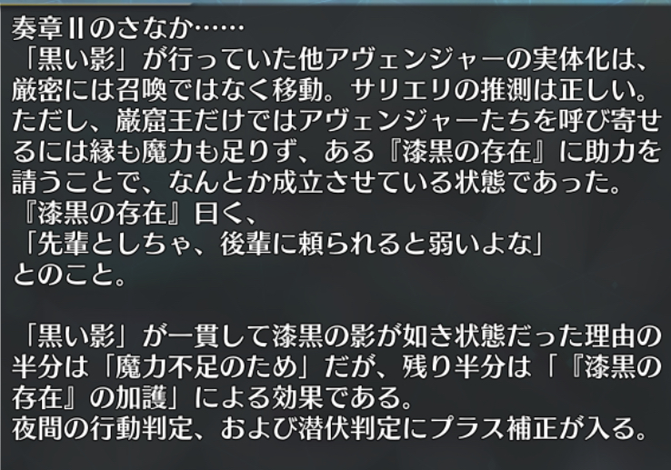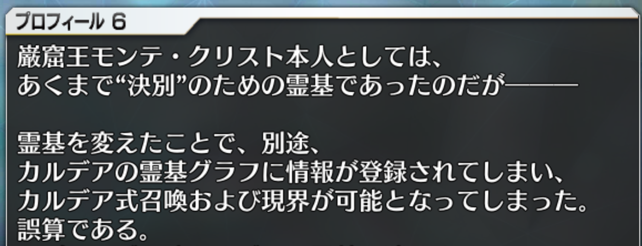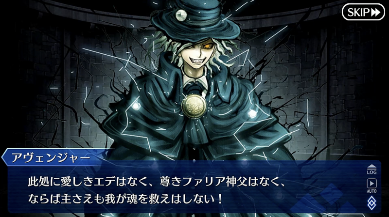 「昔の記憶のなかで自分は復讐者を知り、そうなるかならないかを決めた。みんな、自分を応援してくれた。」式神のリンボと同じだから元のカリオストロ知ってそうなのが巌窟王辺りになるのかな因縁的に