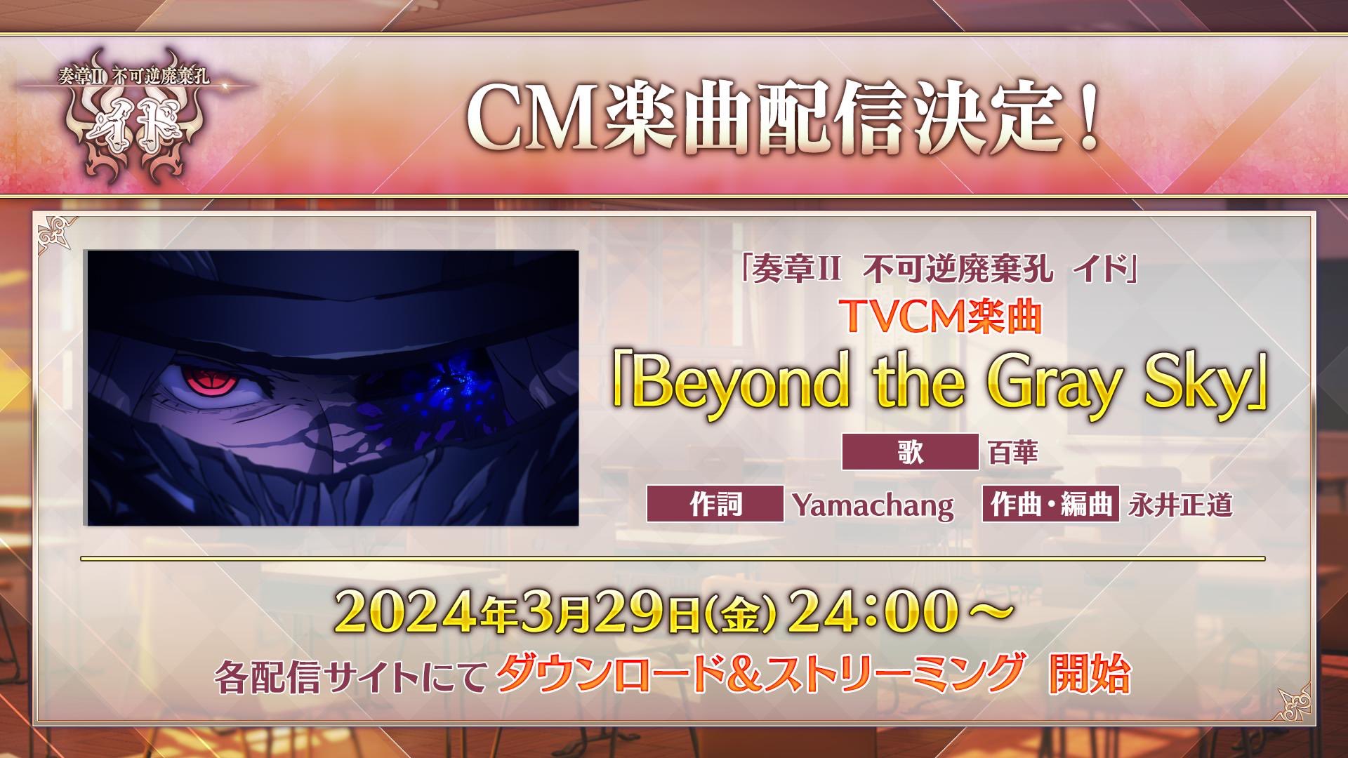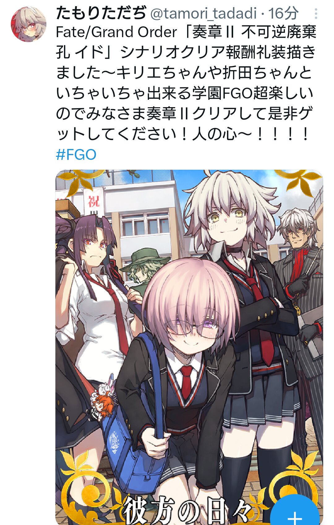 だからぐだのカラーは青空なのかな?さっき配信開始したbeyond the gray sky、イドを終えてから聴くとめちゃくちゃ味わい深くていいな……なんというか復讐者たちのマスターへの想い、こうあってほしいという願いを込めた感じというか……特に2番のサビからがなんかもうヤバい、沁みる