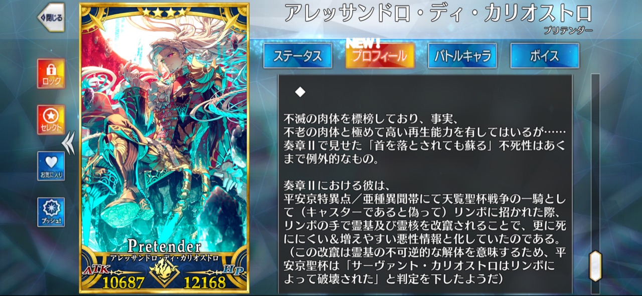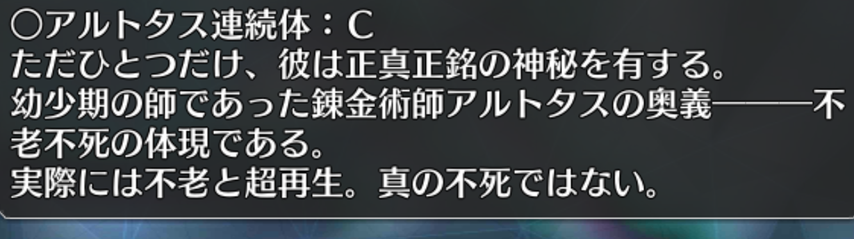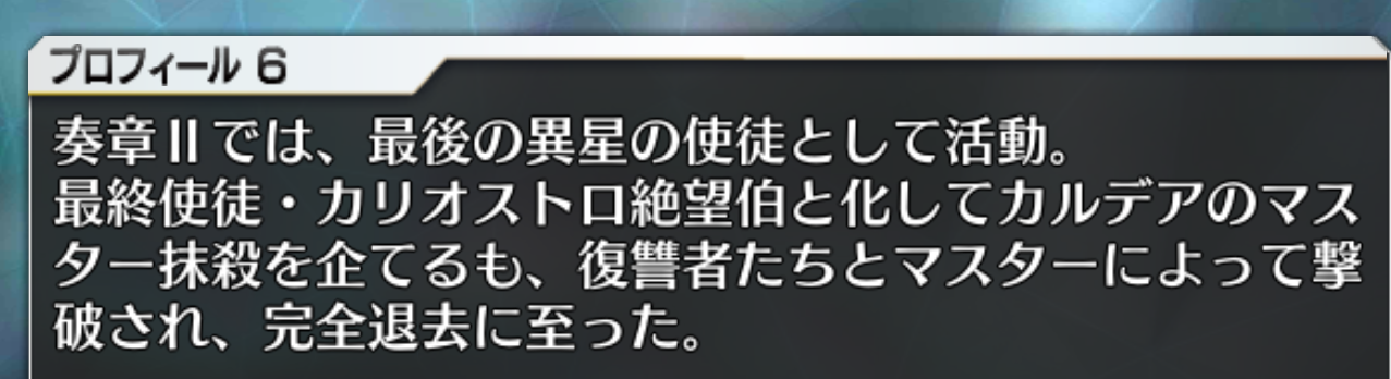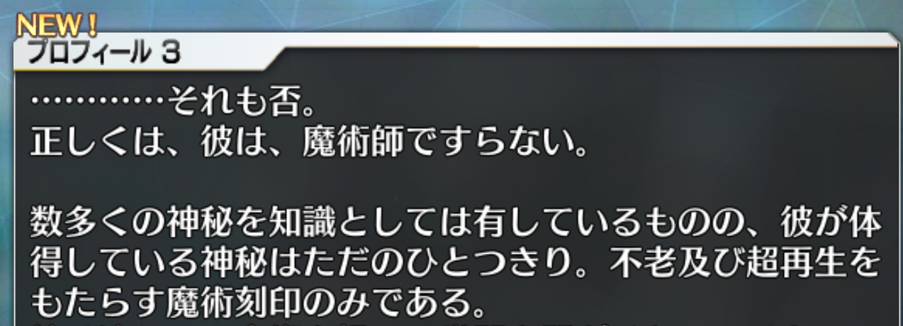 やっぱりハイ・サーヴァントじゃなかったのか。なんかスキルが言峰やリンボと違ってカリオストロ要素オンリーだし交流にも積極的だし長命なだけあって顔広いなカリオストロ