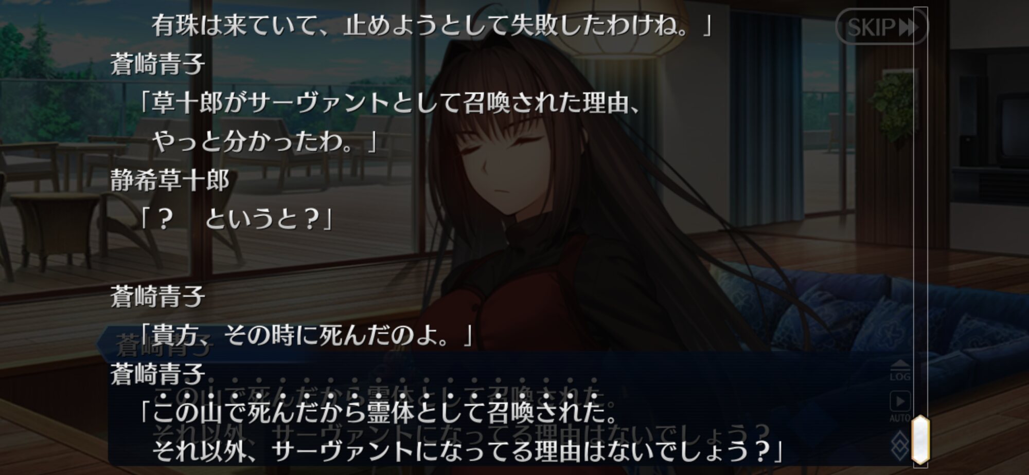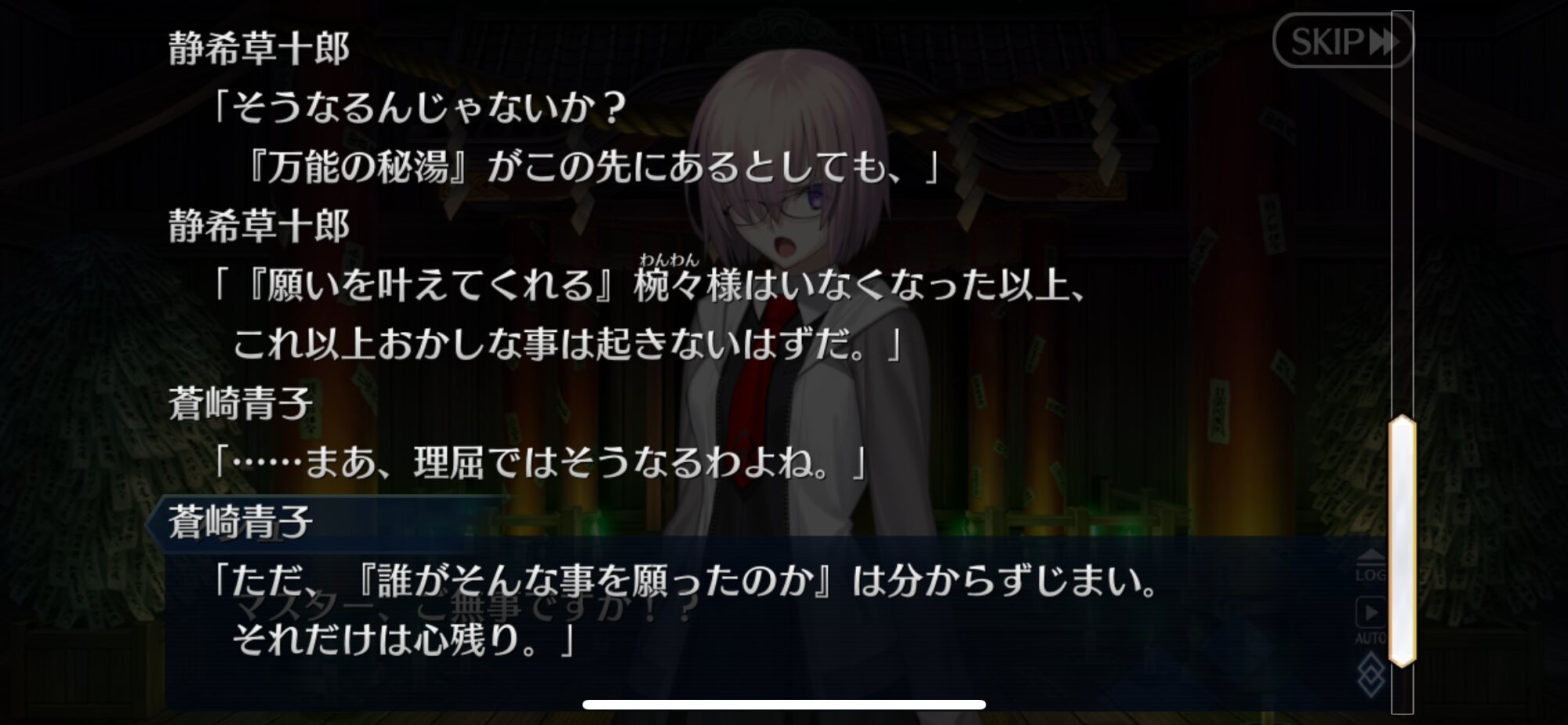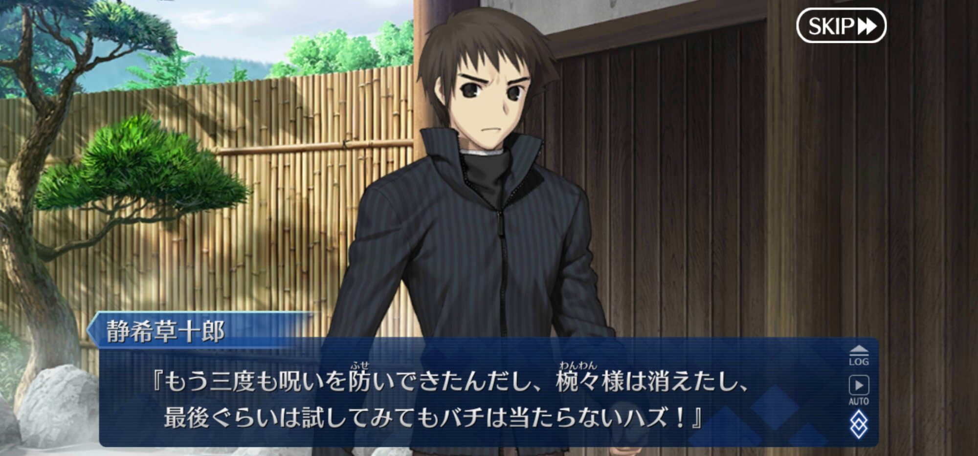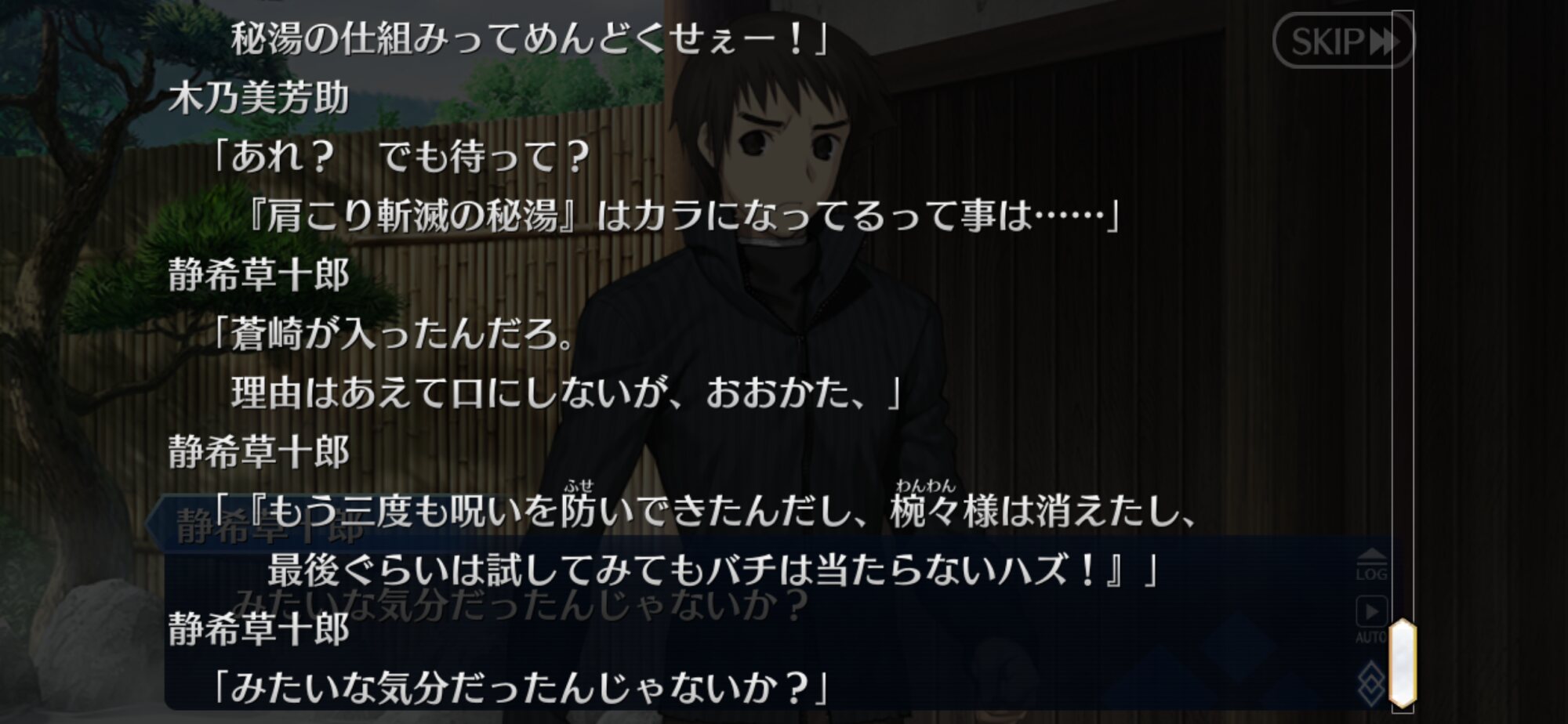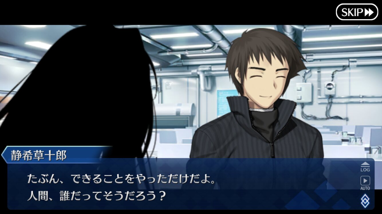 芝生ってなんやねん、シバ(カルデア側)の、ね士郎さんを椿の間に通したのはあわよくば怪異を払ってもらえるか士郎なら大丈夫と軽く考えていたんだろうな。あるいは青子さん達がいるからもしもの時も大丈夫とか。いい塩梅なろくでなしっぷり嫌いじゃないな