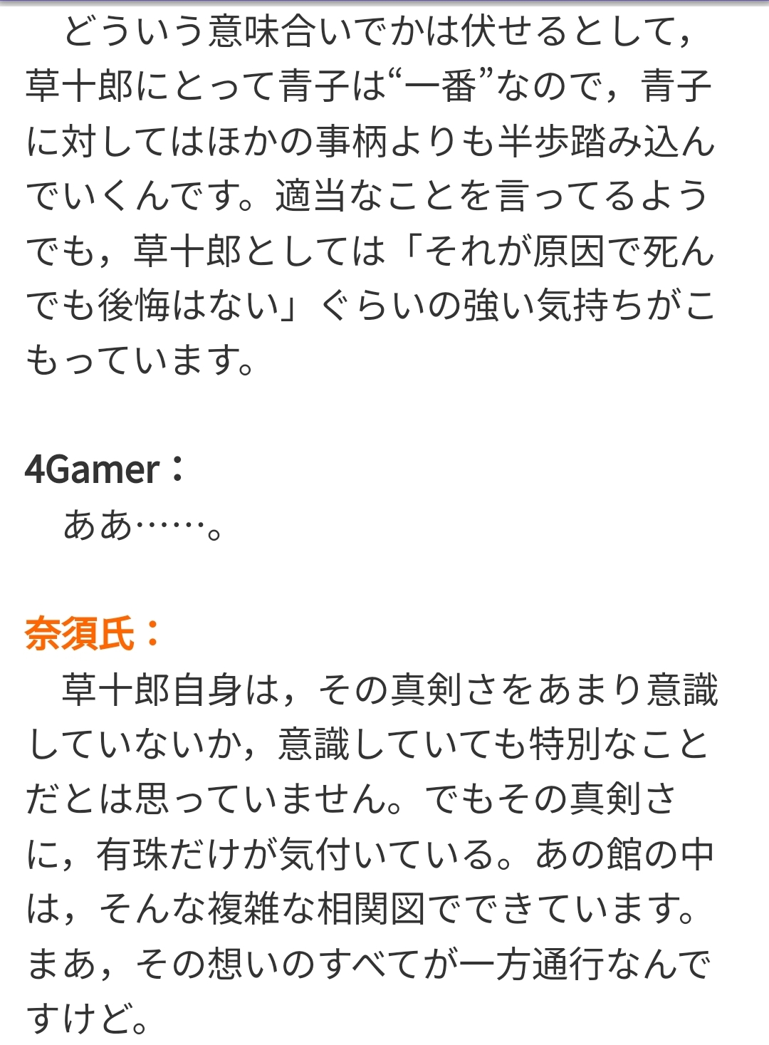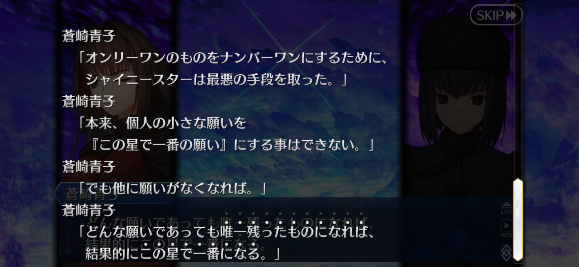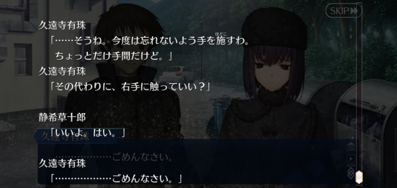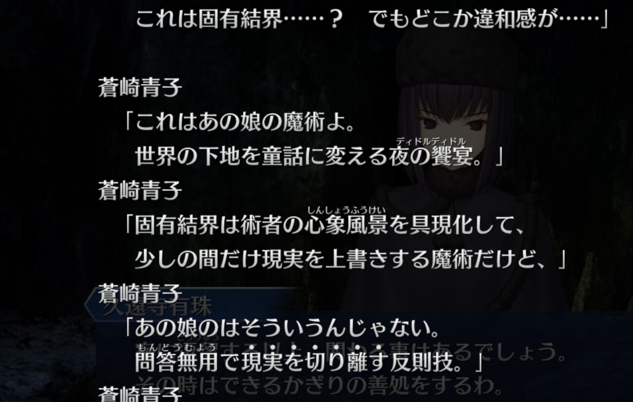 ・両儀式はどっちなのか(肉体(「」)なのか?精神なのか?精神サイドだとして一貫して丁寧な口調(私口調)が崩れないのはちょっと違和感あるなと)