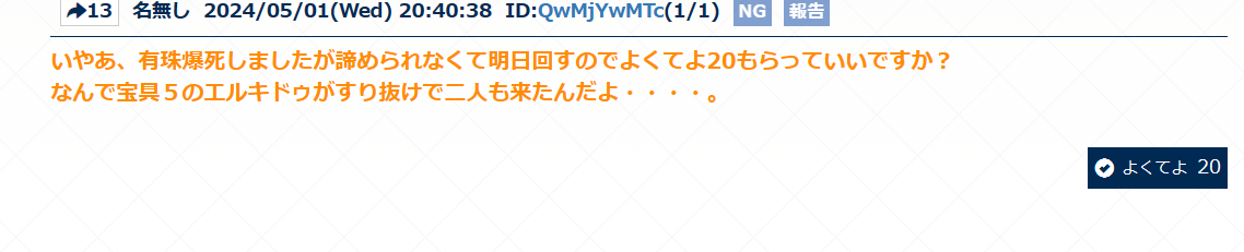 いやあ、有珠爆死しましたが諦められなくて明日回すのでよくてよ20もらっていいですか?