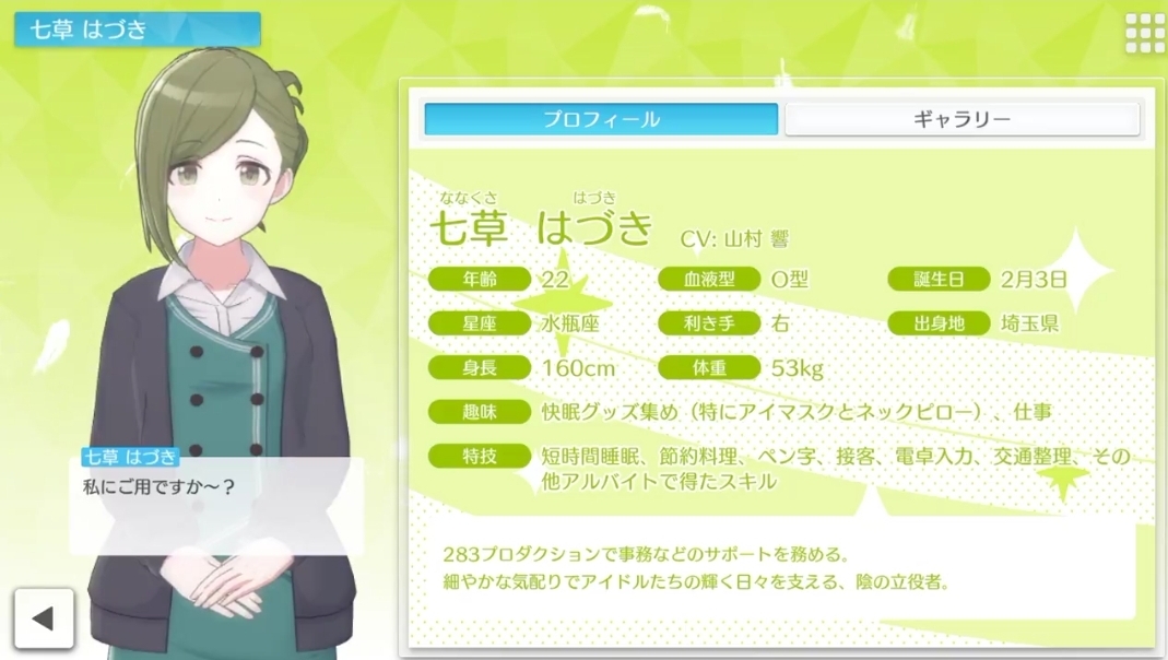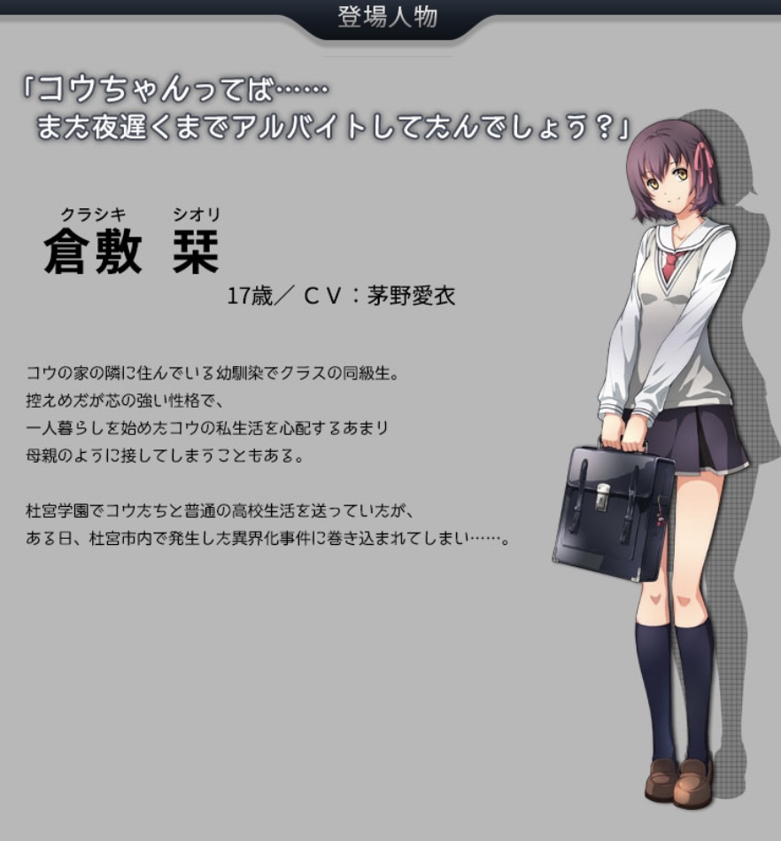 「元々は地元でも有名なお金持ち一家のお嬢様。今はルームシェアでアパートに暮らしている。冷たく世の中を斜めに見ている。ハリネズミのごとく警戒心バリバリであまり心を開かない」