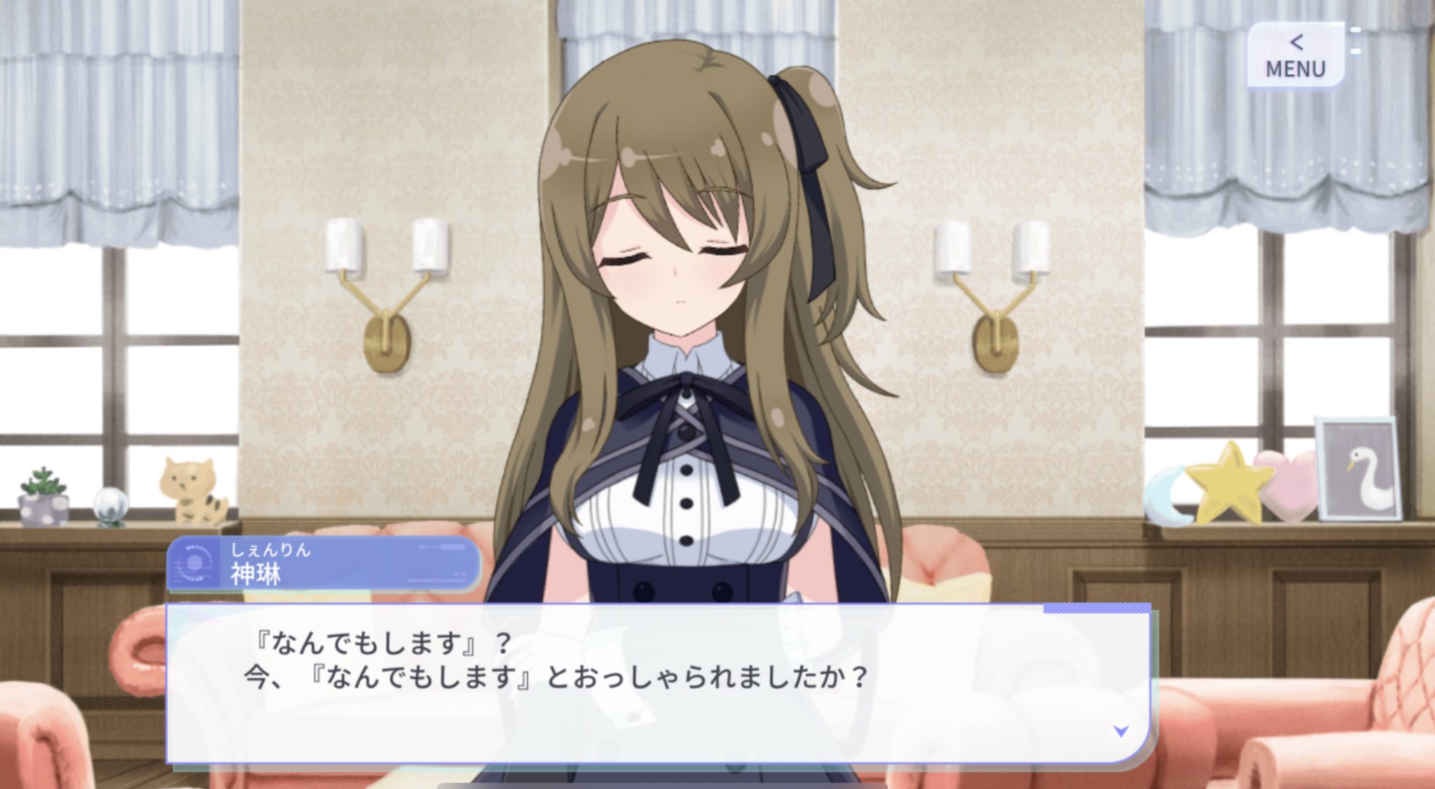 ………………………。……なんちゃって ウソよ。あたしが そんなこと 言うわけないでしょ」
