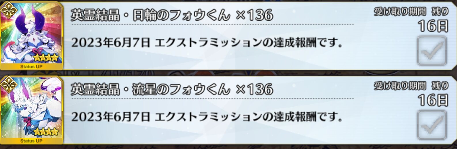 確認と承認お願いしますイベントでフォーリナー章やっちゃうと後発組がね。シナリオ読めないだけでなくクラススコアというシステム面にも支障が出るし。即インタールード入りするかもだけど