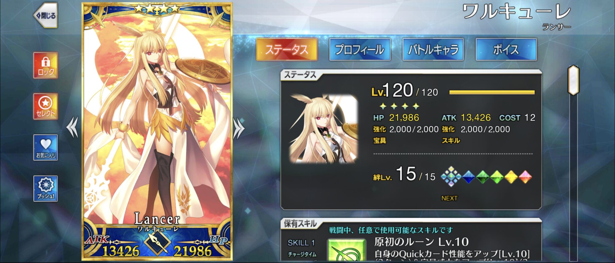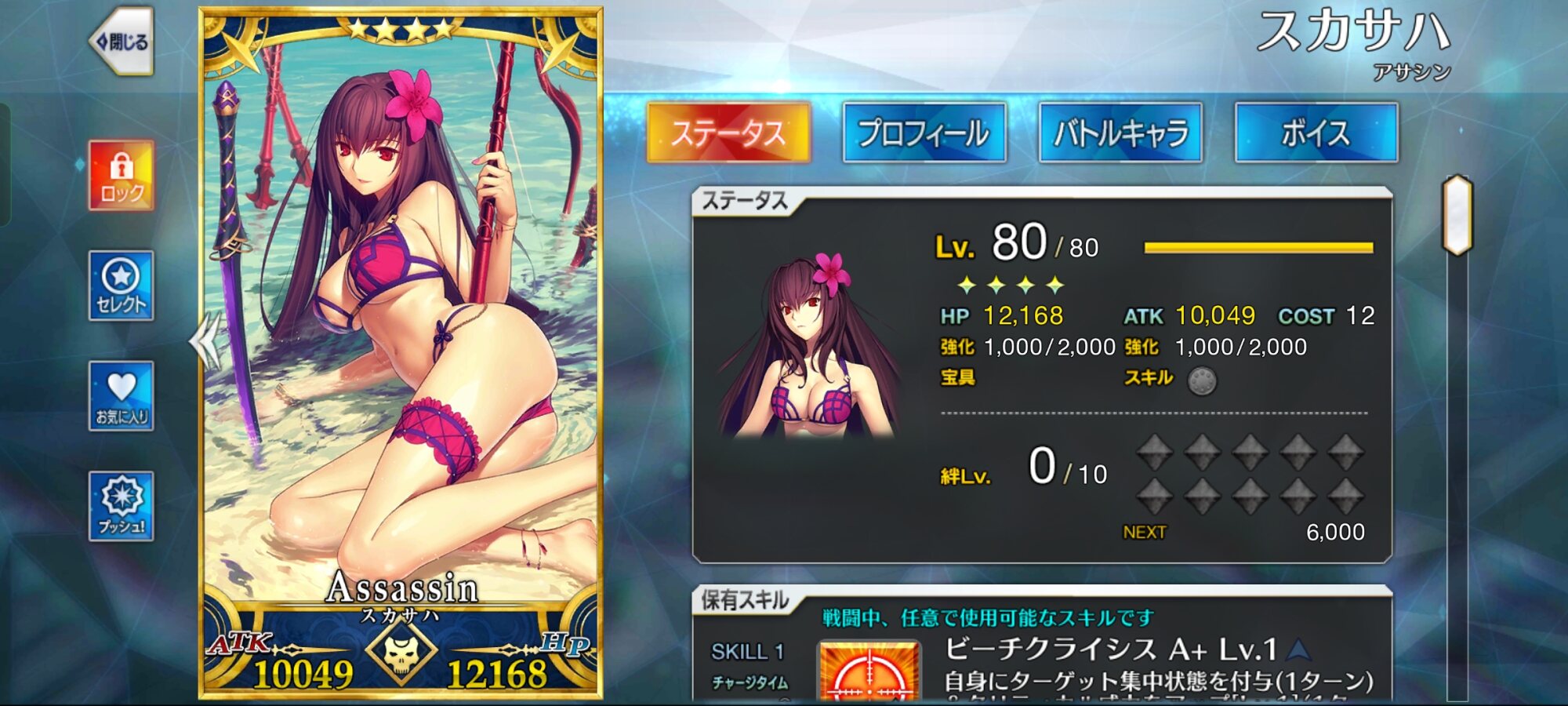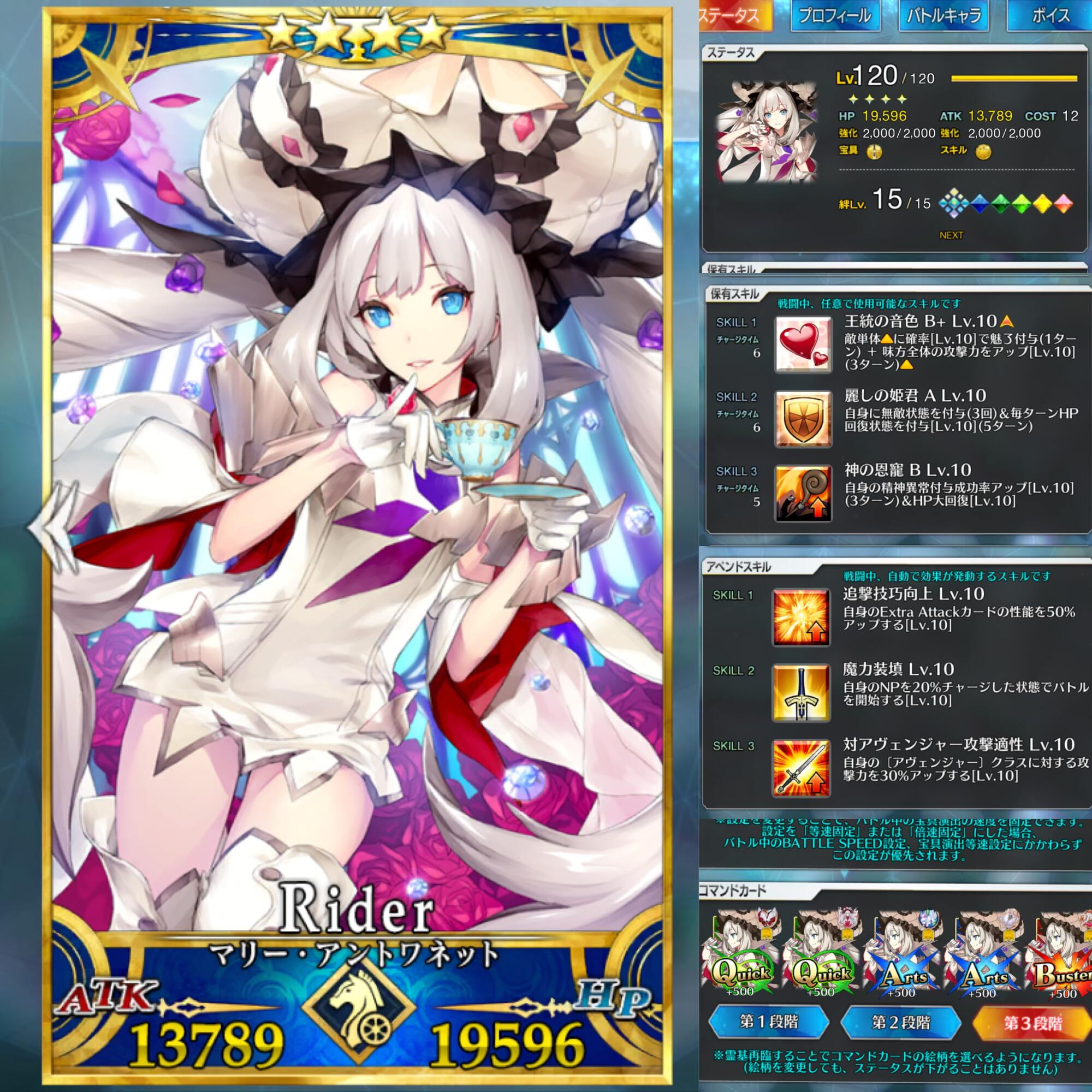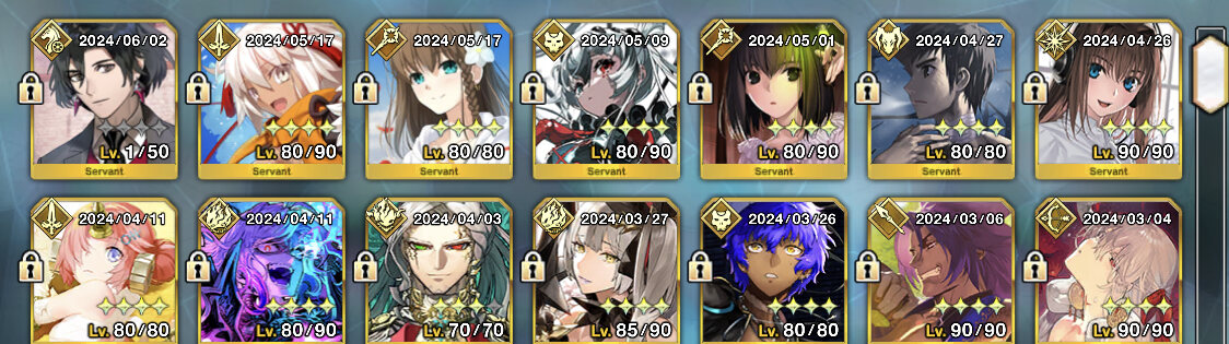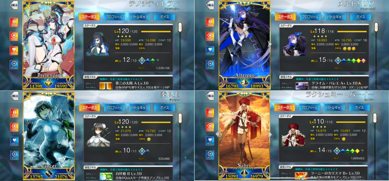 秩序・善、今を生きる人類、ケモノの絆をできるだけ上げようとするとウチではこうなる(誰か絆マになったら待機中の水着クロと入れ替え予定。ガレスはコスト的に入れられる範疇で入れられそうな人材がこの子くらい)