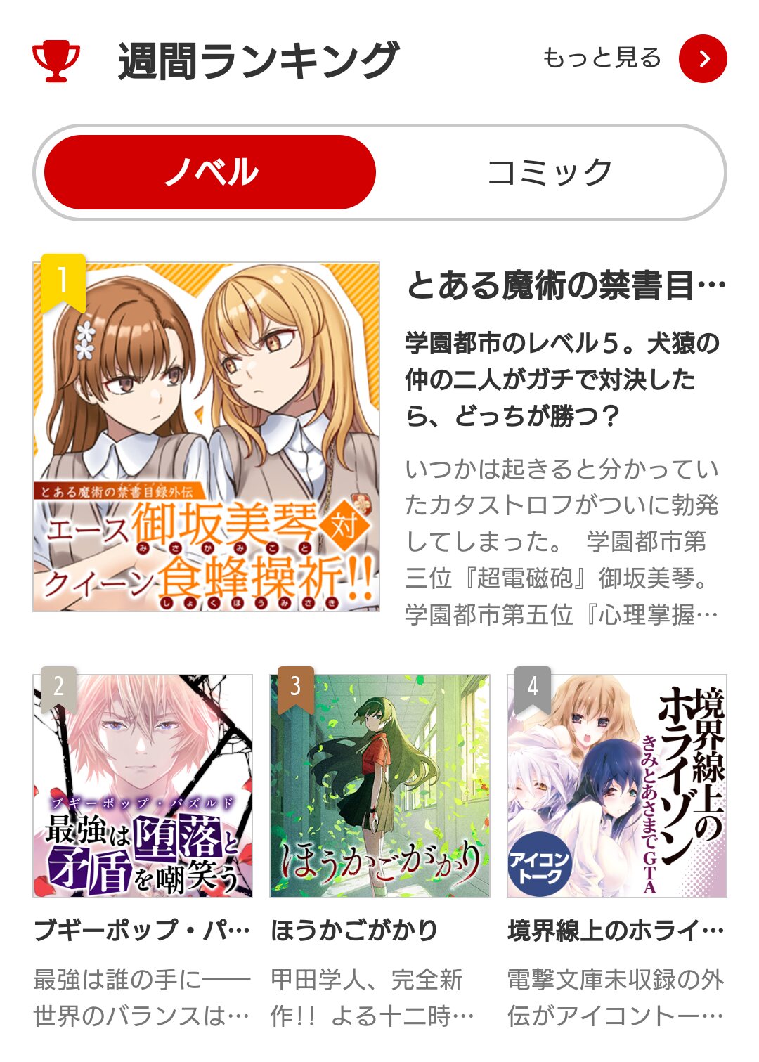 電撃文庫、自サイトで新作の先行公開したりとまだまだ売る気や宣伝する気あるのは感じるけどとっくに更新終わった&書籍版出て序盤以降消えてる禁書が未だにランキングトップに残ってるのは何なんだろうね