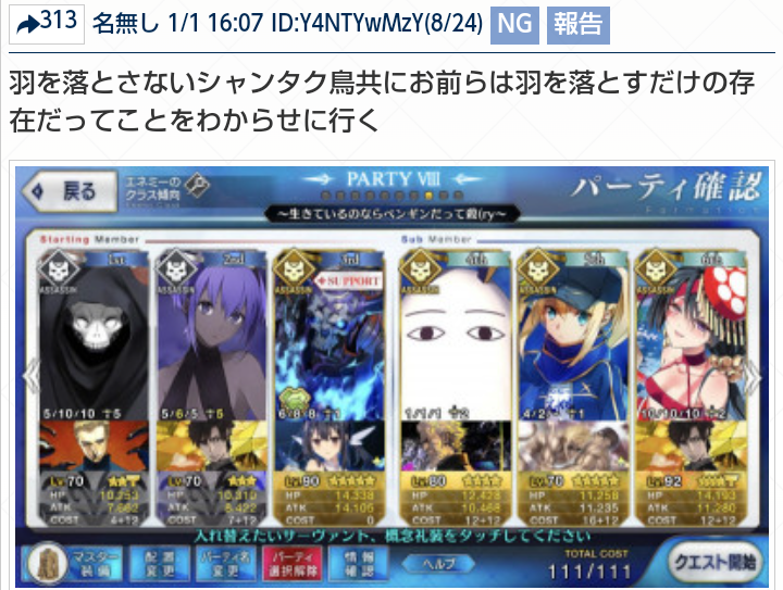 (民明書房刊 『雑スレ珍百景目次録 アルクェイド増刊号』より。)思えば小太郎への愛が重すぎたり、カーマと愛で殴りあったり、シャンタクをアサシンで倒したり、パイセンによる鯖解説があったり、以エルという謎カプがあったり、荊軻とかテスカトリポカを大量育成をしたりと昔からスレ民達は独特なアサシン愛が強かったな…