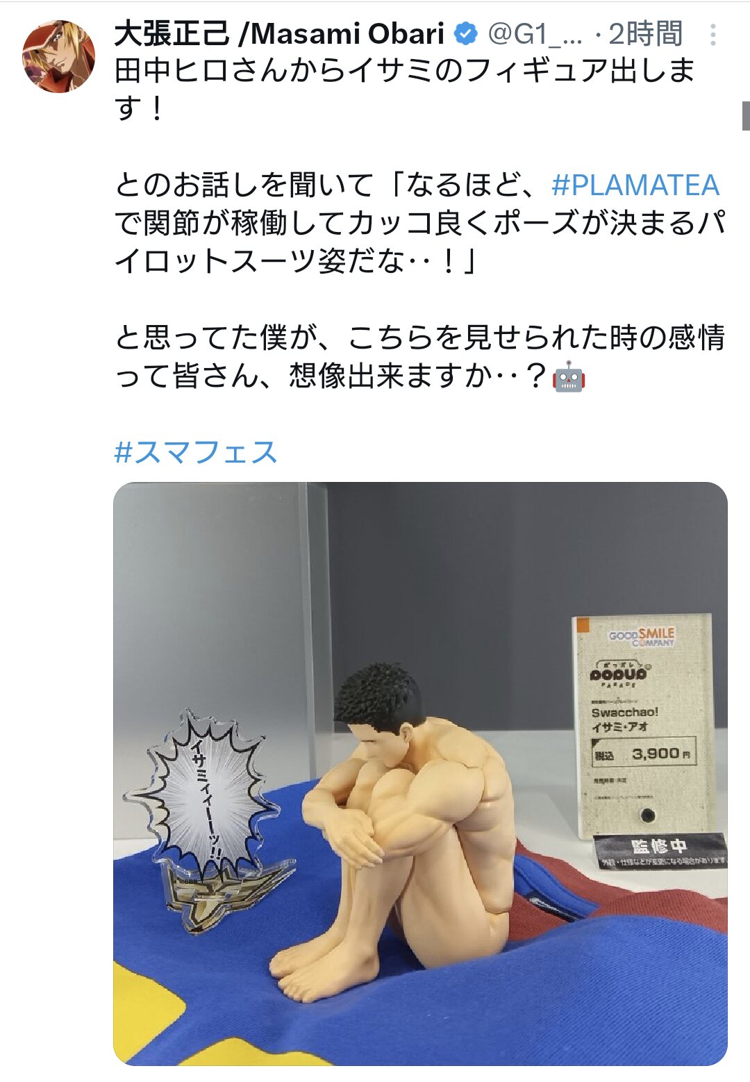 予約開始してないのに「お迎えしたらイサミのお尻が痛くならないようにクッションか何か用意してやらないとな」、「全裸だから寒くならないように羽織るもの必要だろうか。可動フィギュアではないから腕や足を通せないから首だけ出して体はすっぽり覆うものしか使えないな・・・・」とか考え始めてる頭ブレイバーンな自分がいて怖い。>>855