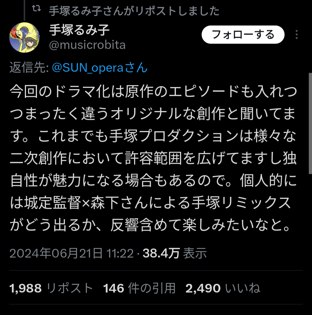 深夜ドラマでもいいから観てみたいhttps://twitter.com/anime_oshinoko/status/1807285687130939814