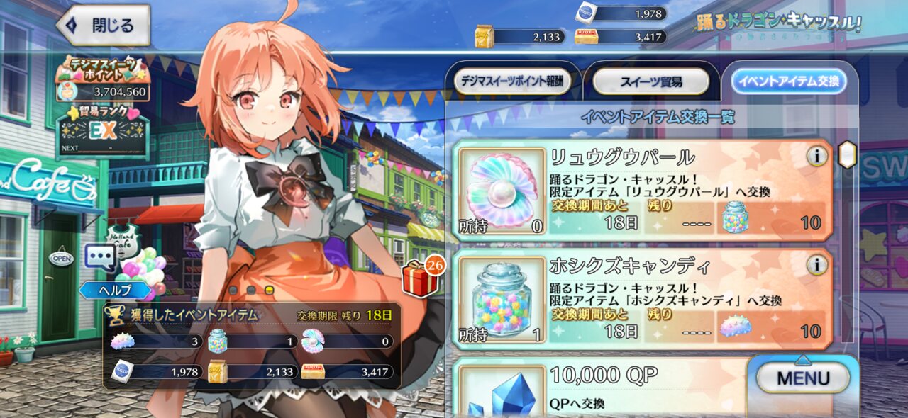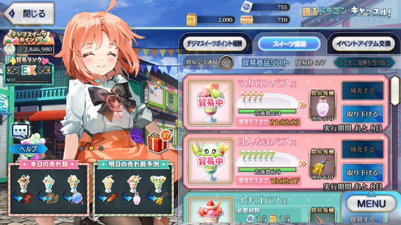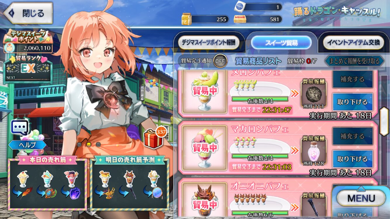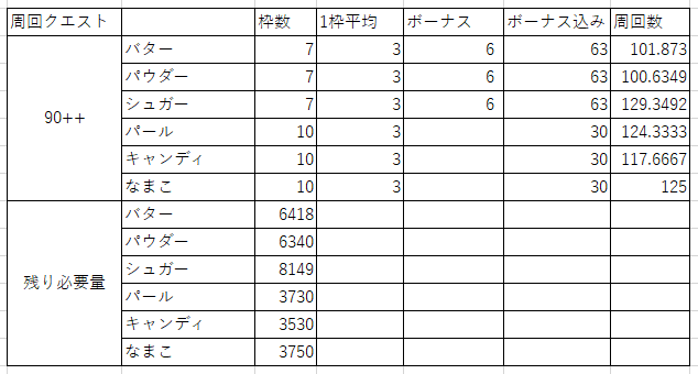 ごめん、表作ってから気づいたけど、パフェの素材が7枠、交換素材10枠は辛く見過ぎてたと思う。