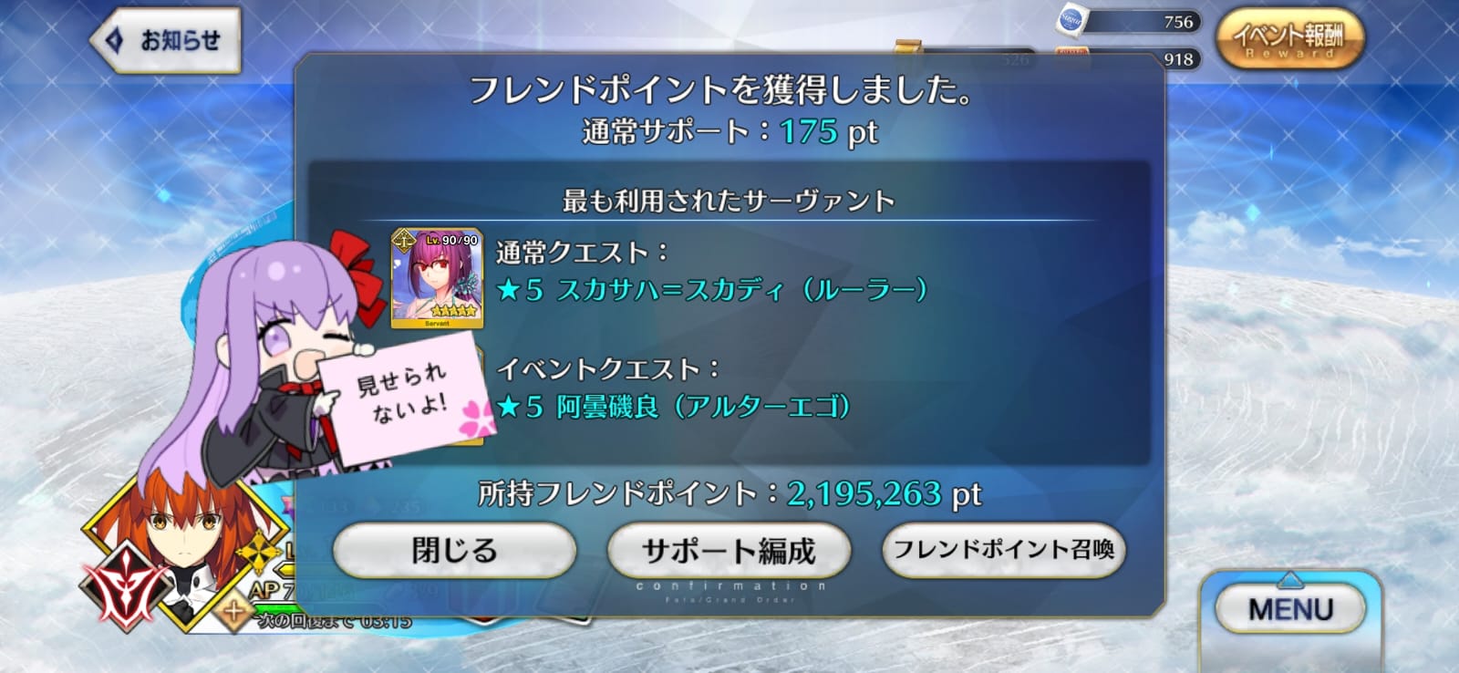 いつものぬいぐるみがクラン2世に…徐福ちゃんとパイセンは噛み合わないように見えますが、実際運用するとパイセンのモリモリ回復するHPにちゃんと食らいついて行くんですよ。そして宝具回転率を上げてくれる。