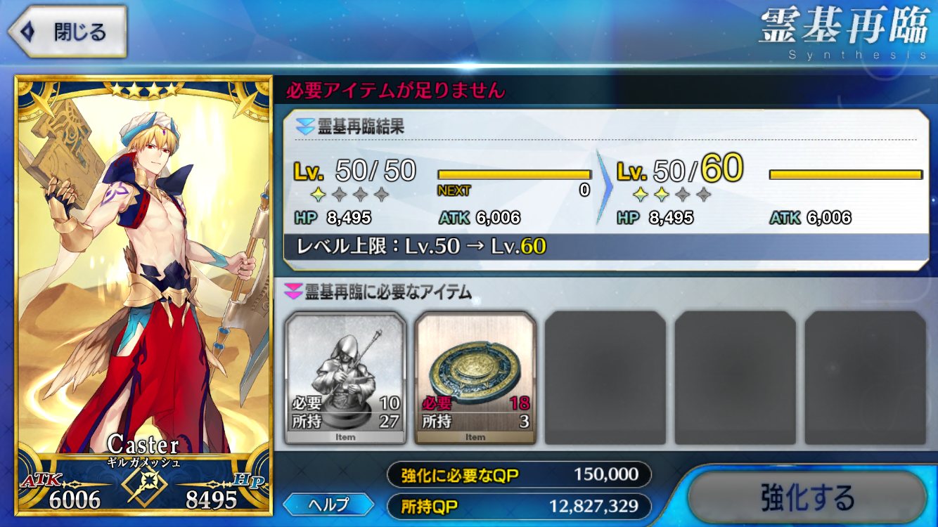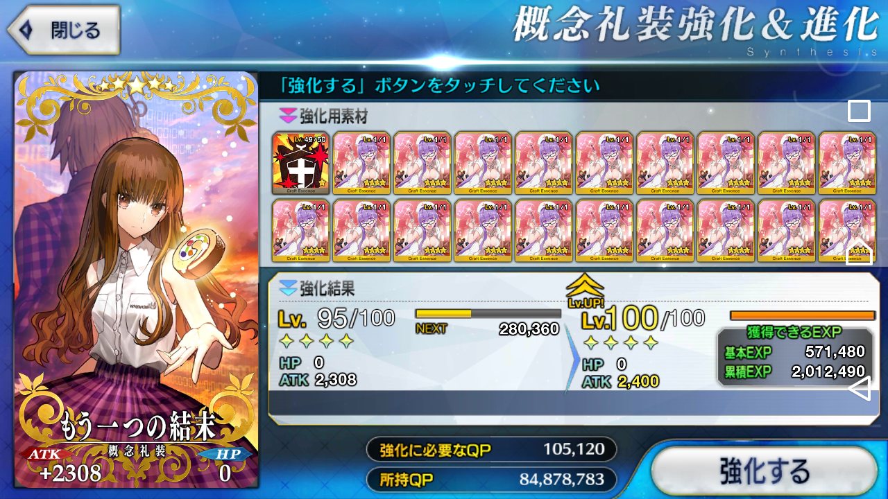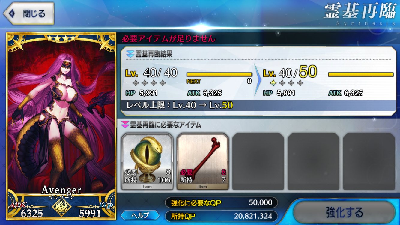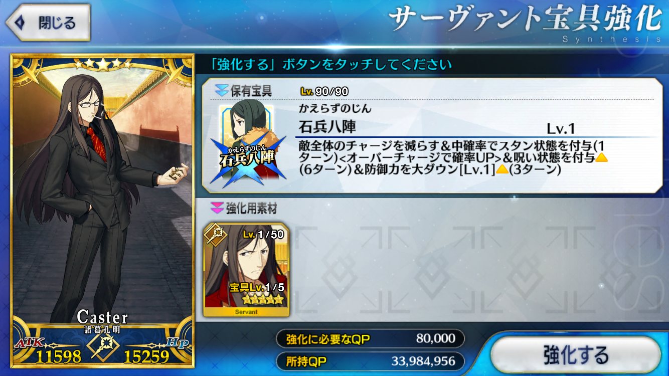 強化にかかるQP半減は良い文明だな。強化成功率UP来たら常に来てほしいが無理かなぁ