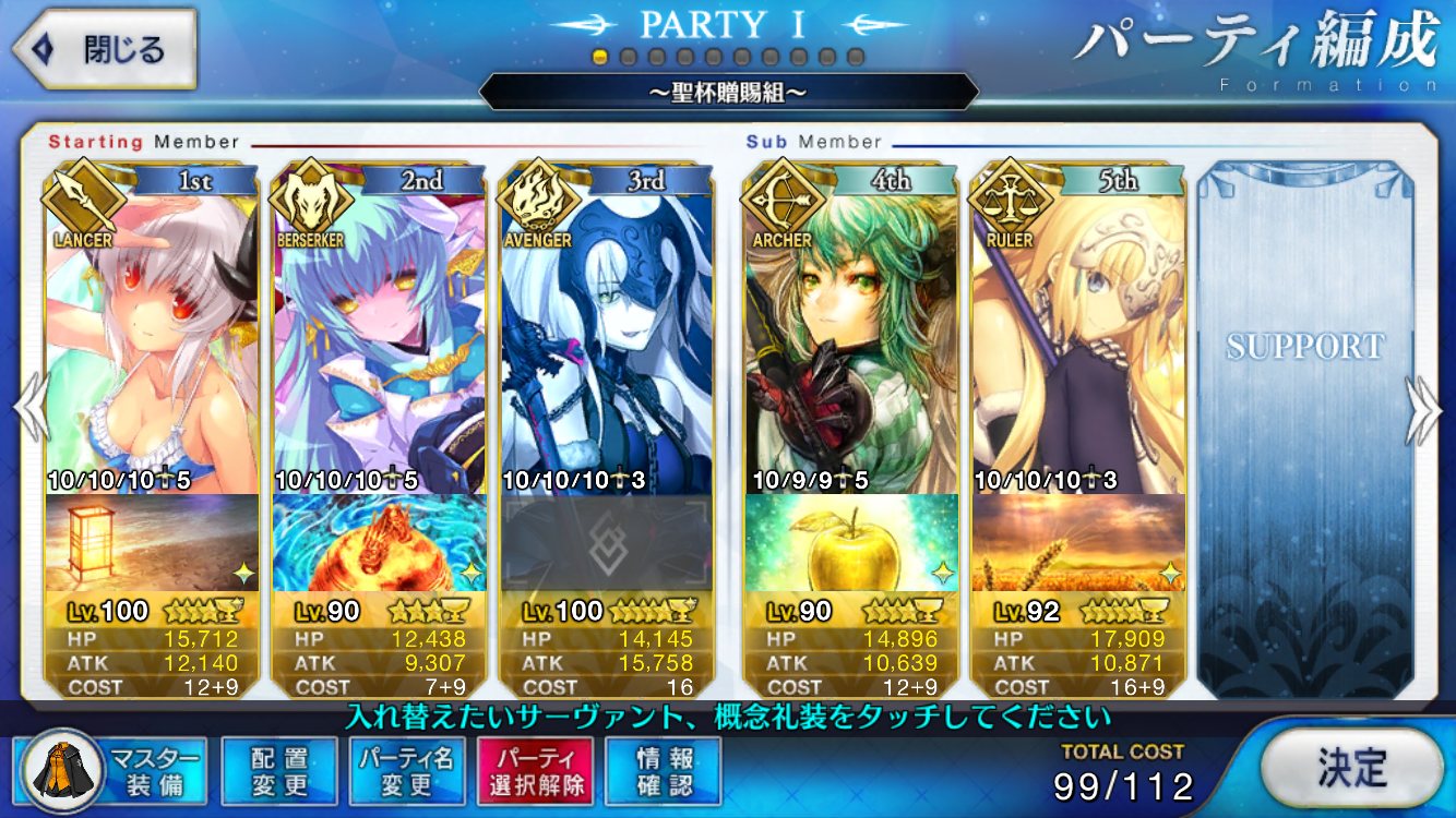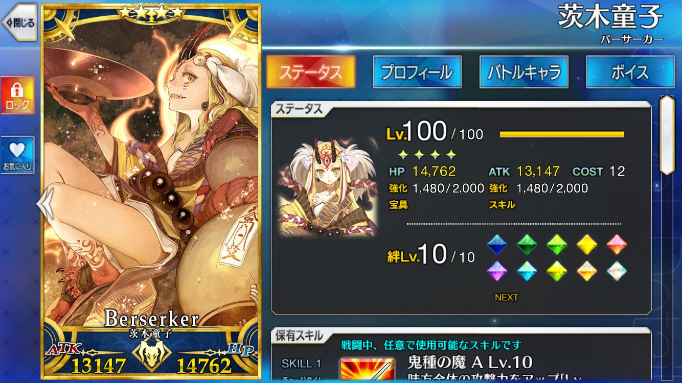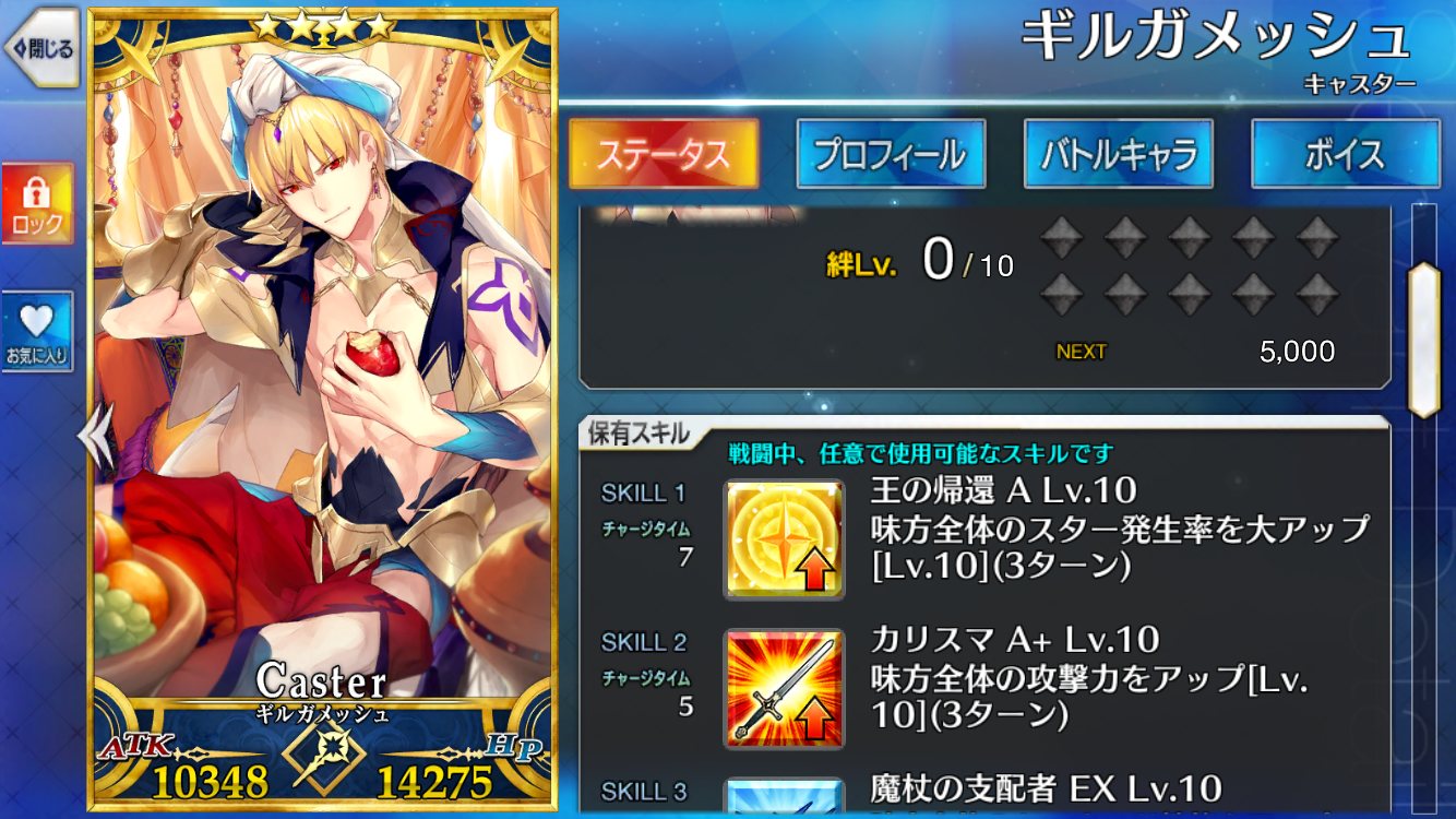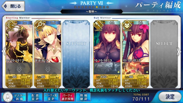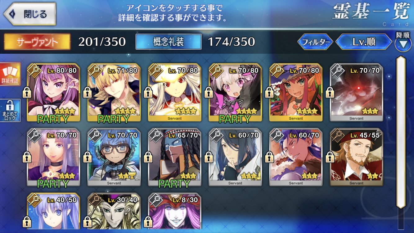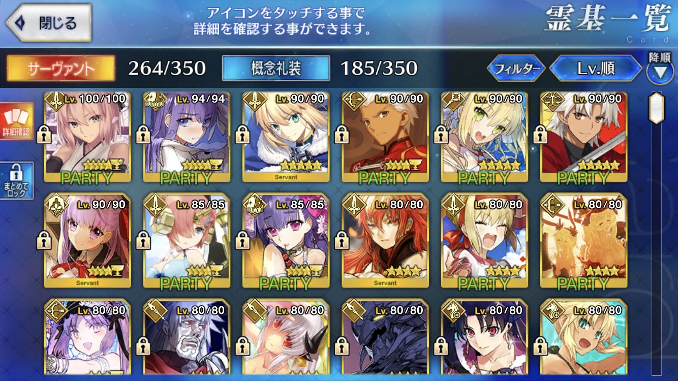 レベル100にするのは聖杯が多く必要だからね、スカサハと頼光しかレベル100はいないや。あとは星4のお気に入りを90にしてる。