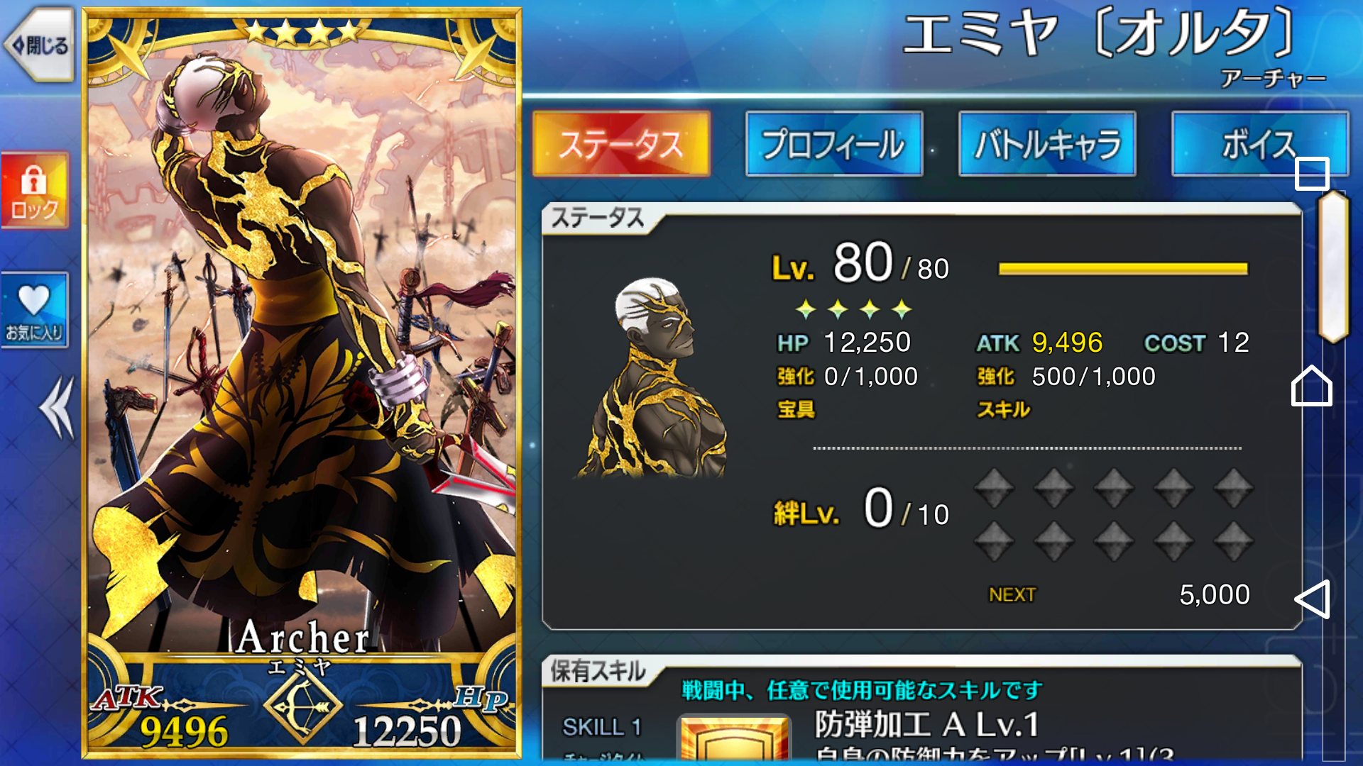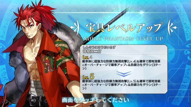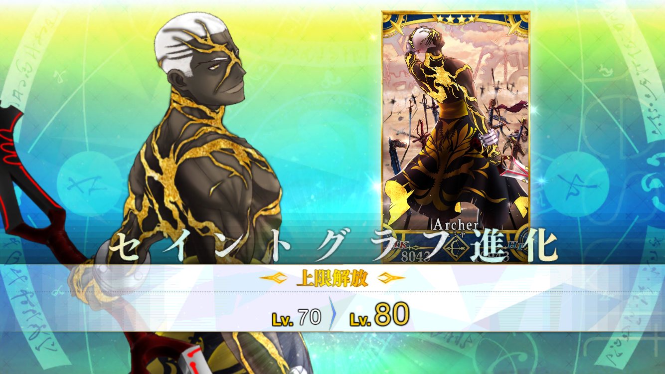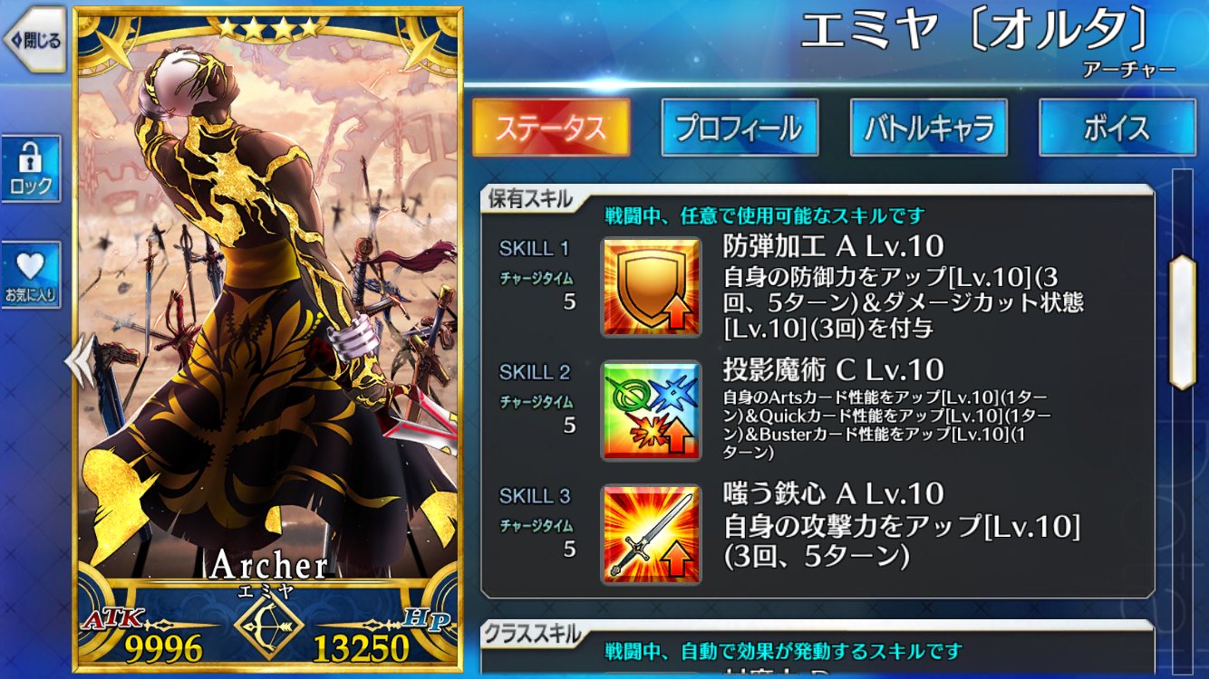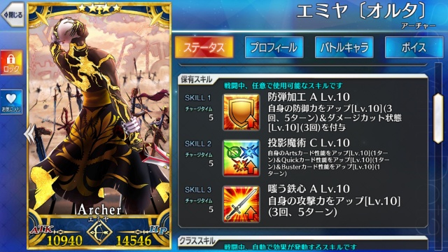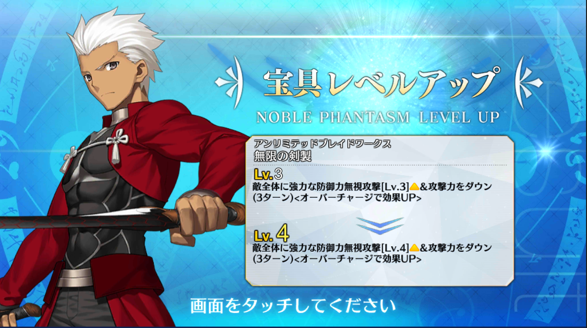 エミヤ。マーリンガチャでも一枚きて、貰えば宝具Lv.が4になる