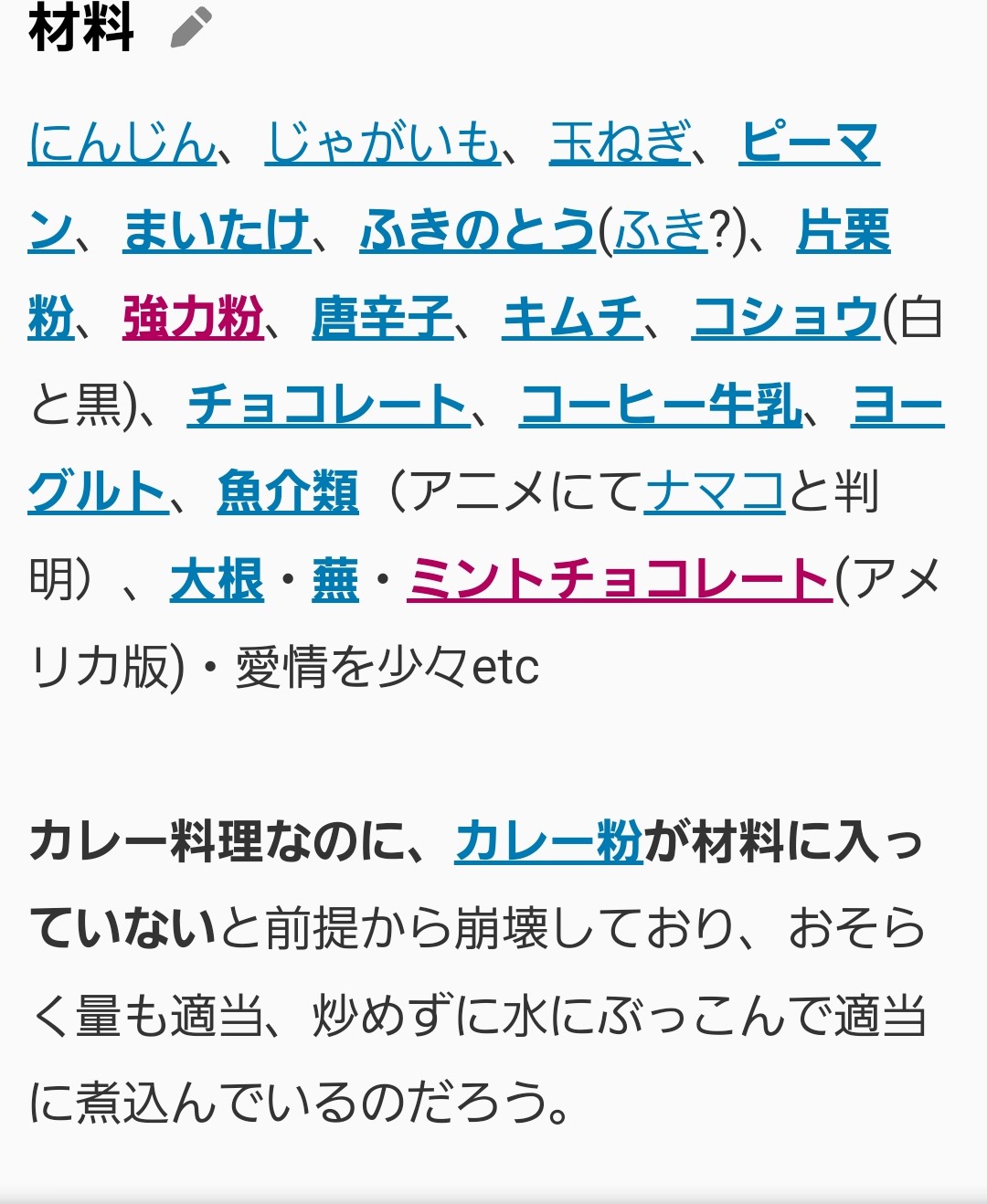 最初の3つ以外カレーらしいものが何一つないというね(チョコは辛うじて、隠し味とかでならアリだが)