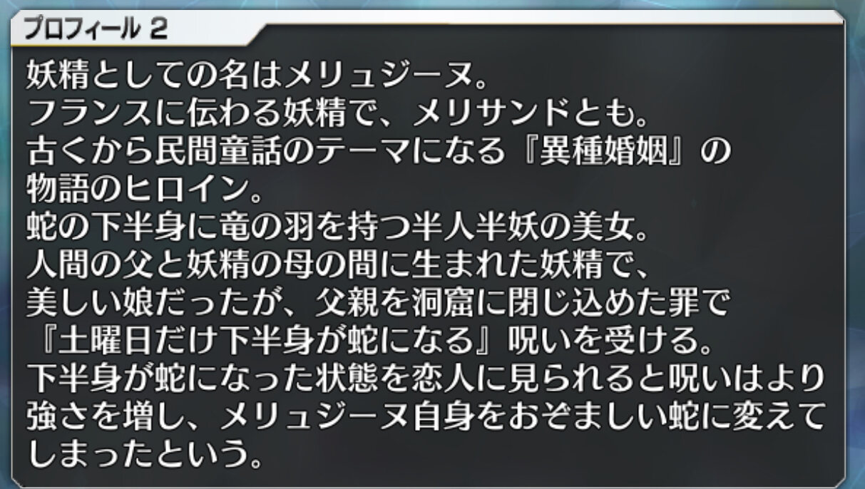 フランスの伝承に登場する水の精霊(wiki引用)らしいから伝承≒童話ってことなんかね水着メリュ子の三連射でクリアできる幅が広がるな