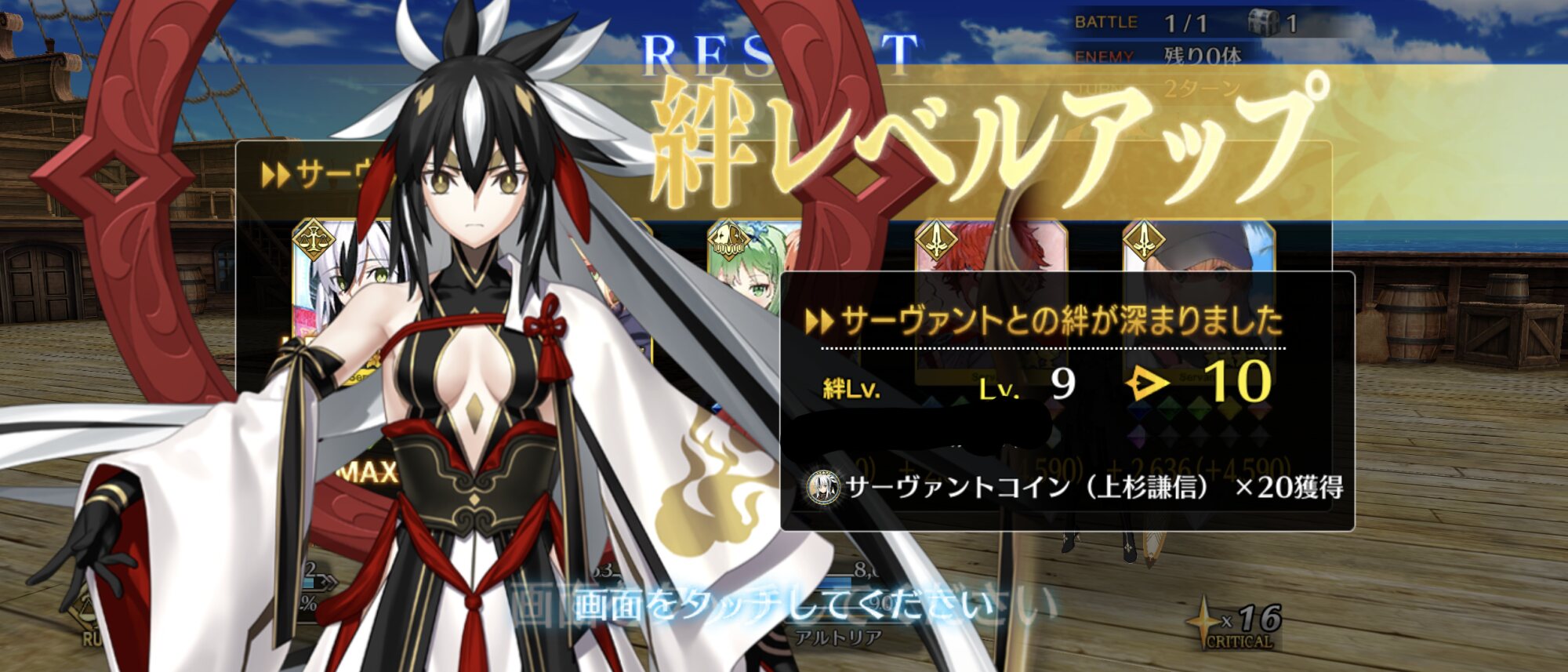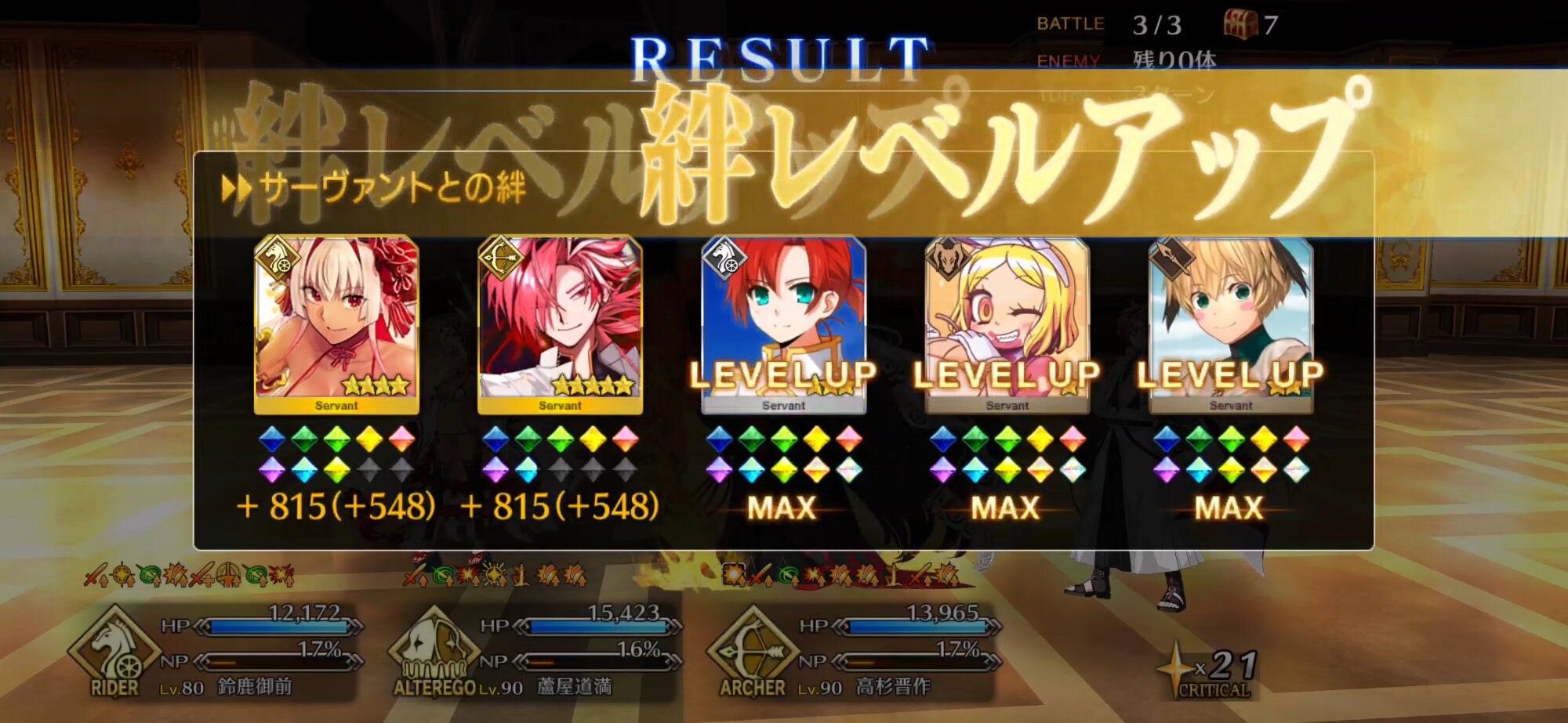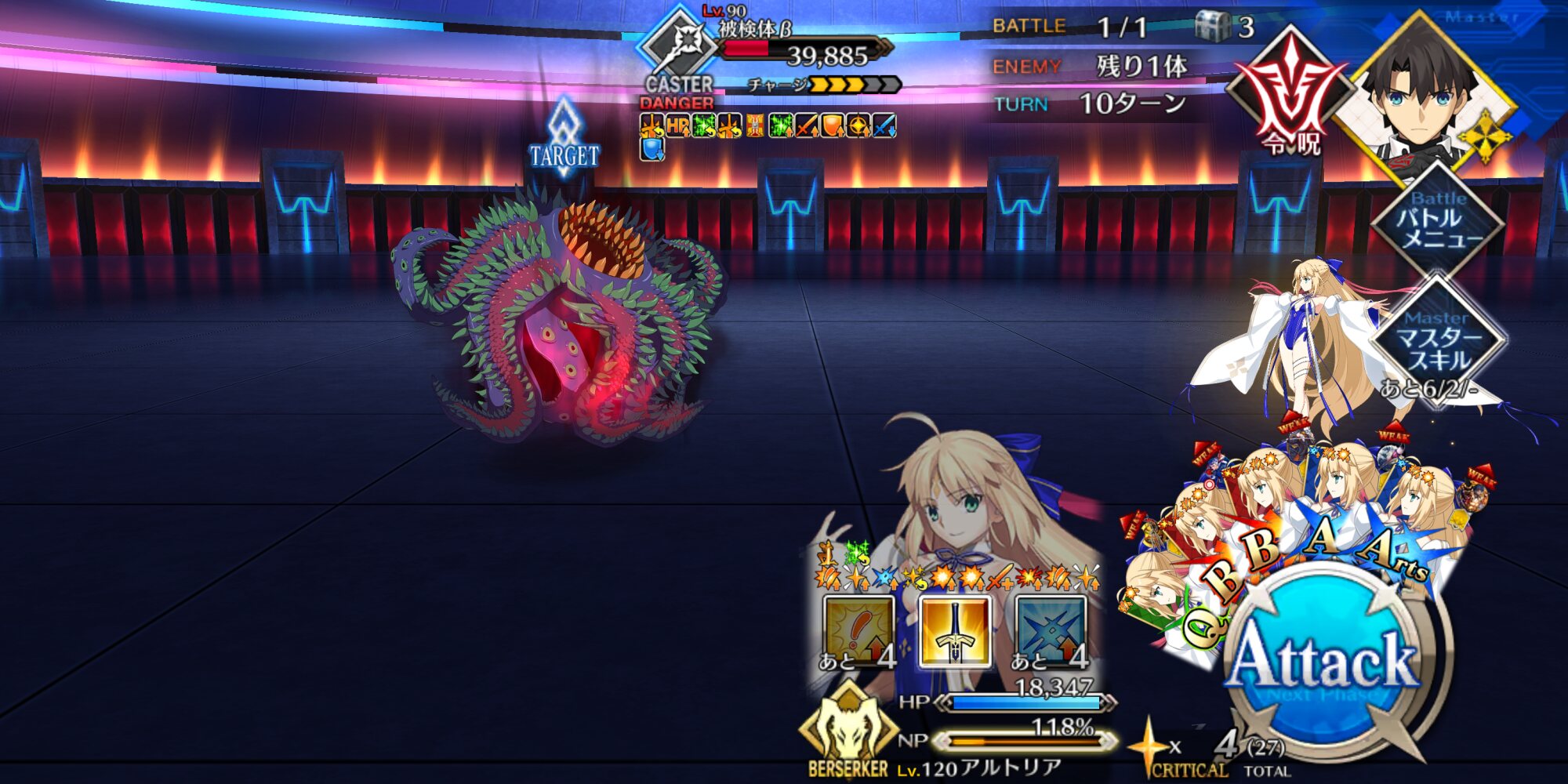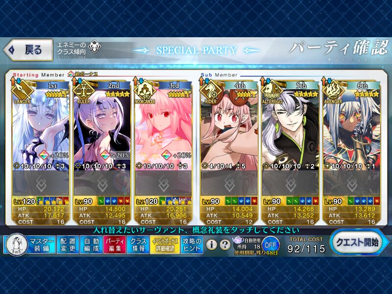 特攻状態:紅閻魔、雷帝 (強化後) 上乳上 (強化後) 式部さん (強化後) バサトリア クリームヒルト 水着のメリュ あと礼装いくつか