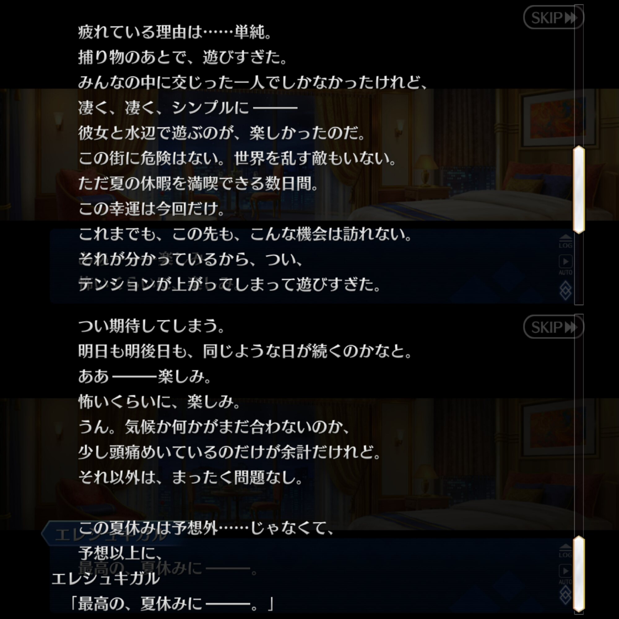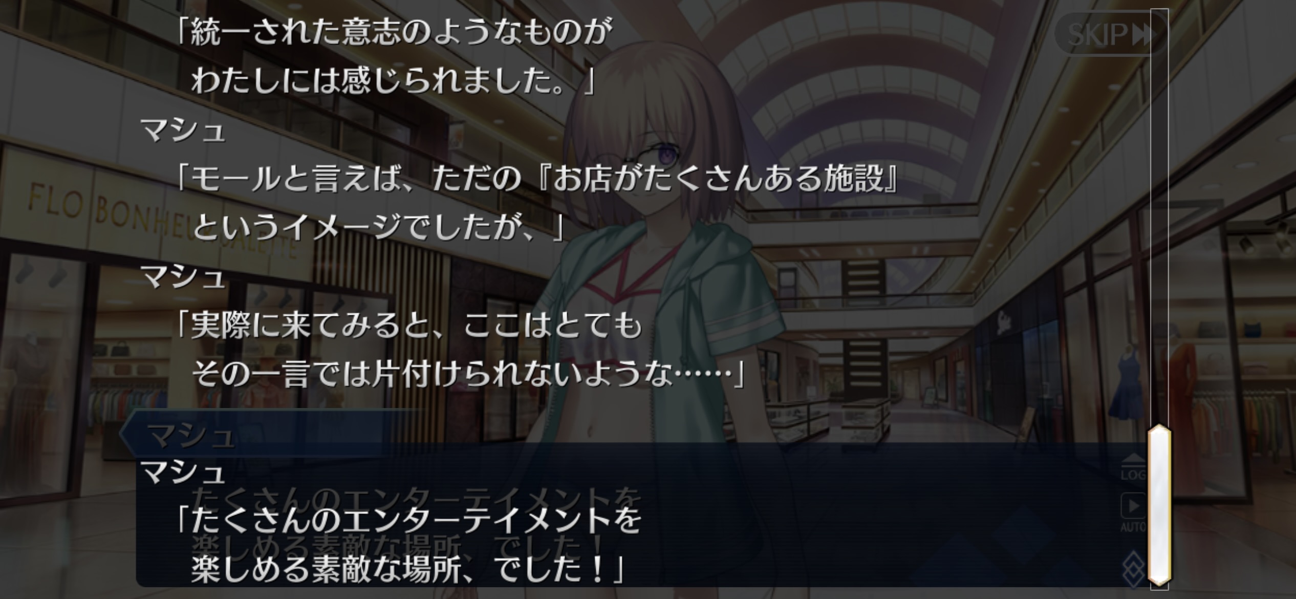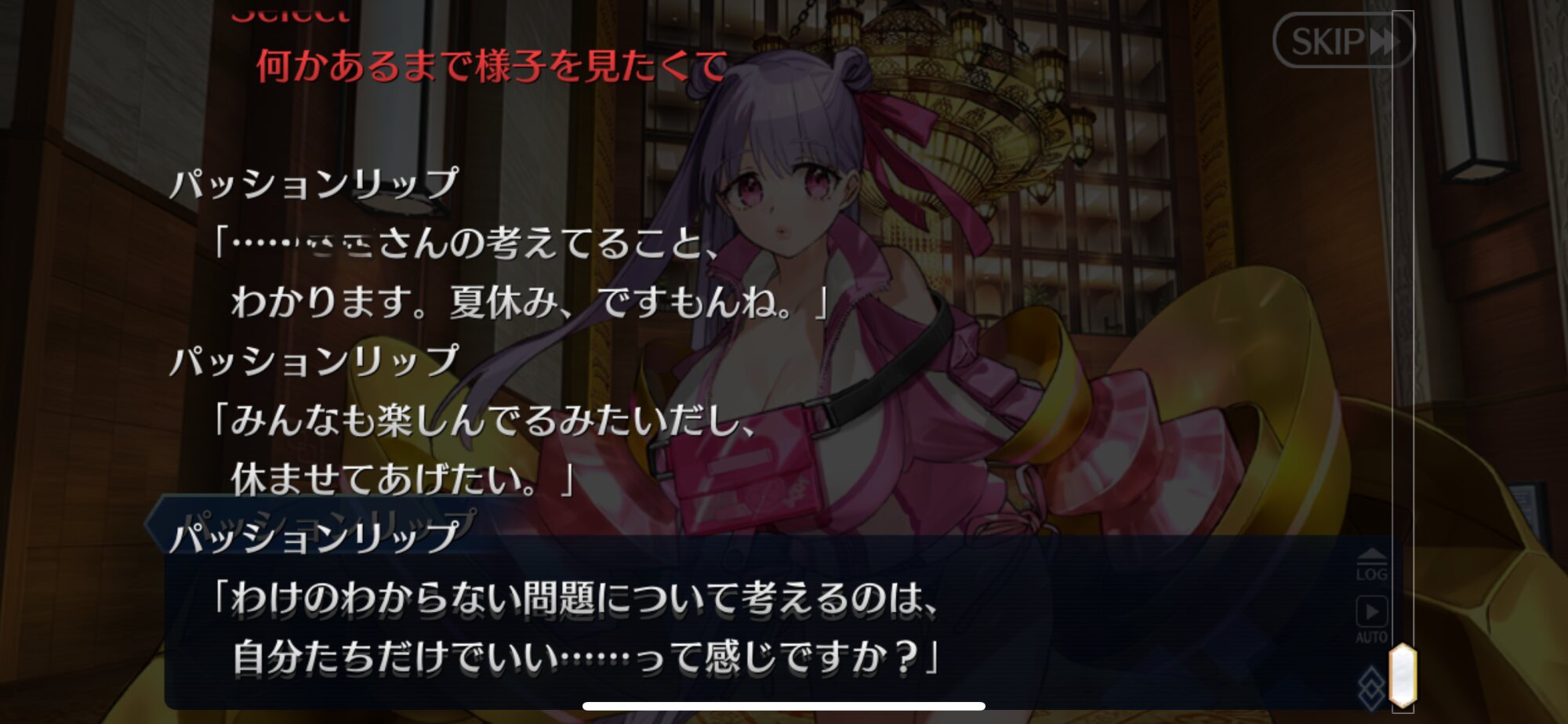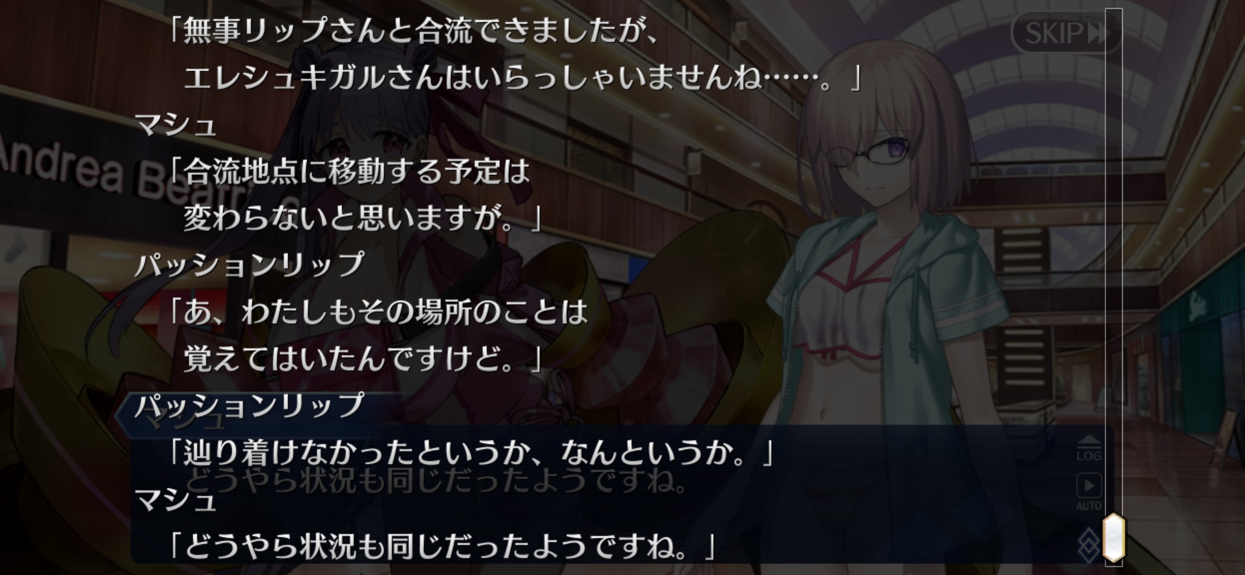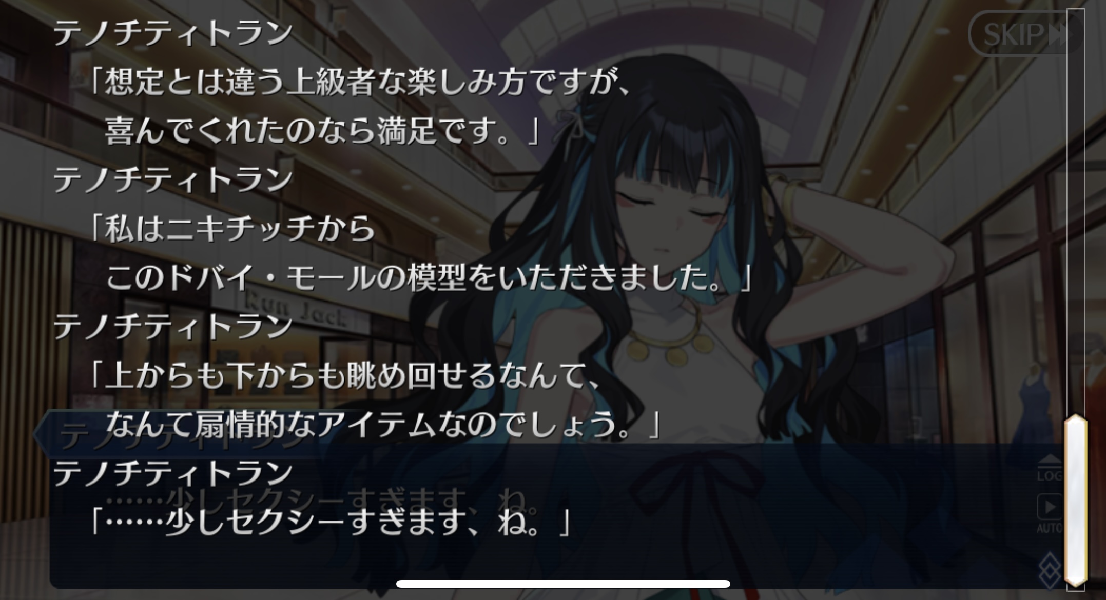 あっちは「新人類を愛でるために現生人類を滅ぼす」だから。さっきカルナさんの夏服開放して「マスターの夏服とお似合い」とか言い出して「おっ、おまっ、お前そういうこと言うの!?」ってなっちゃった