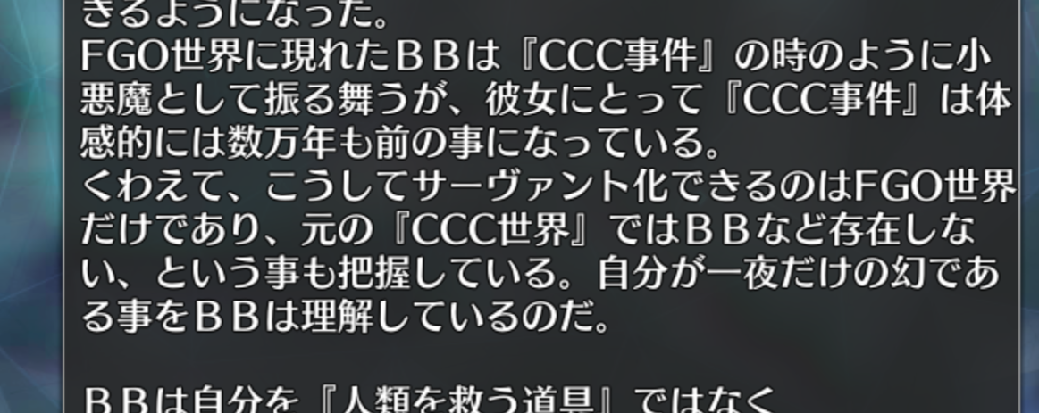 なんかドバイBBはぐだ達の味方かもしれないと思った。つまり、謎行動なBBリリィが怪しい…?それともあとクラスではなく本質が大事ってのも後々響いてきそうよね