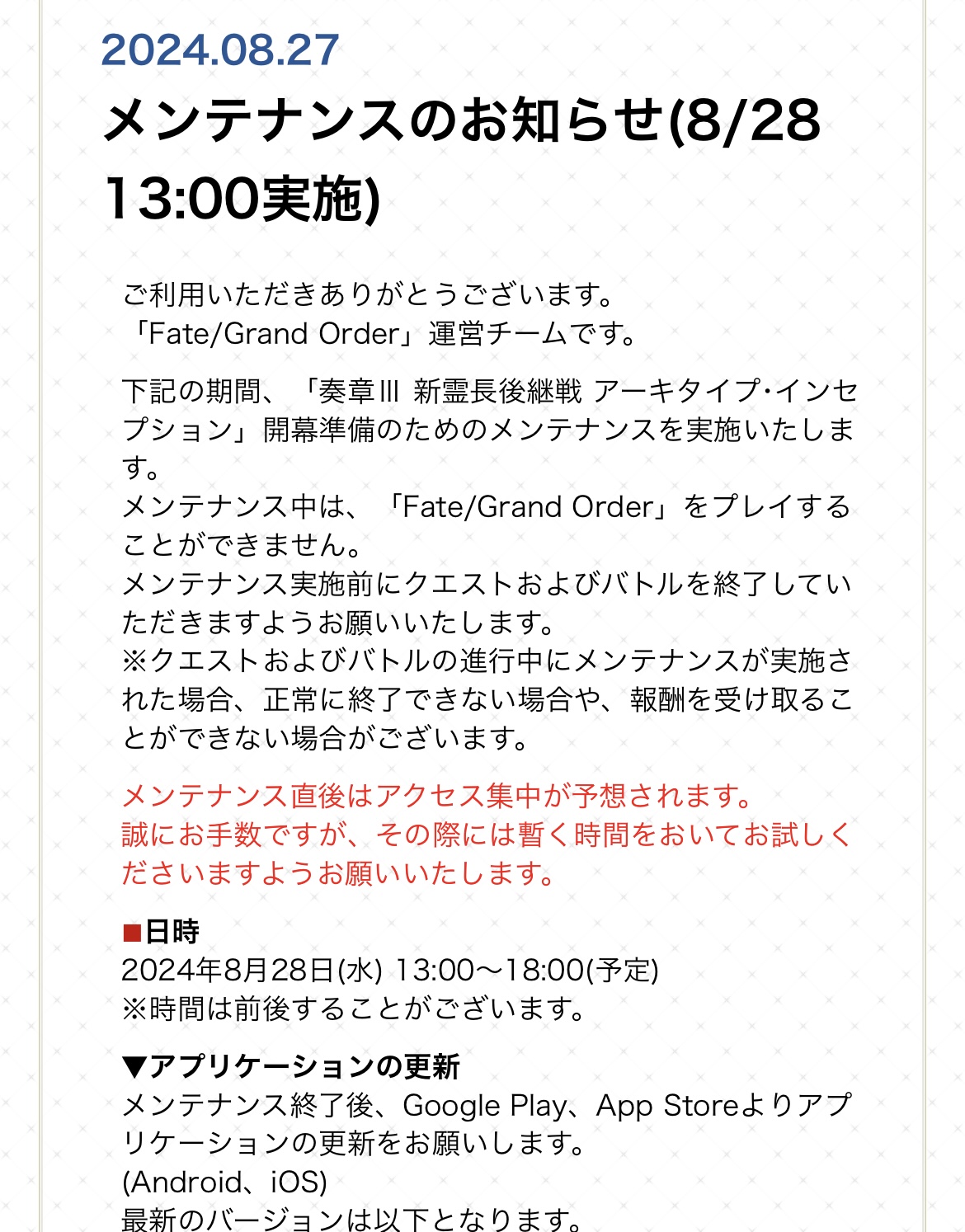R18関連話題、よくてよ無しのガチャ結果、実装から二週間以内のシナリオ及び開催期間中のイベント内容、進行度依存の報酬、最終再臨や霊衣解放の画像や話題は専用スレにてお願いします。