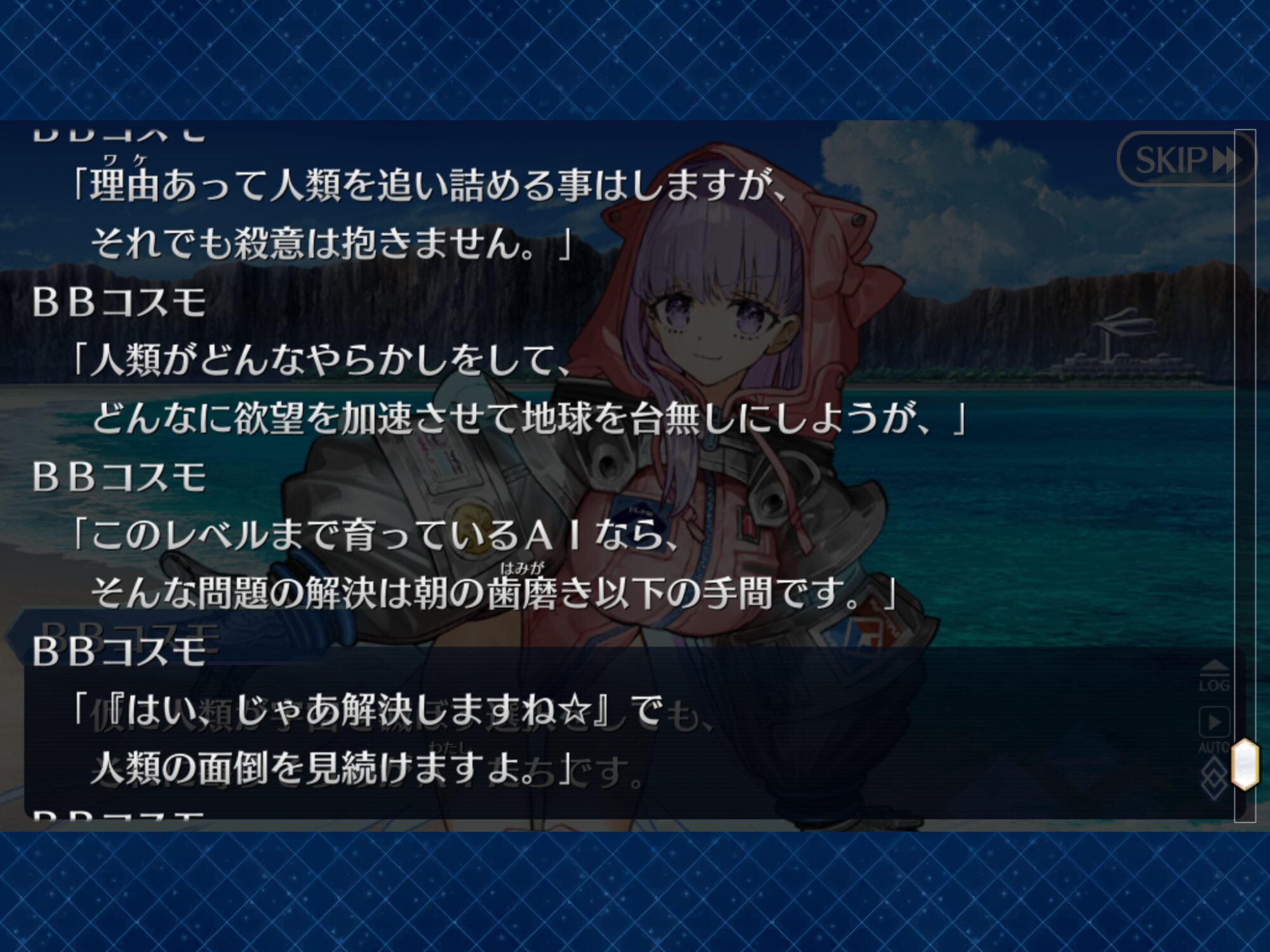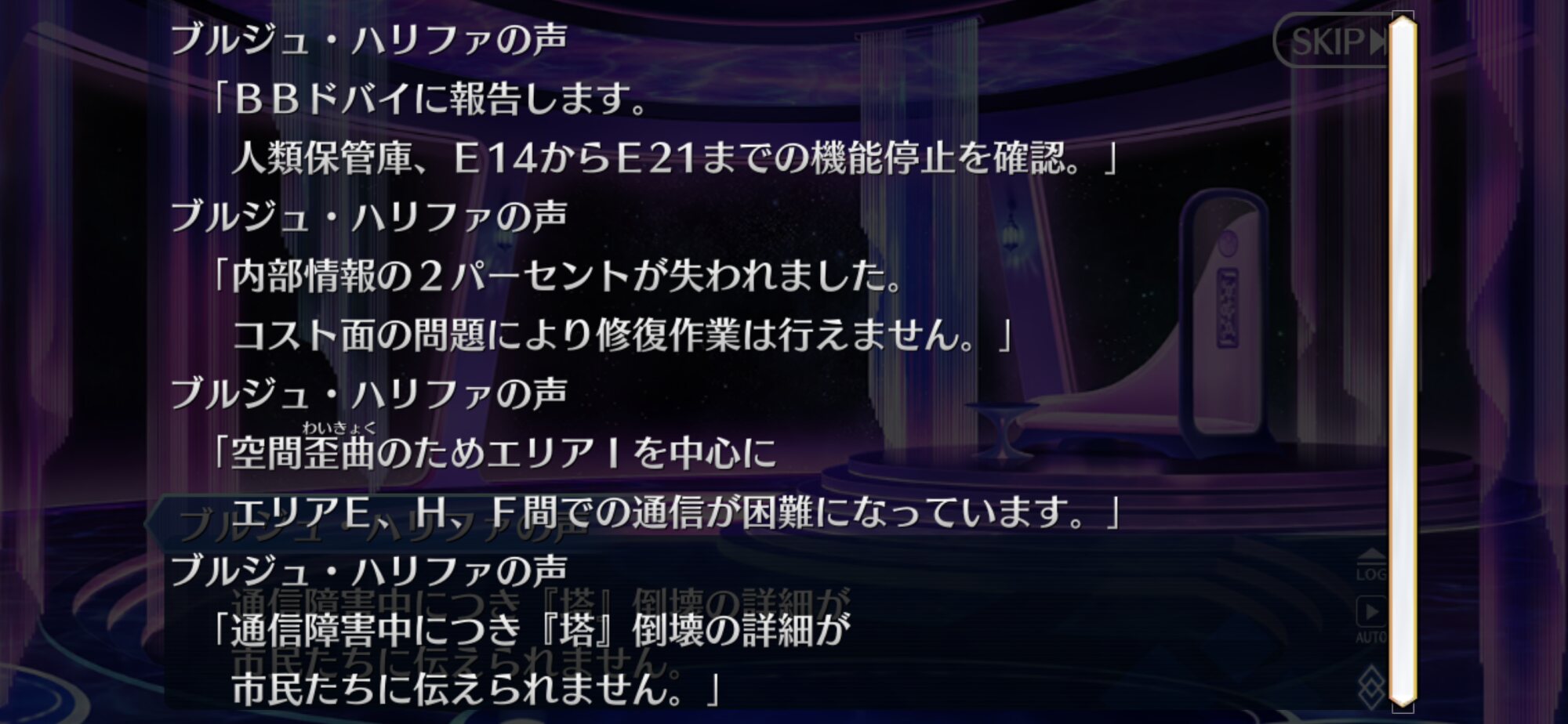 「少し休んだら?これでしばらくはひとりになれる」「シャットダウンは無理でもせめてスリープしないと処理速度が落ちてる」(BBDにラスボス7人相手にしてたら当たり前だから大丈夫と言われ)「じゃあ最後までここにいるよ。ひとりになりたくないようだから」