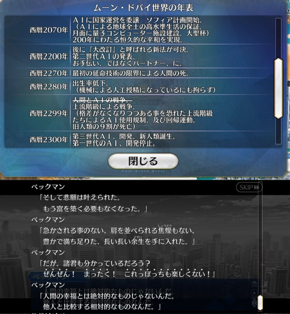 西暦300年に来る朱い月のブリュンスタッドに対抗するためにゼルレッチがマナのある平行世界を証明して2000年の延命したとする説なんだけど、今回の人類も2299年に一回滅んでるし、このあたりも関連してくる気がしてきた。