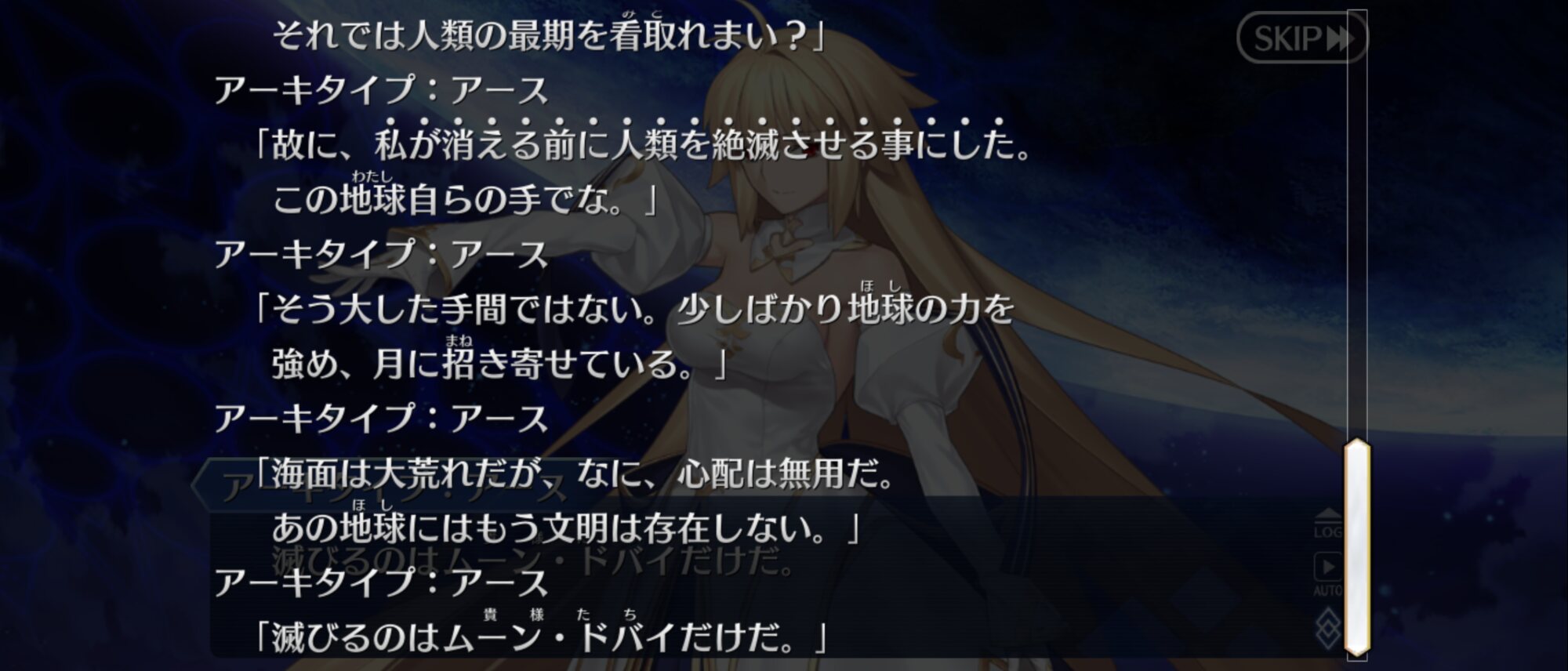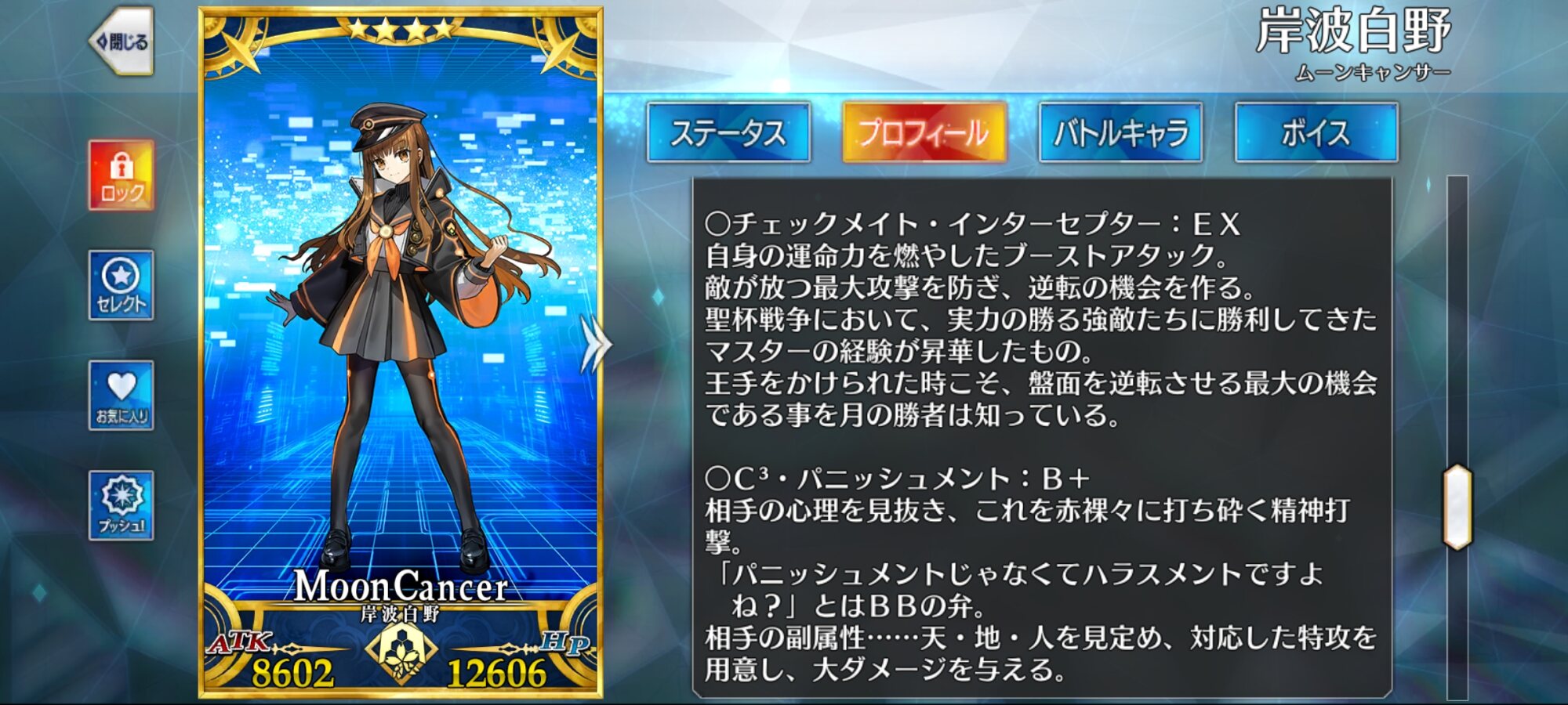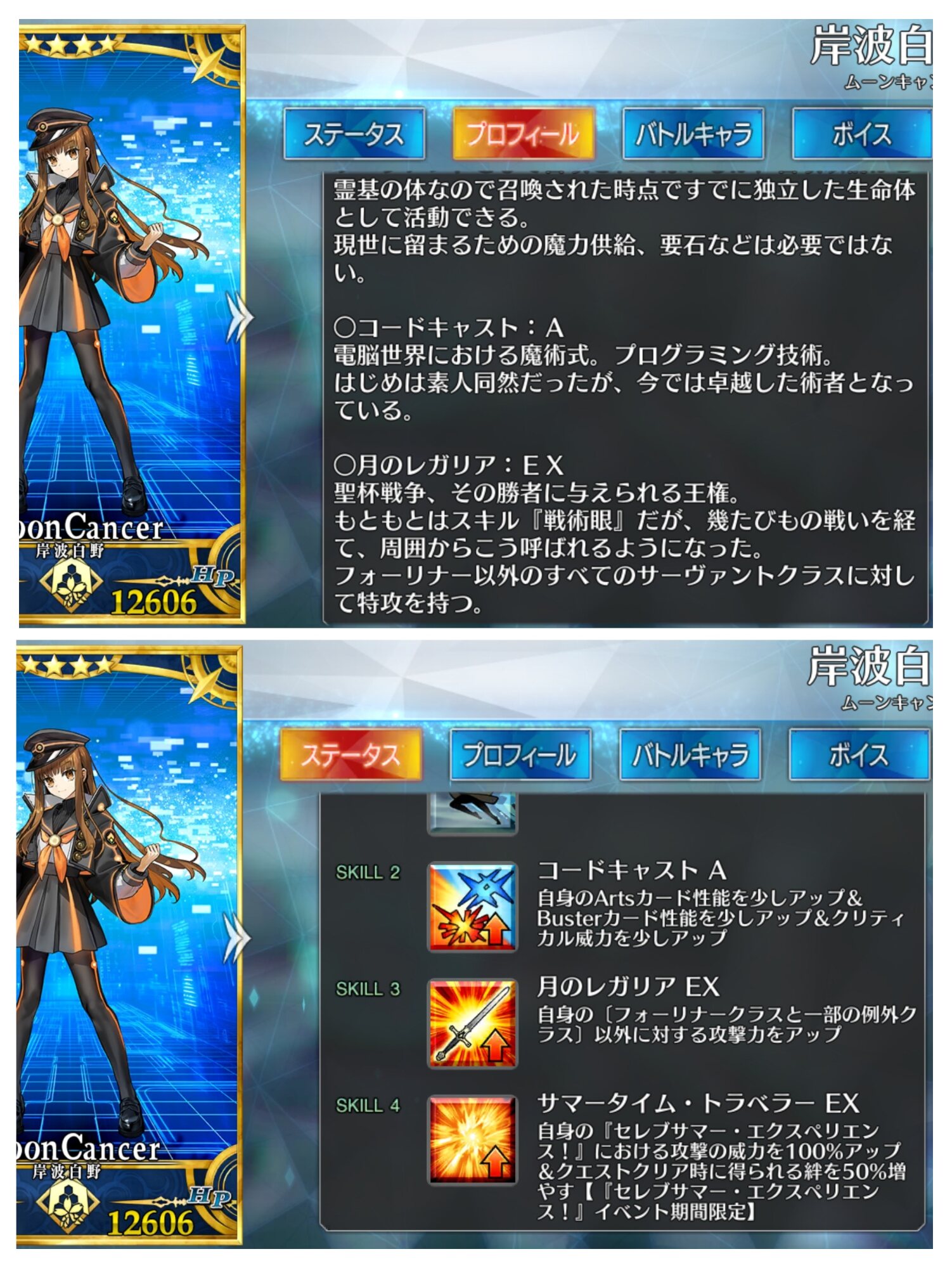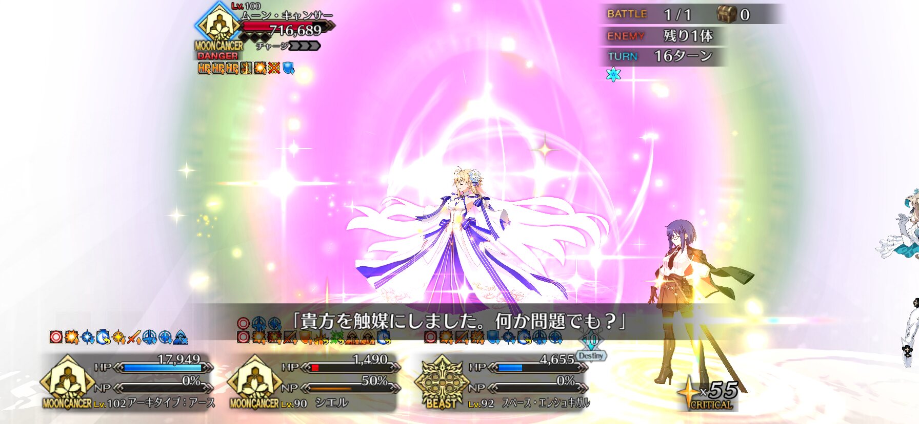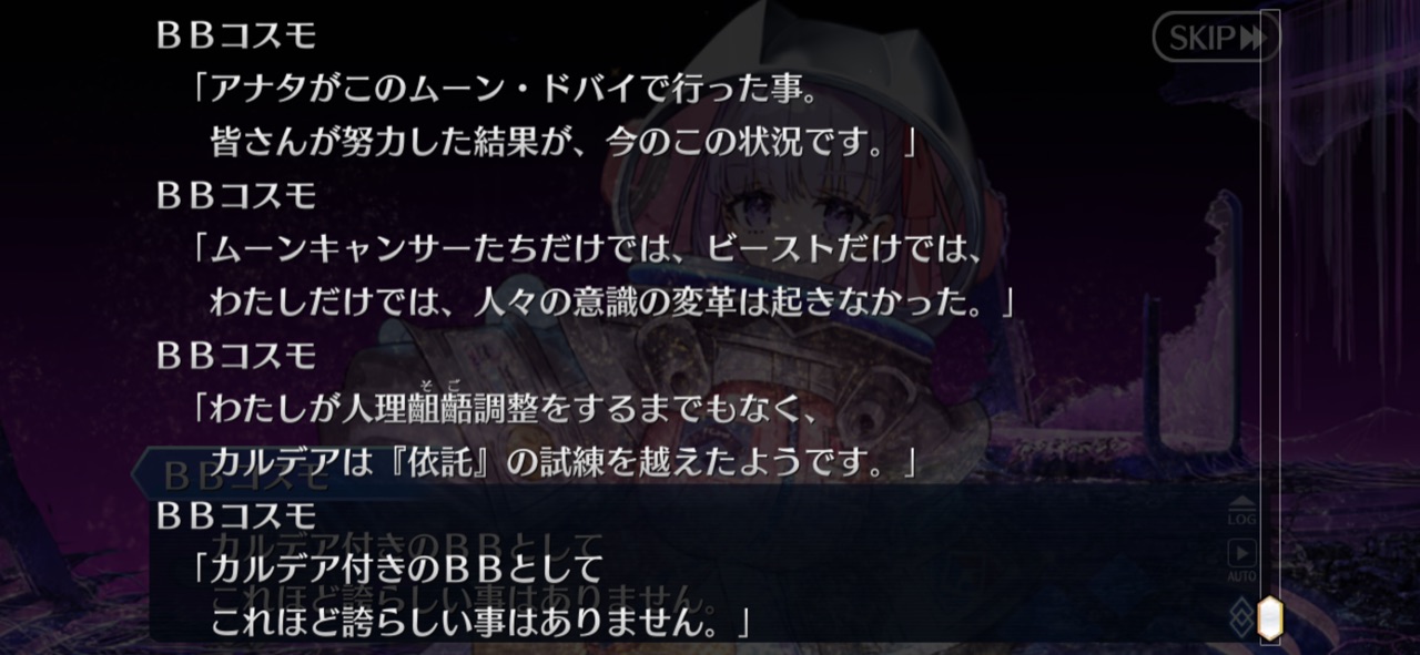 我々も宇宙の一員であり対等であると表明したりすんのかな今まで主人公はその章のクラスを疑似体験してたが、ムーンキャンサーはしないのかと思ってたラストの召喚でびっくらこいた