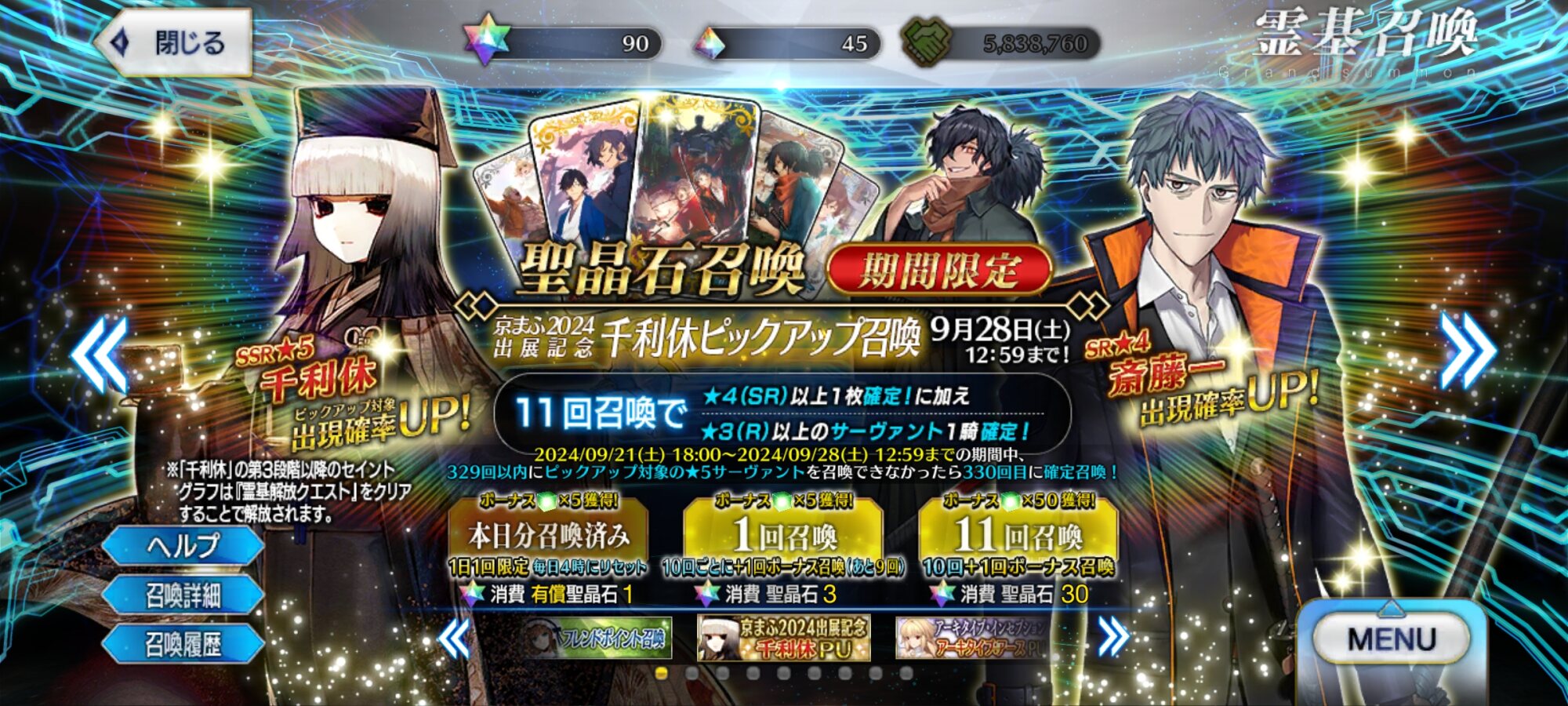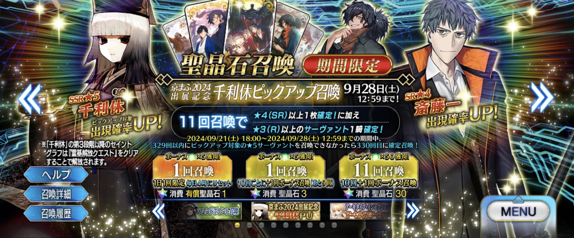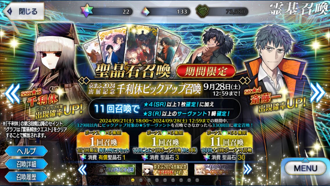 まさか奏章スレに利休さんのスクショを置いたら急にピックアップが来るとは…もっと京都ゆかりのサーヴァントとか実装されないかしら