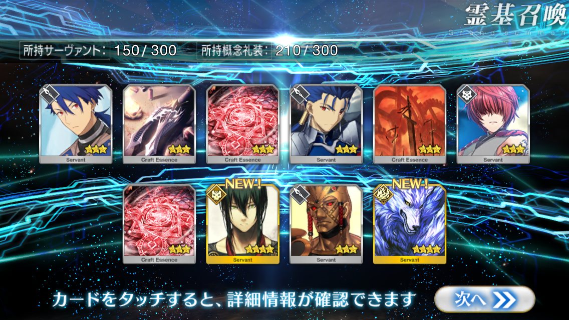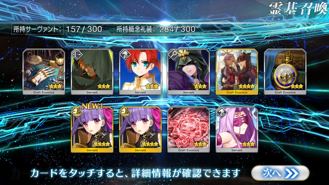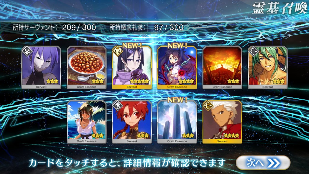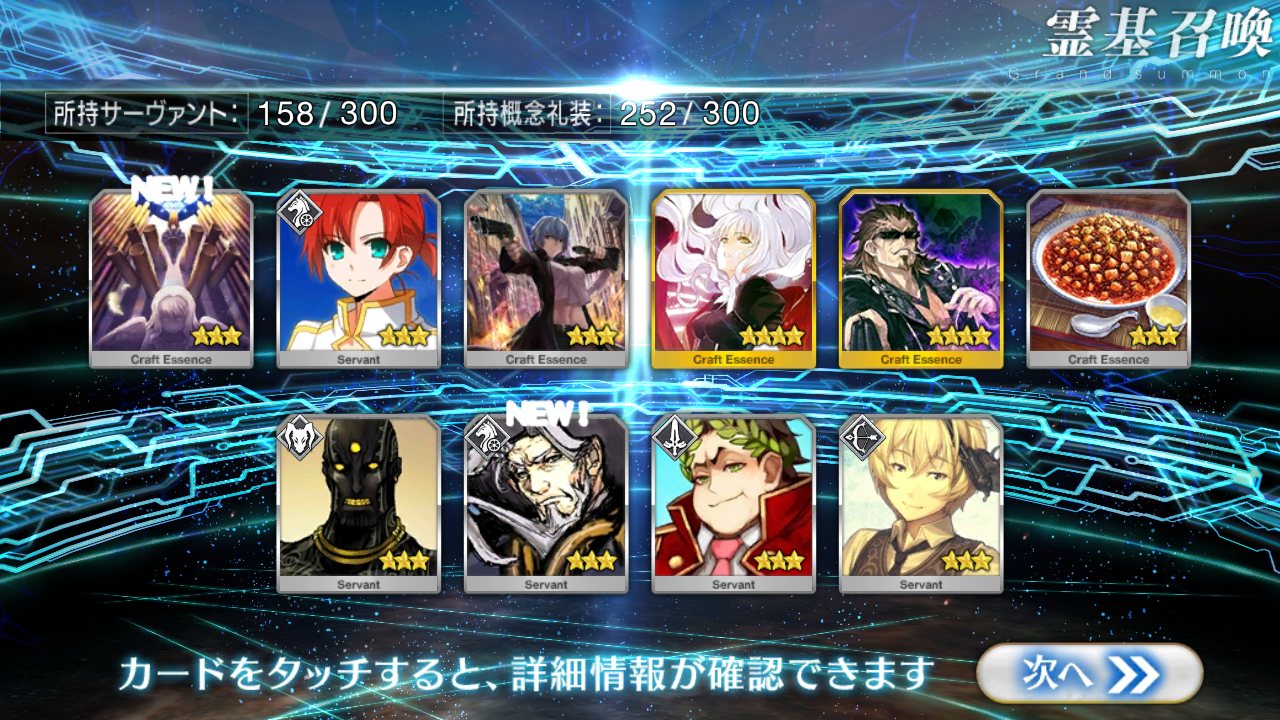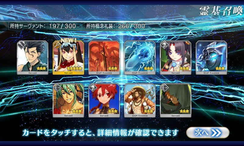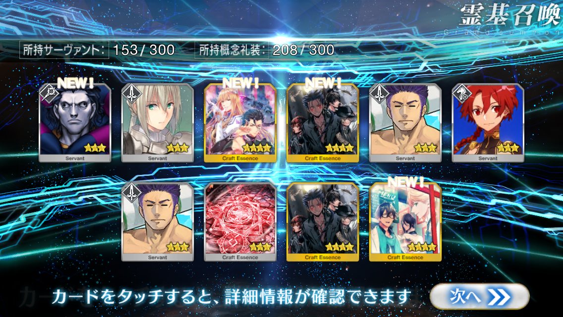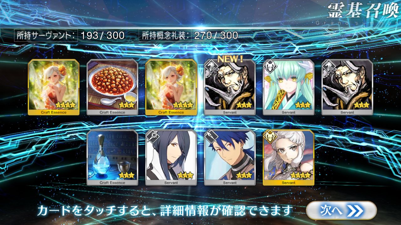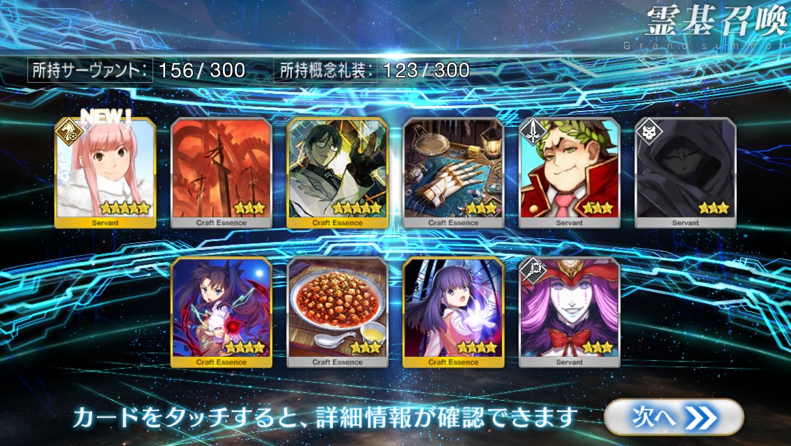 すり抜けてくれたのはずっと欲しかったジークフリート、あと三蔵は宝具を2にできた。