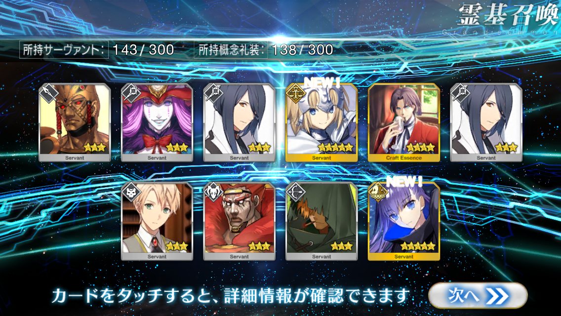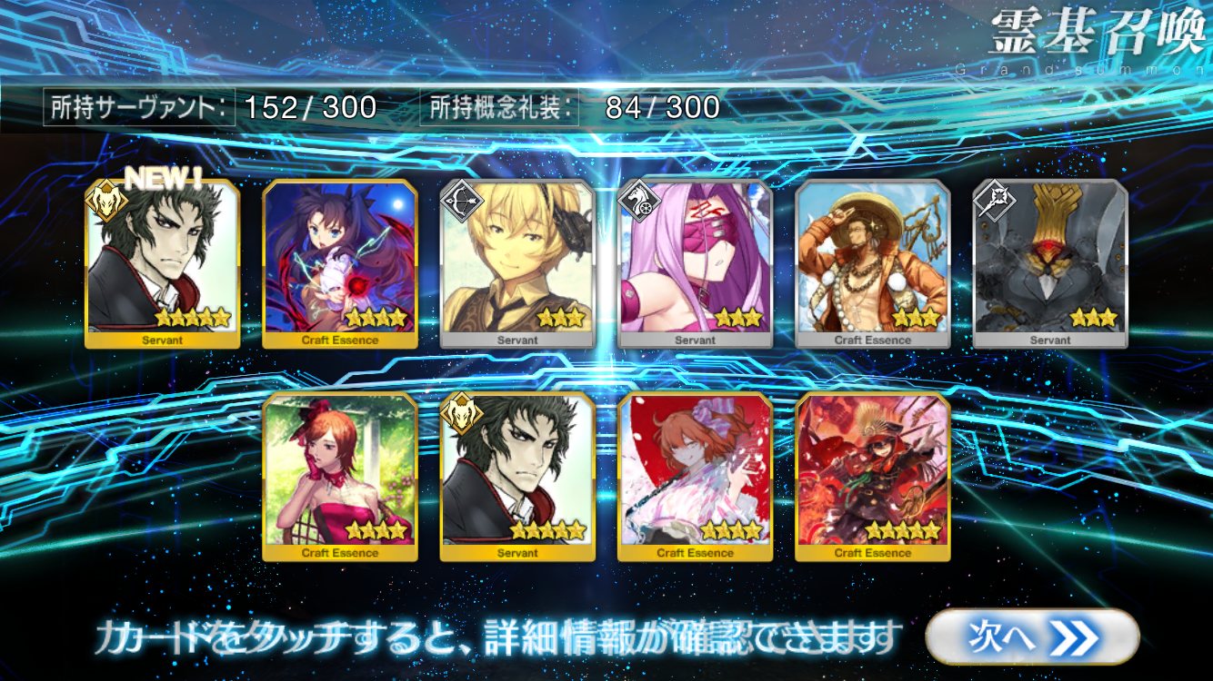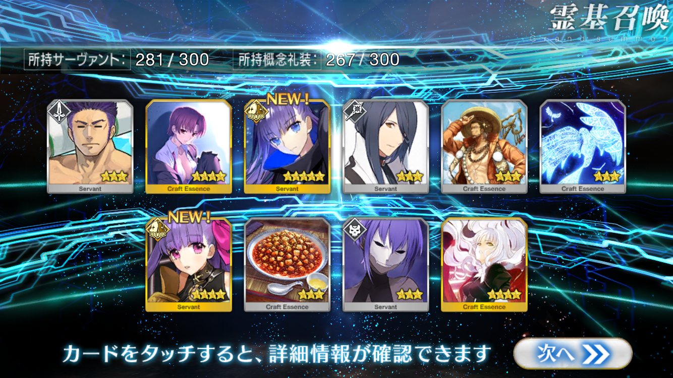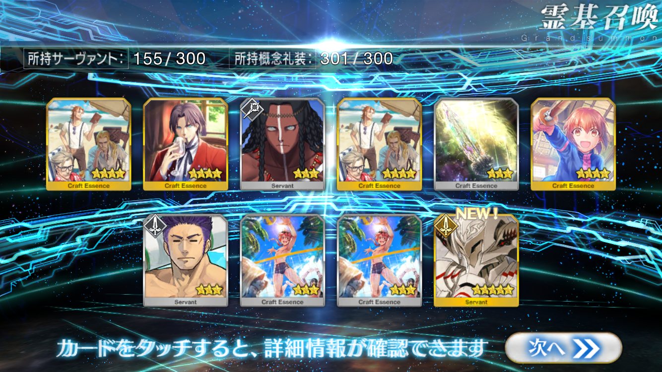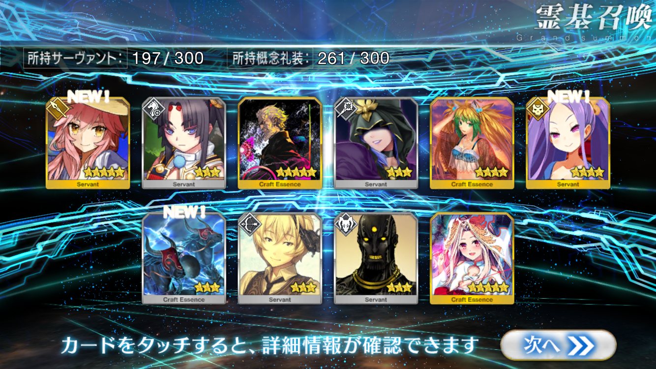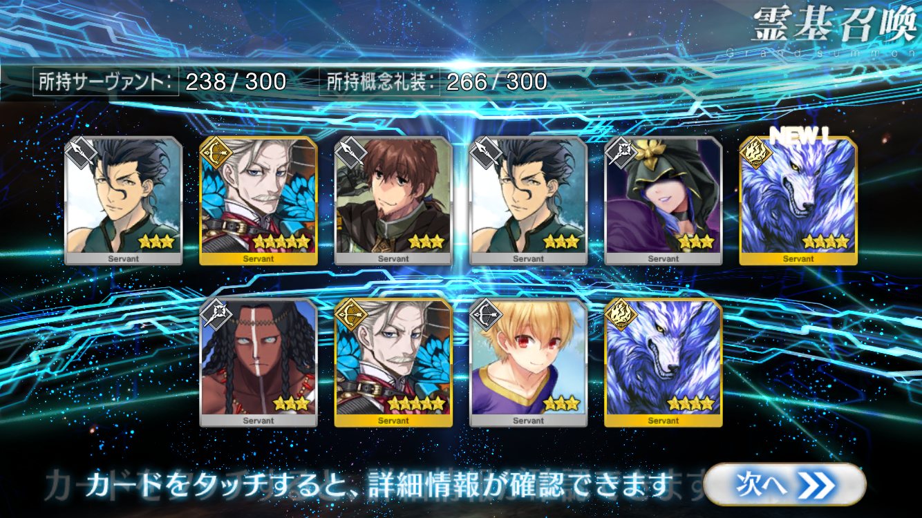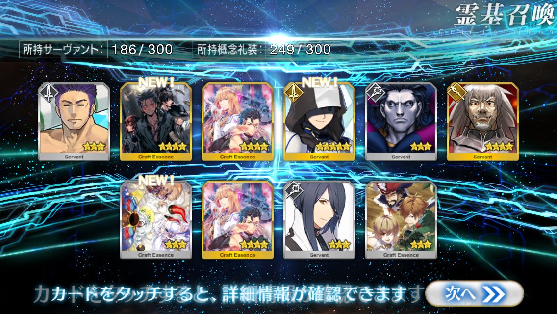 すり抜けてくれたのはずっと欲しかったジークフリート、あと三蔵は宝具を2にできた。