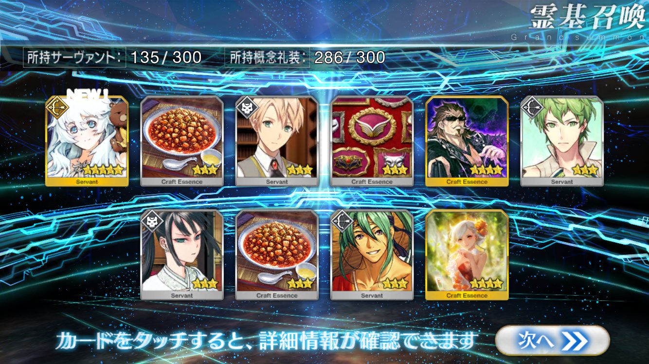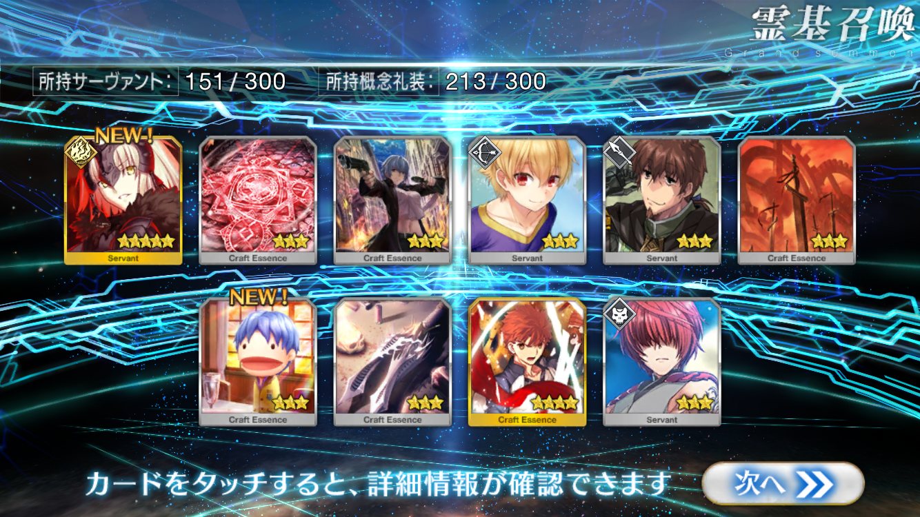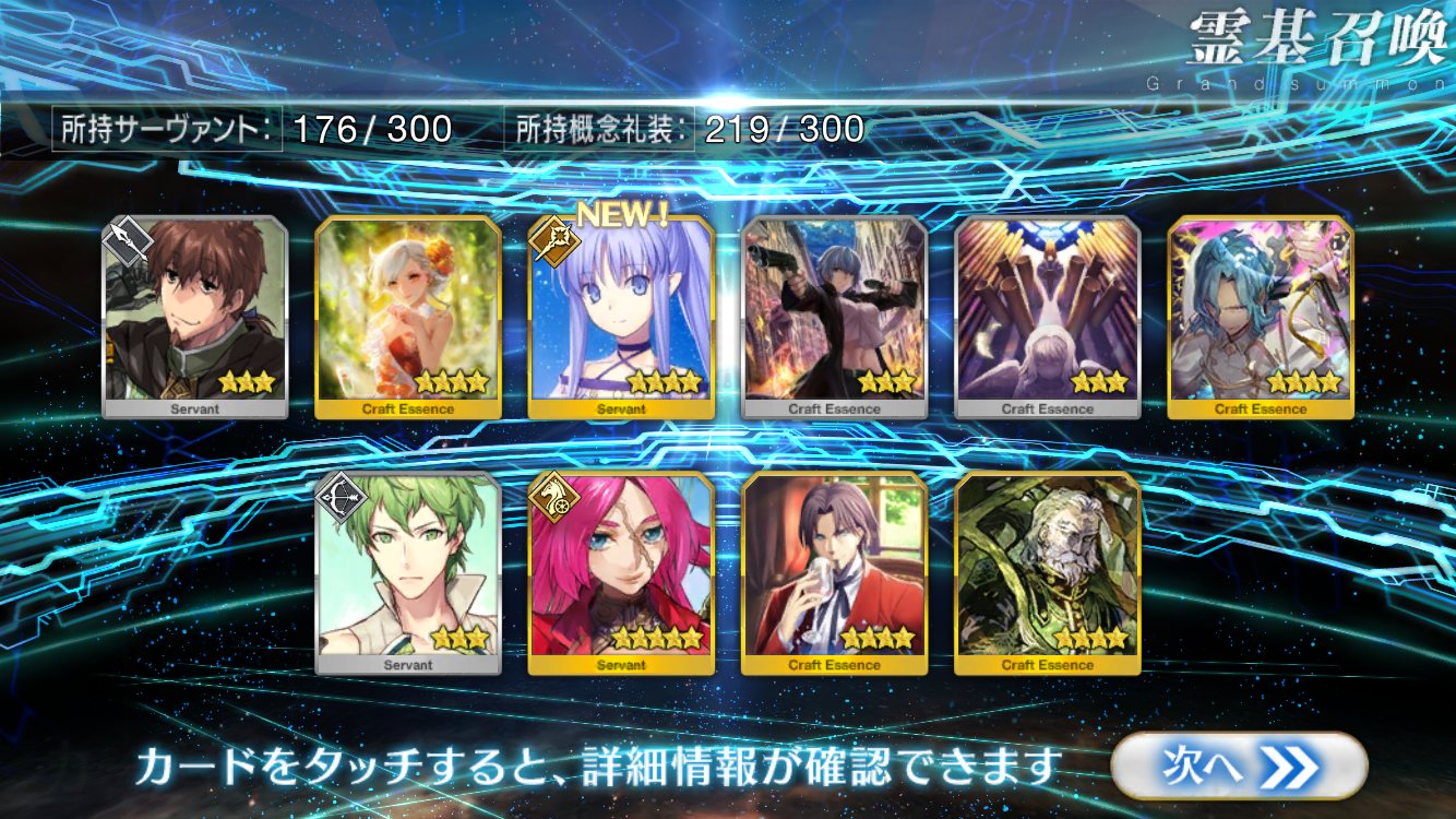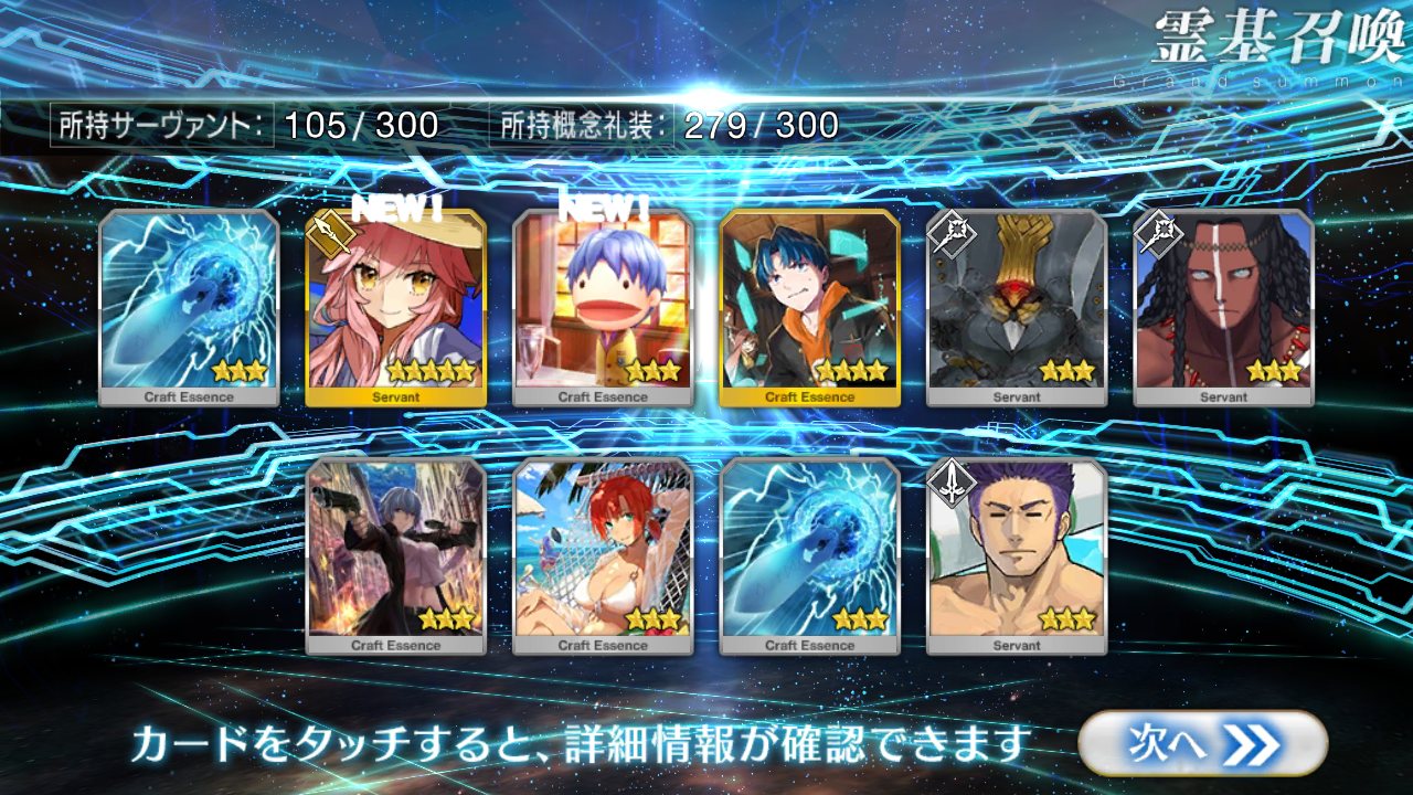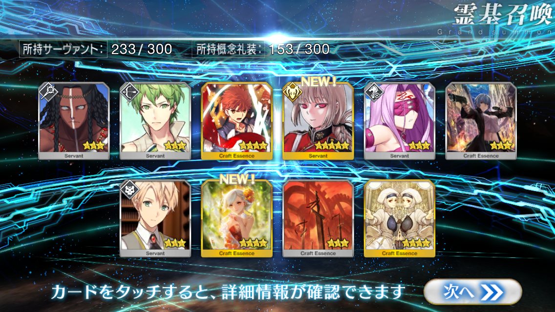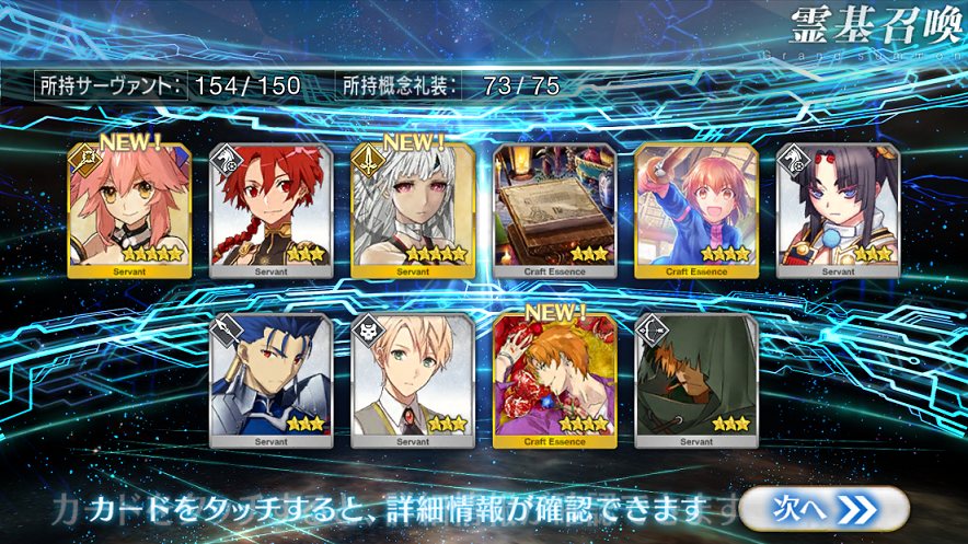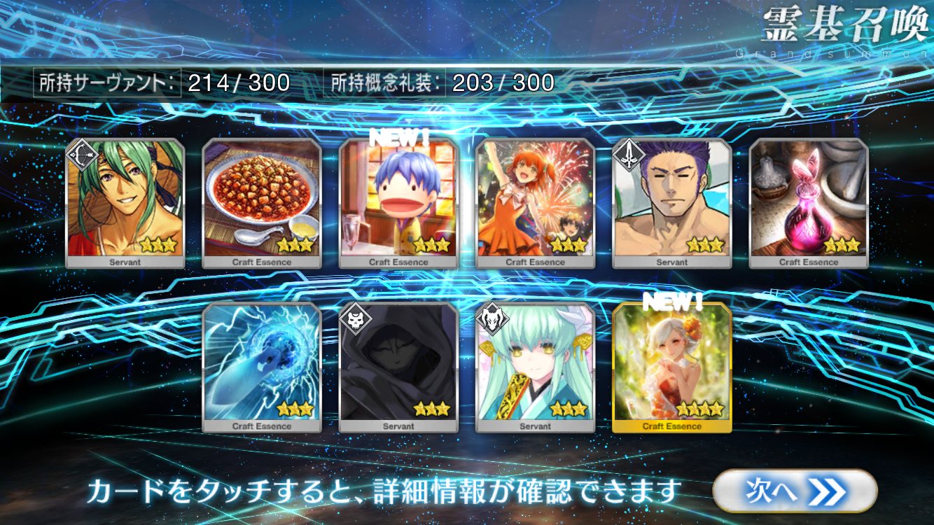 すり抜けてくれたのはずっと欲しかったジークフリート、あと三蔵は宝具を2にできた。