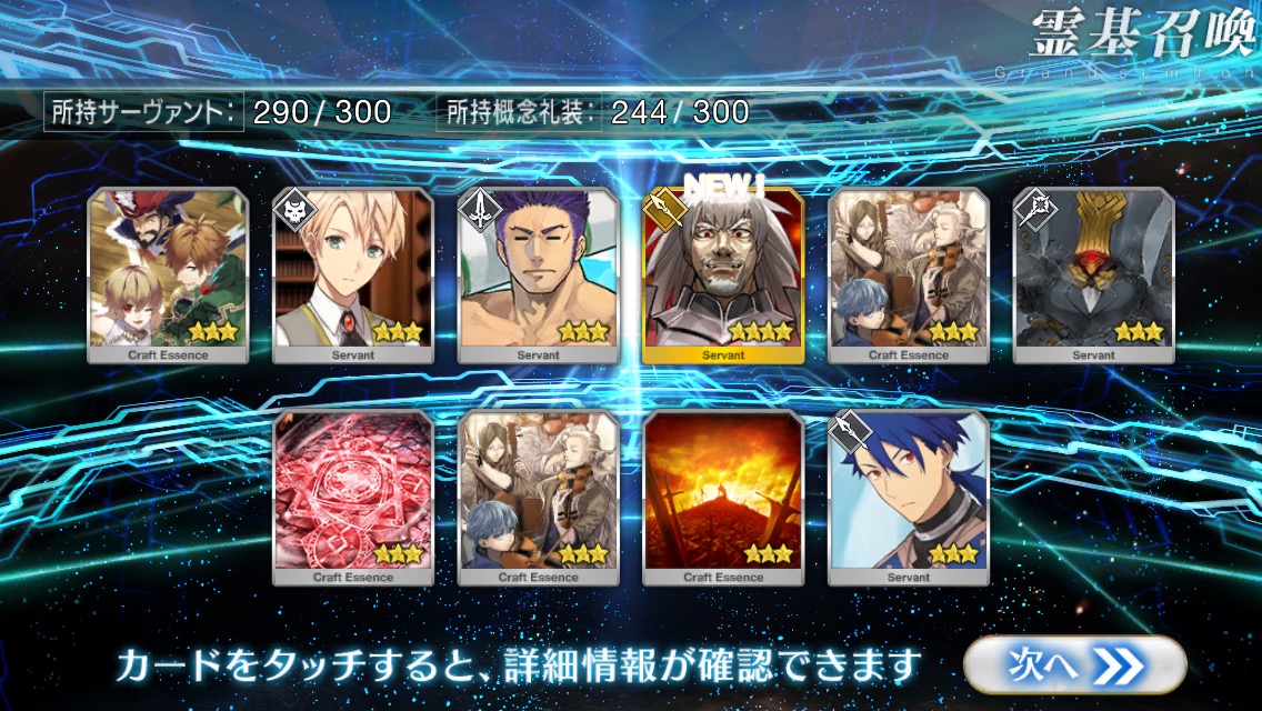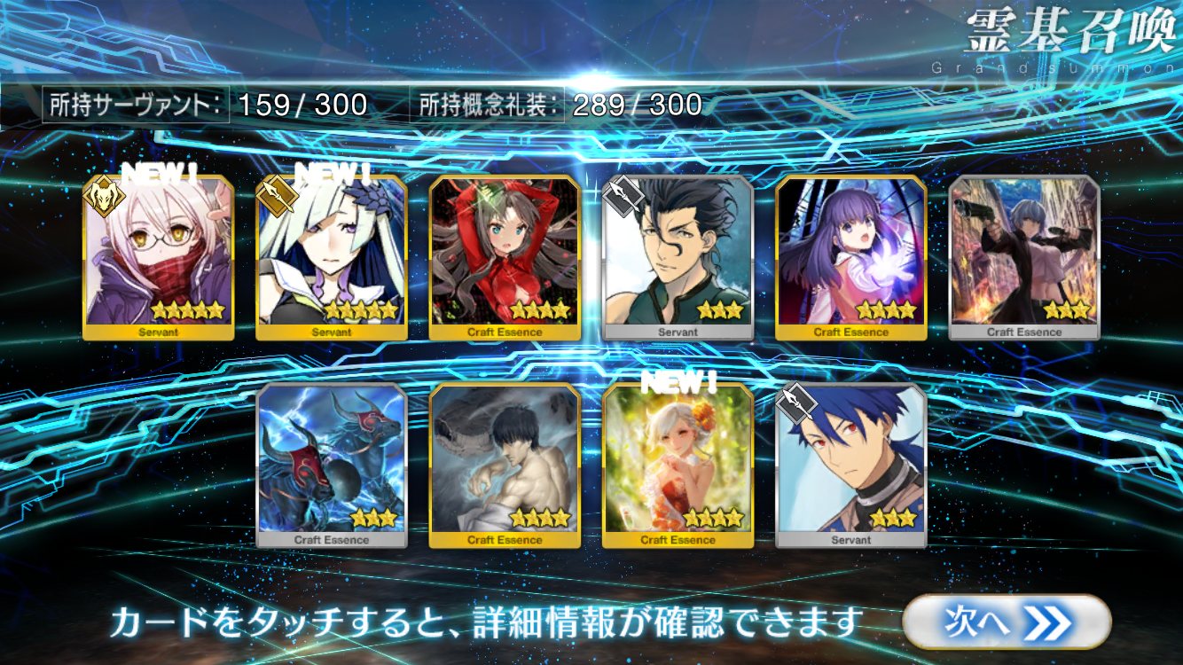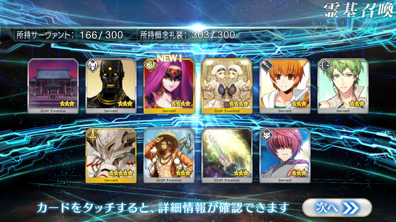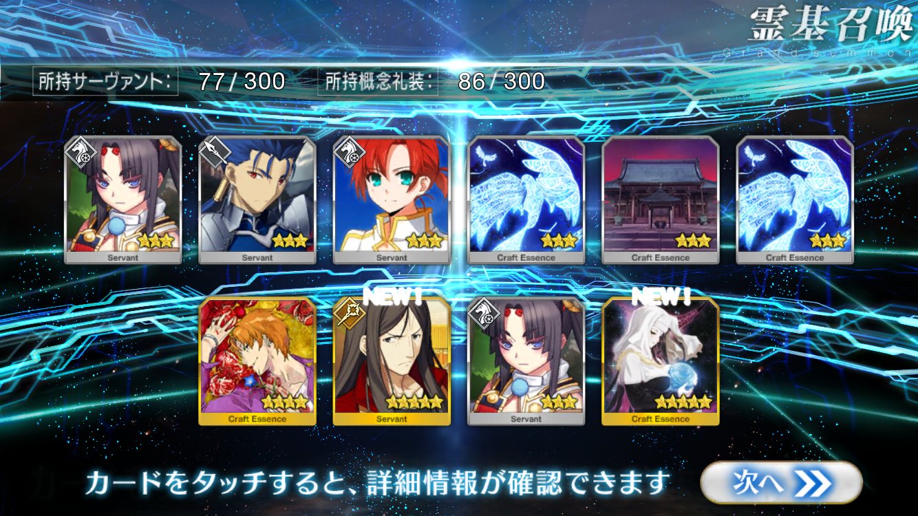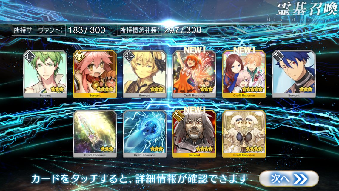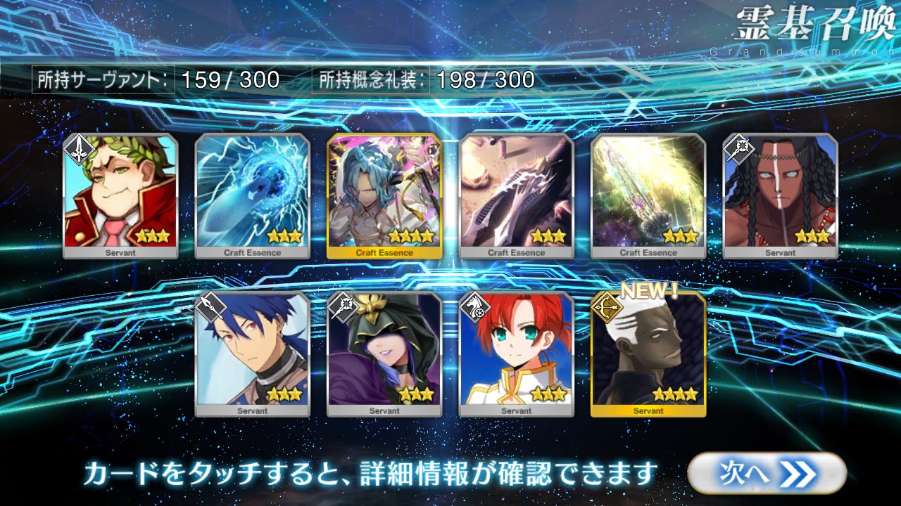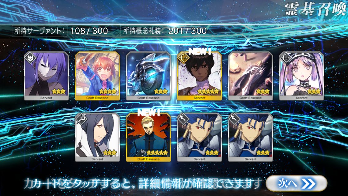 すり抜けてくれたのはずっと欲しかったジークフリート、あと三蔵は宝具を2にできた。