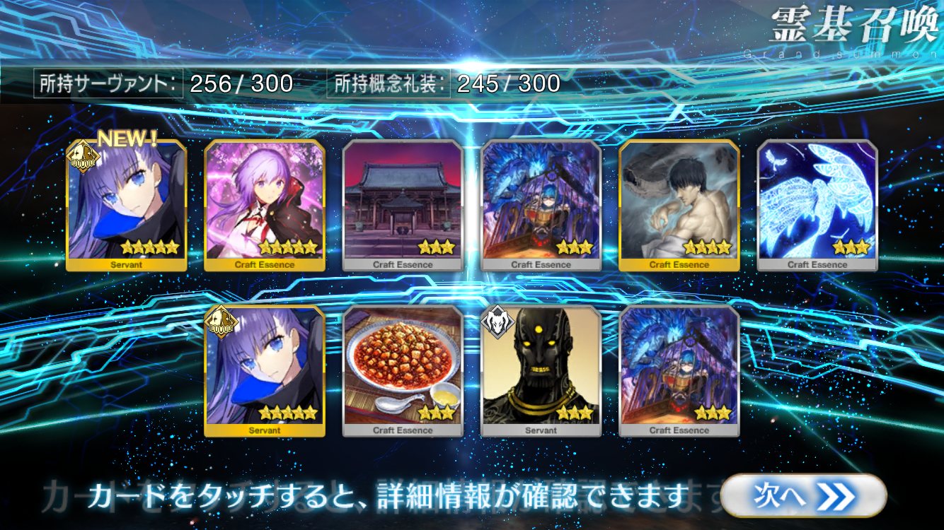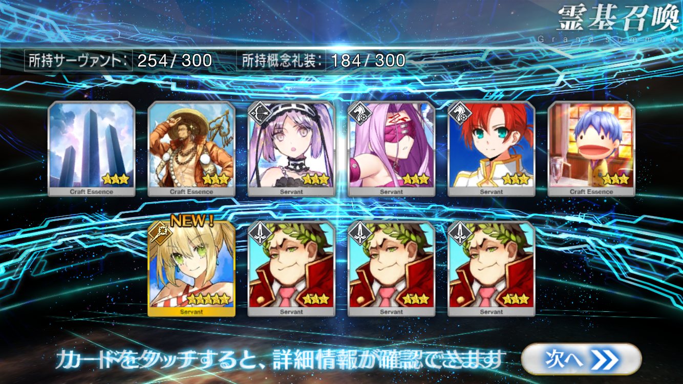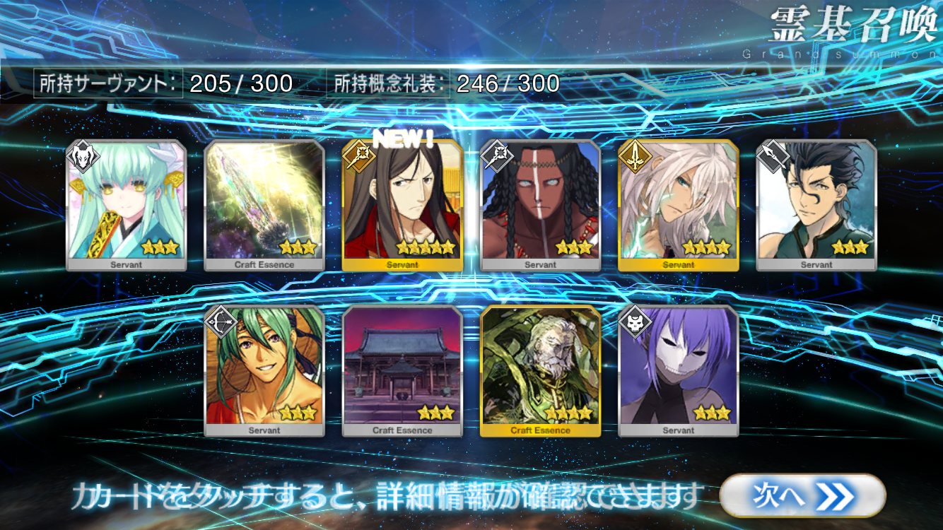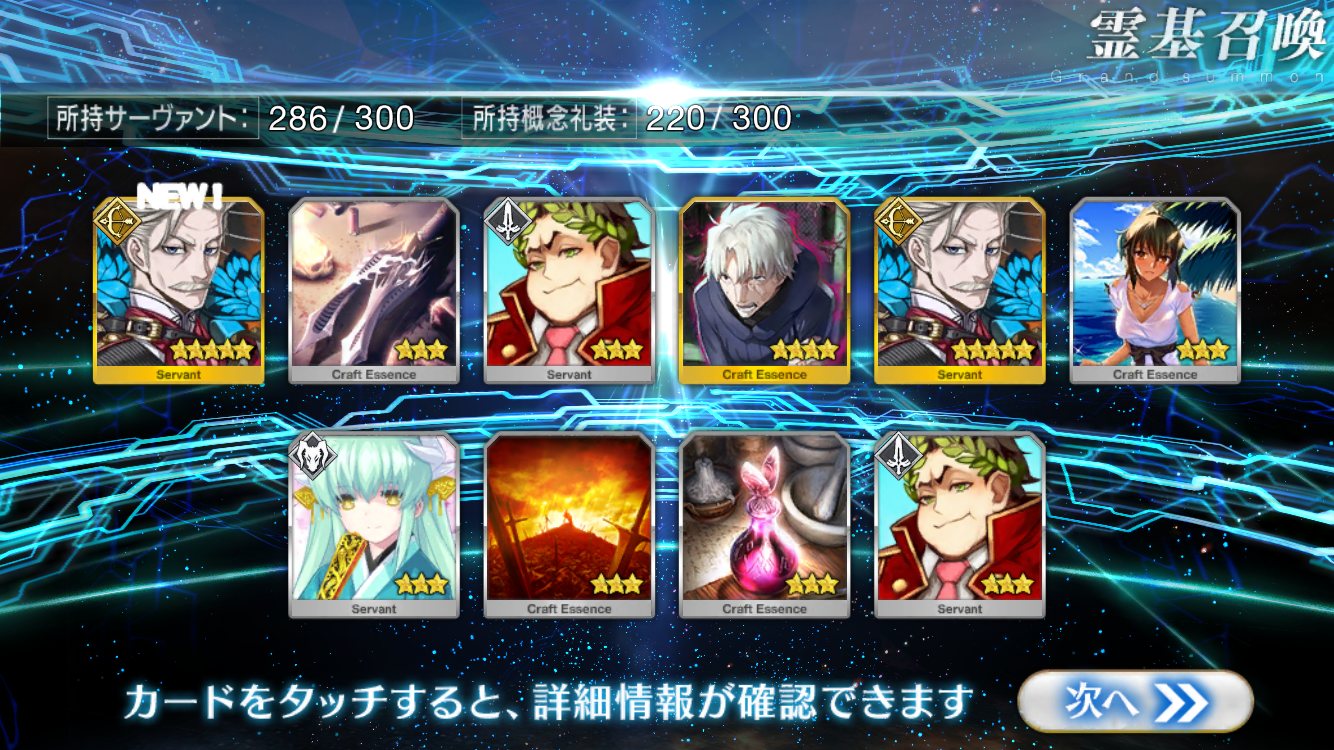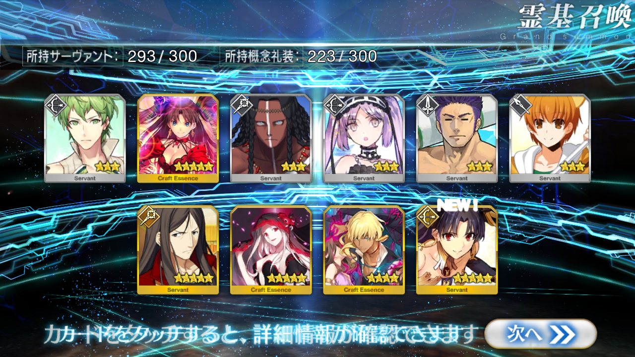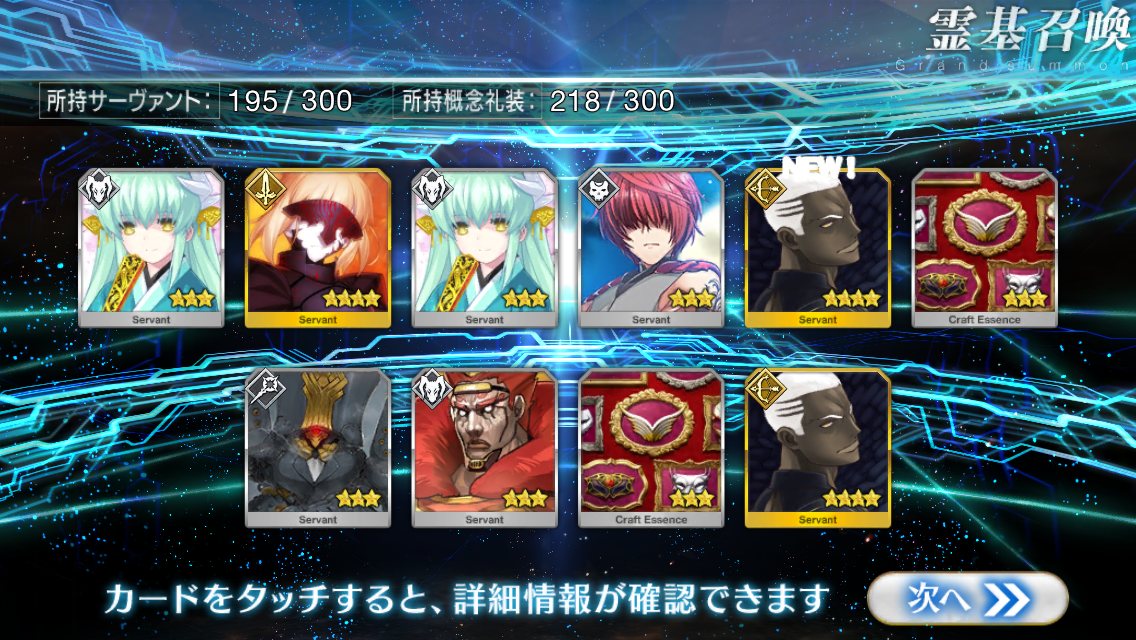 すり抜けてくれたのはずっと欲しかったジークフリート、あと三蔵は宝具を2にできた。