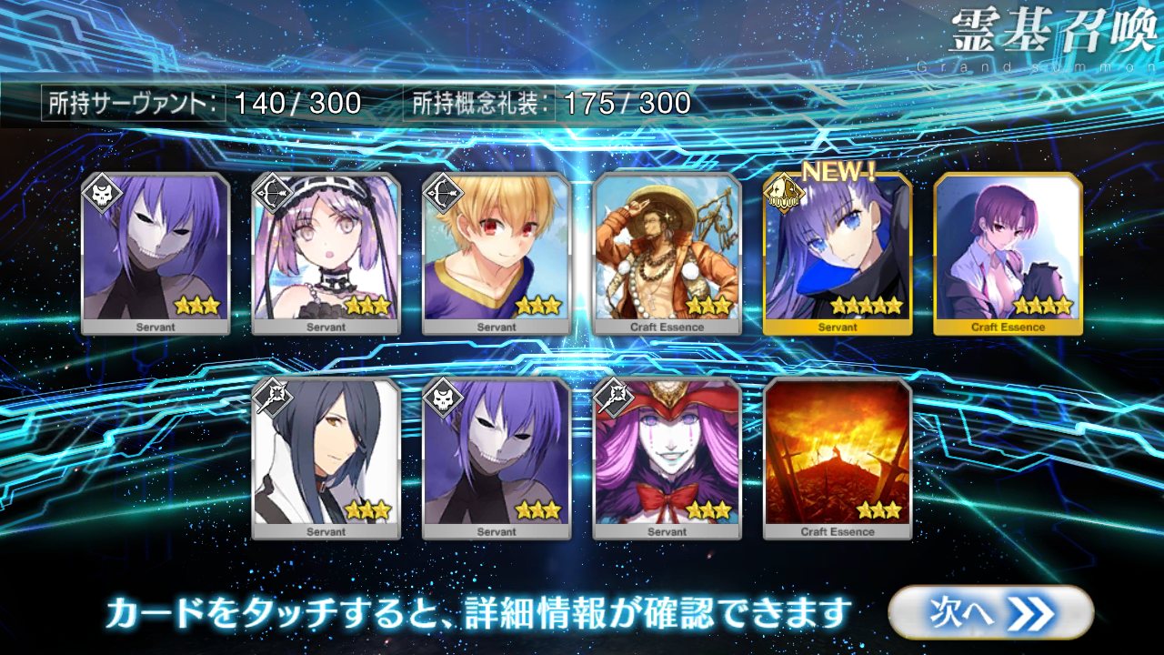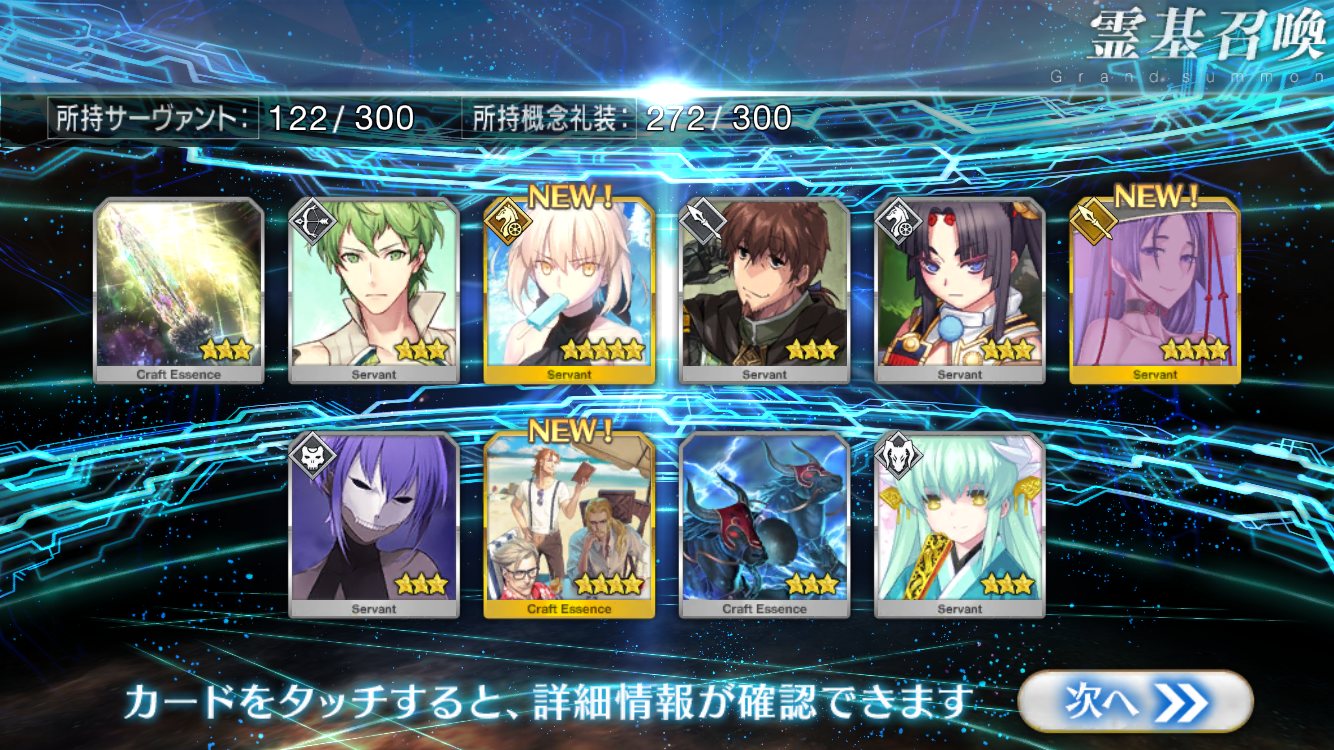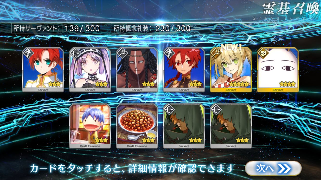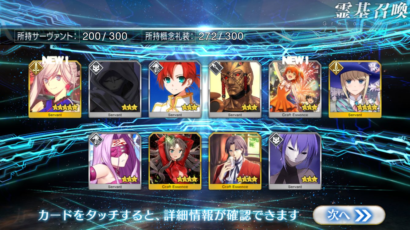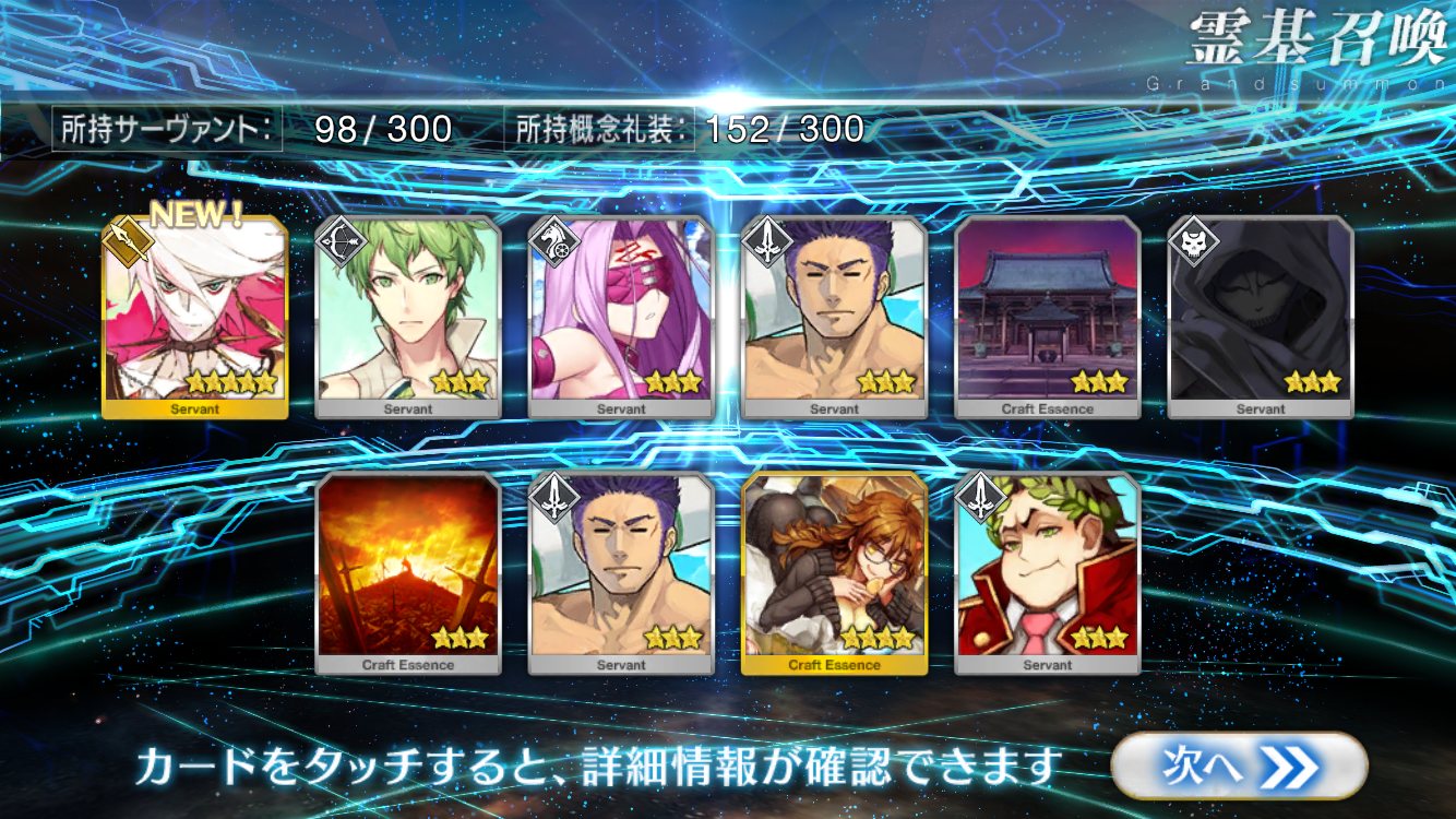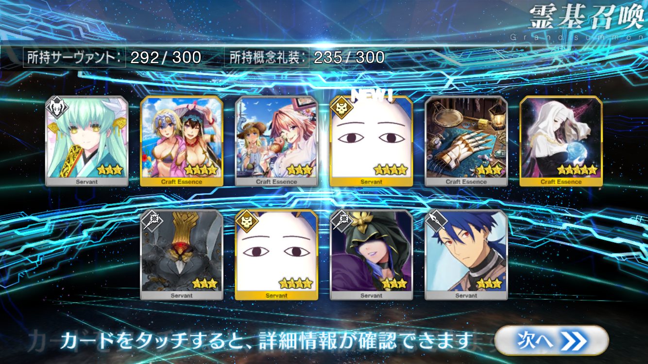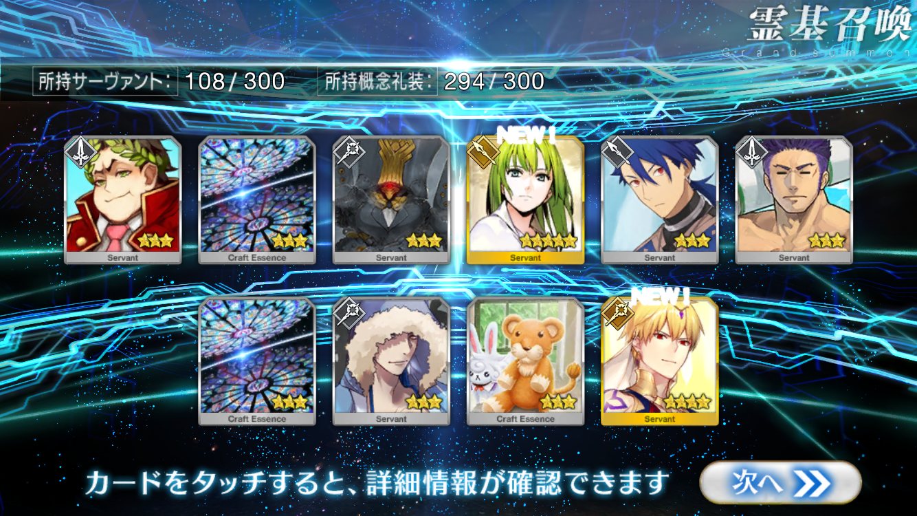 すり抜けてくれたのはずっと欲しかったジークフリート、あと三蔵は宝具を2にできた。