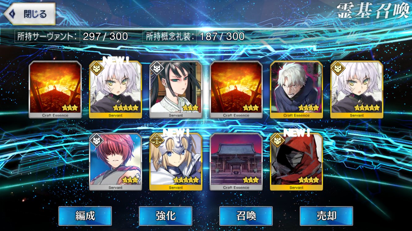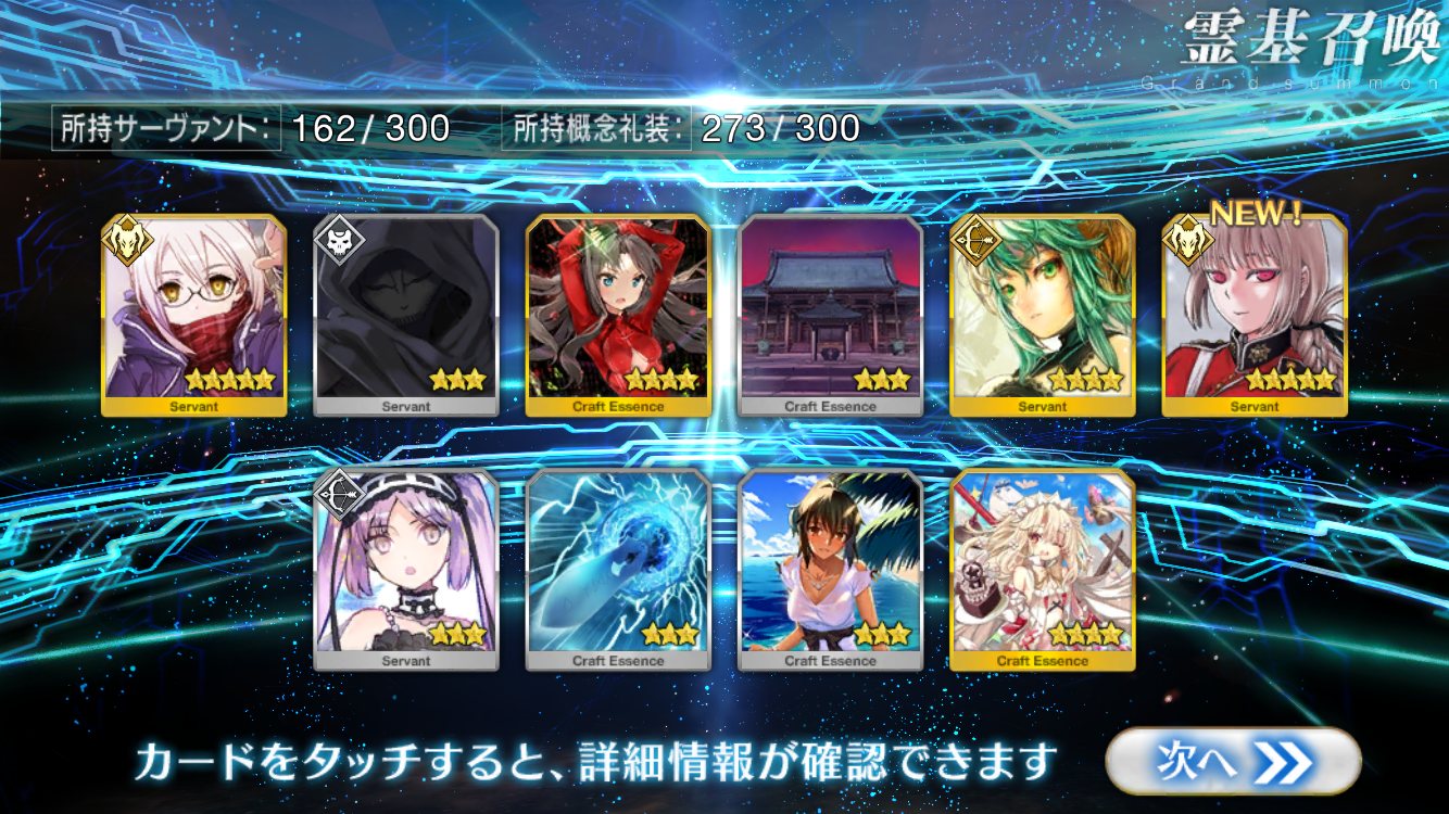 去年は礼装目当てでおんなじ数回してマリーとマルタさん二人ずつだったからそれより酷い。残ってた無料石で10連×5回。