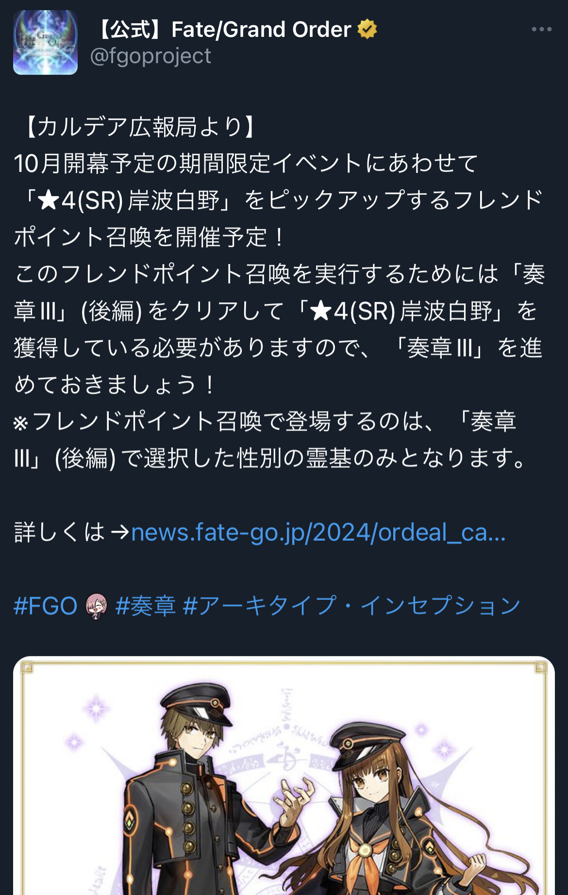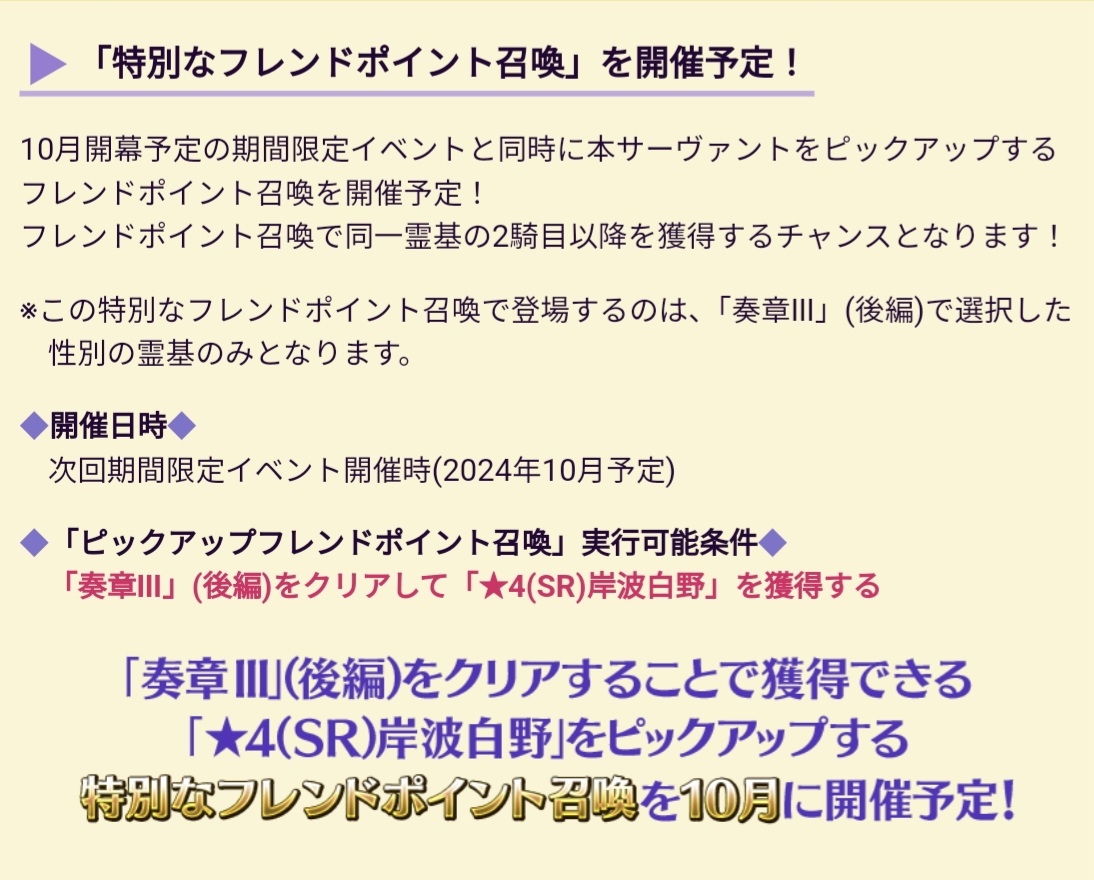 ※フレンドポイント召喚で登場するのは、「奏章Ⅲ」(後編)で選択した性別の霊基のみとなります。