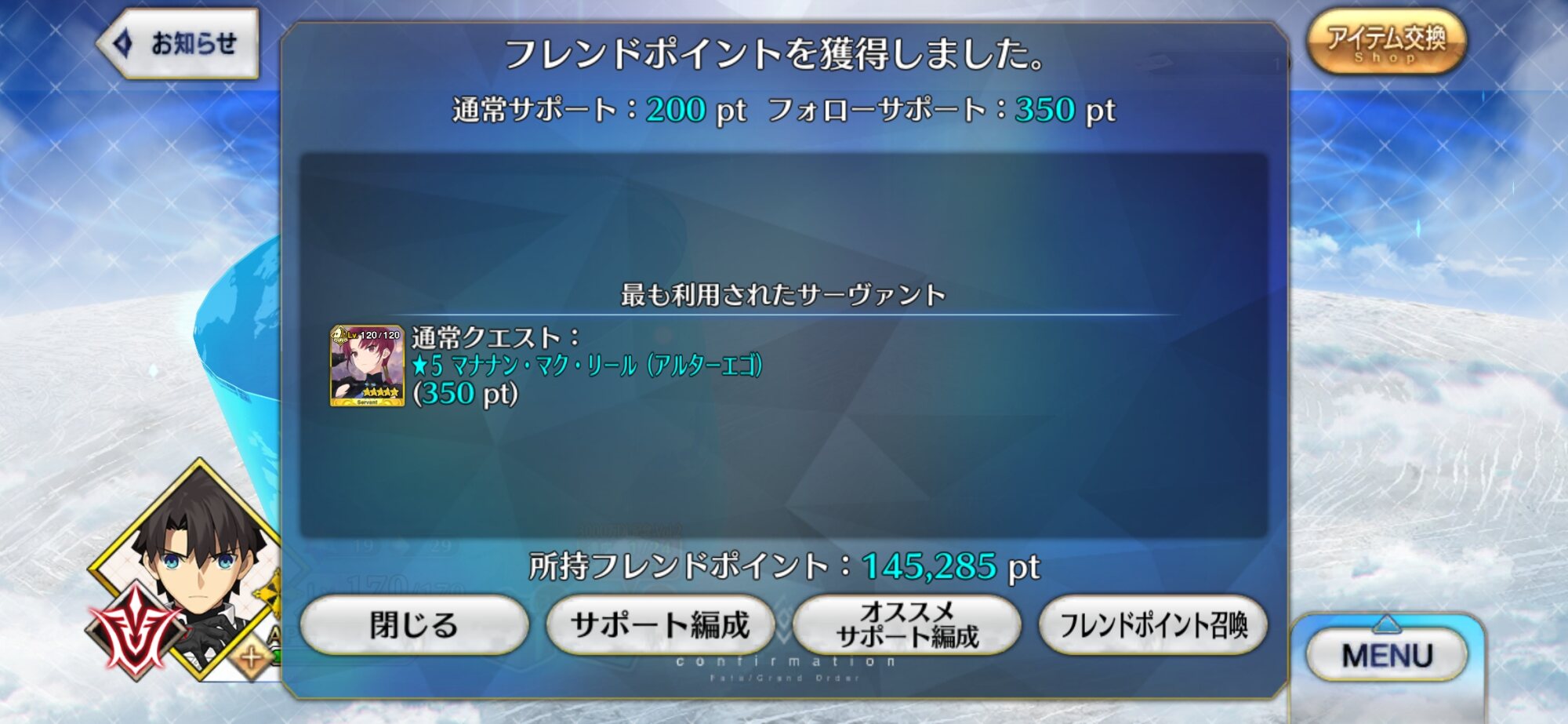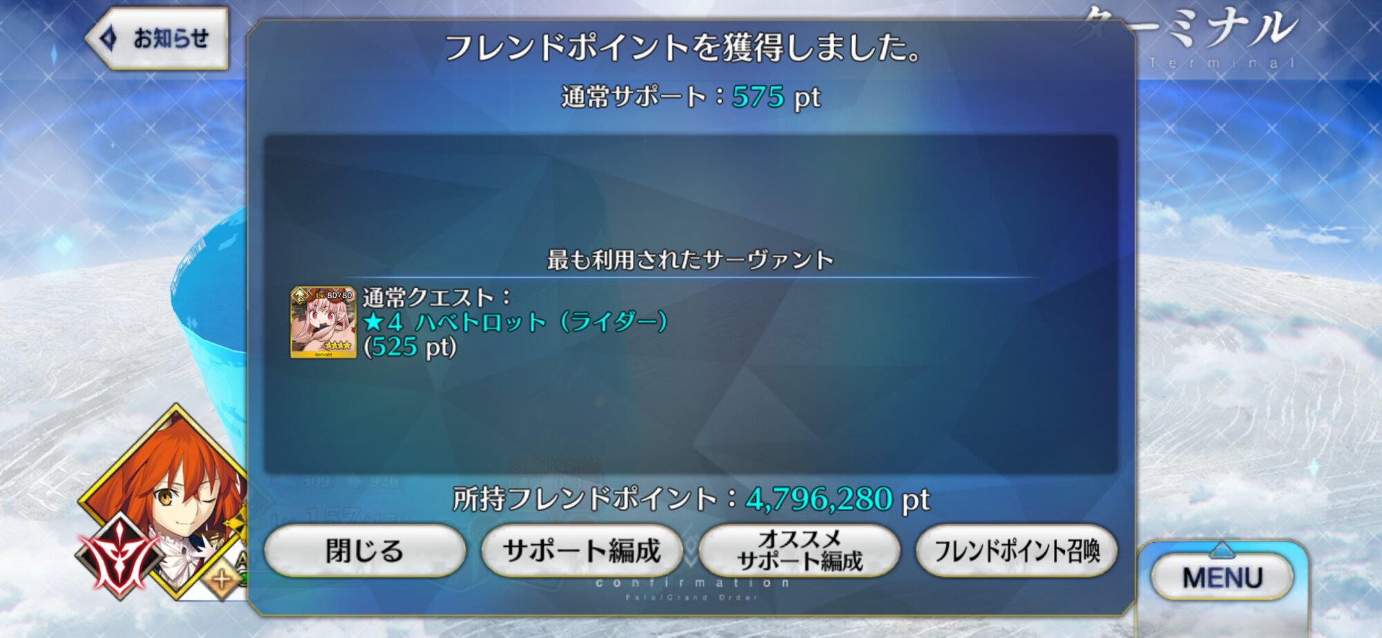 自分は種火と宝物庫周回のアンカーにしてるあとちょっと、あとちょっとでシエル先輩の絆が6になる……そうなればアペンド5を上げて周回が加速する……