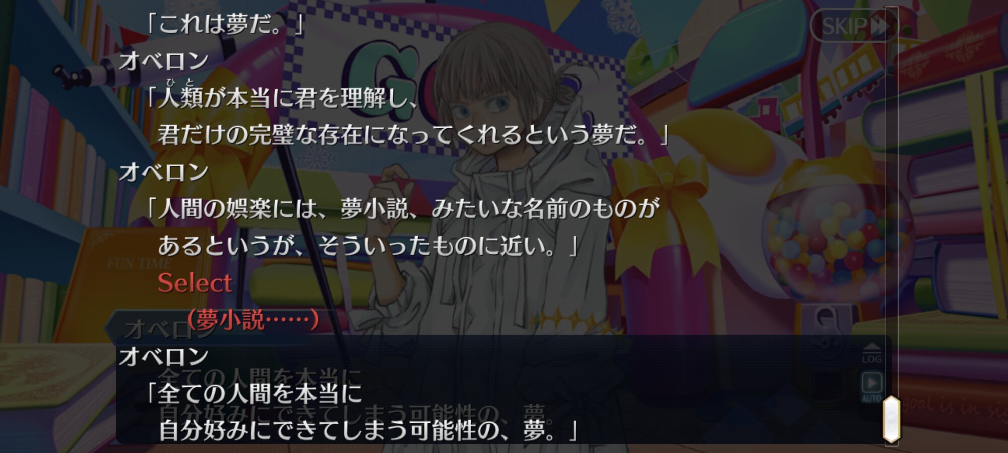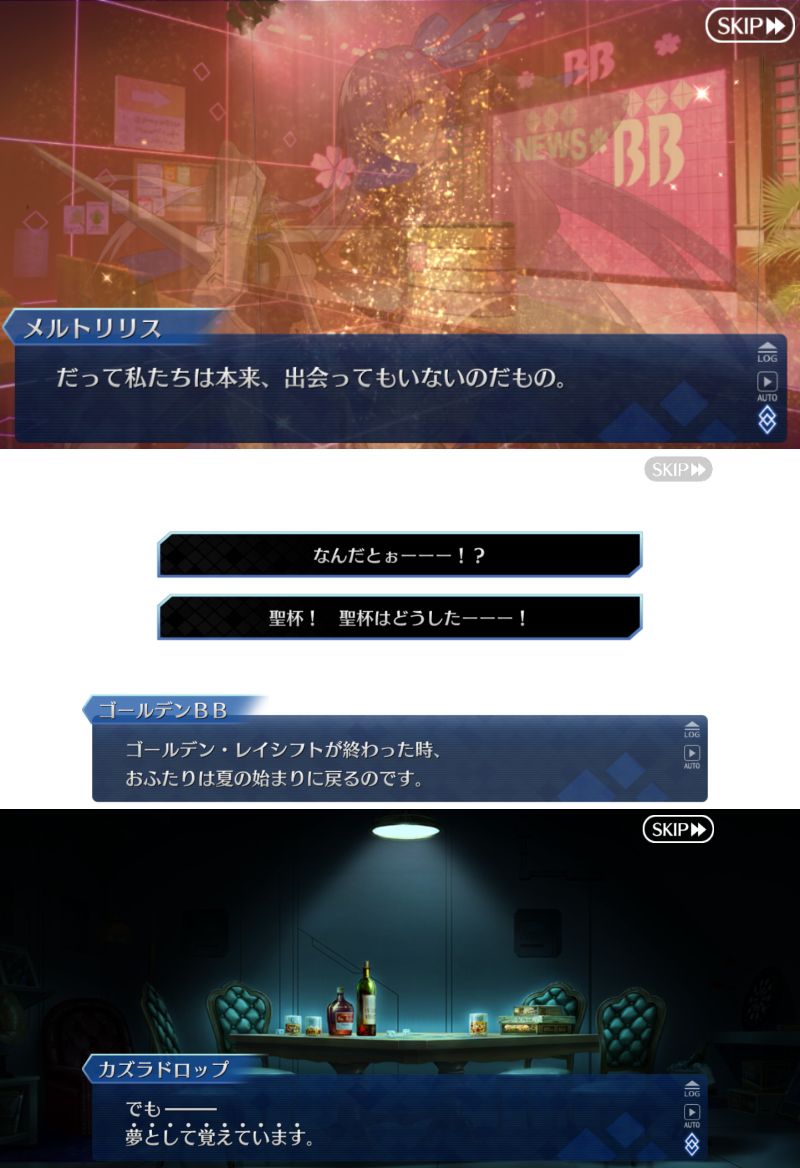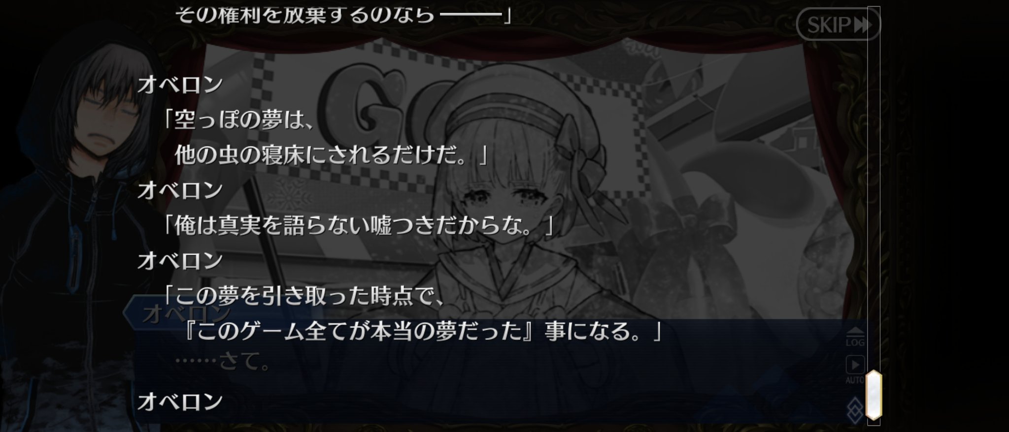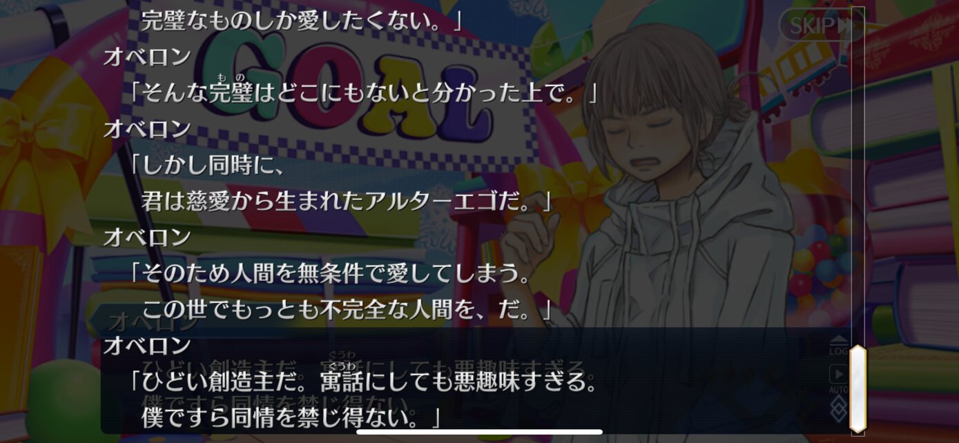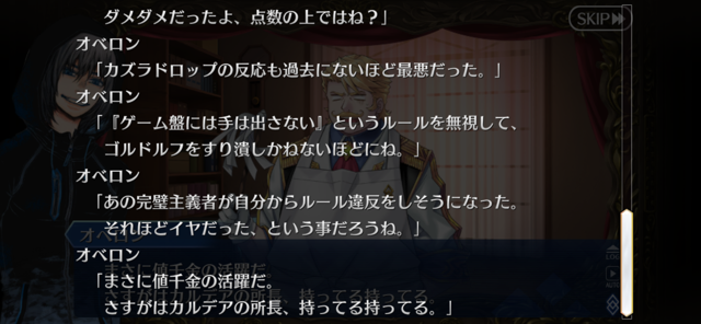 今回は現実だとカズラは消滅してしまうので、オベロンがカズラが手放した双六空間の支配権を奪って一連の出来事を夢とラッピングした。カズラの救いもないけど、同時に終わりも先延ばし、夢はプラマイゼロだからね、みたいな感じすべりこみで素材交換全部いけたー