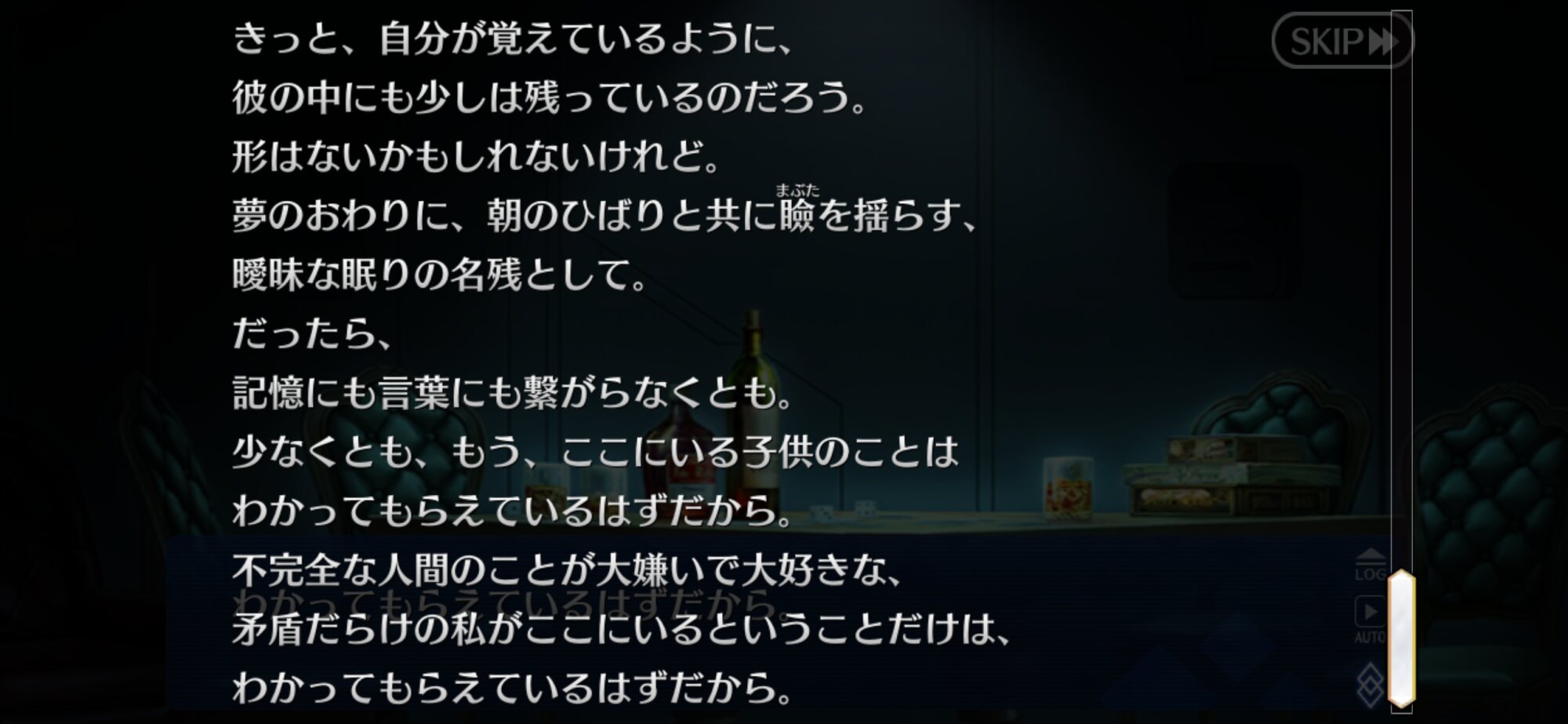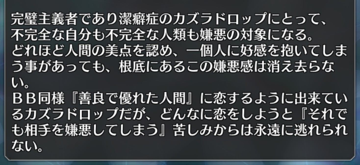 反対を行えばいいわけだしねカズラの根底に自分を理解してほしいと自分にかまってほしいが混ざって二つが同じものになっている可能性があるからランスロット卿のようなダメな父親と理解してなお誠実に謙虚に父親たらんとする態度や考え方がこのゲームの最適解なんだろな