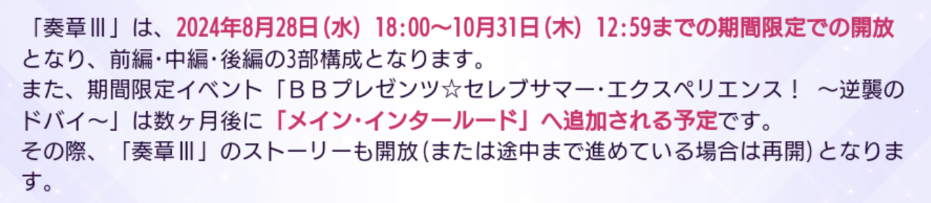 まあ残りの奏章でやることの数考えたら12月辺りになりそうまぁ6章だからって妖精メンツが来るとは限らんしなあくまで参加ラインがそこなだけ。そうなると5章もどのイベント来るのか読めないラインなんだけど。4章はある程度予想できたからなアンデルセンにパス貰ったカズラが参加する。