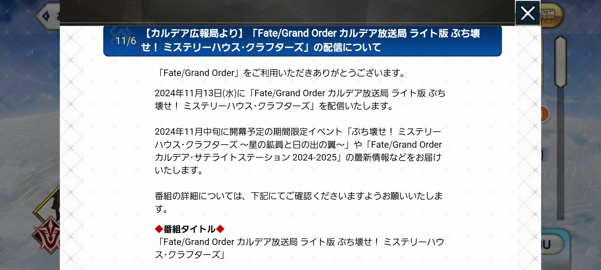 【カルデア広報局より】「Fate/Grand Order カルデア放送局 ライト版 ぶち壊せ! ミステリーハウス・クラフターズ」の配信について