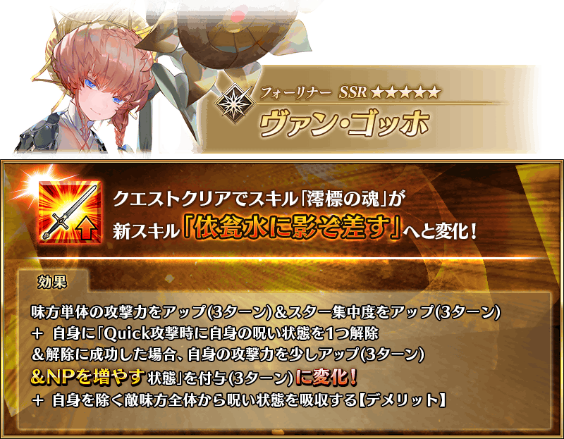 NPCのフォーリナーゴッホとフレンドのゴッホの両方が入るクエストが待たれる今までも攻撃する度に追加でNP貯まる系は居たが、それ持ってるヤツがほぼ軒並みぶっ壊れだからそのヤバさも分かるというもの