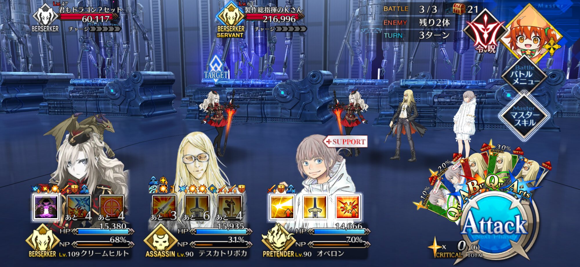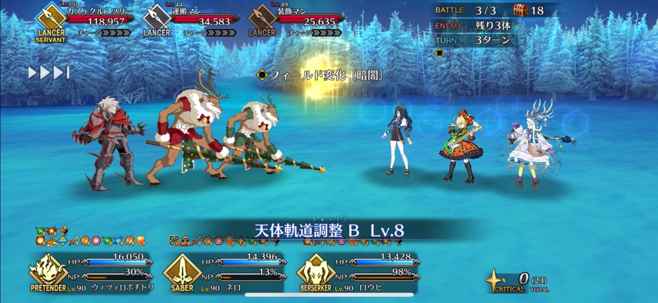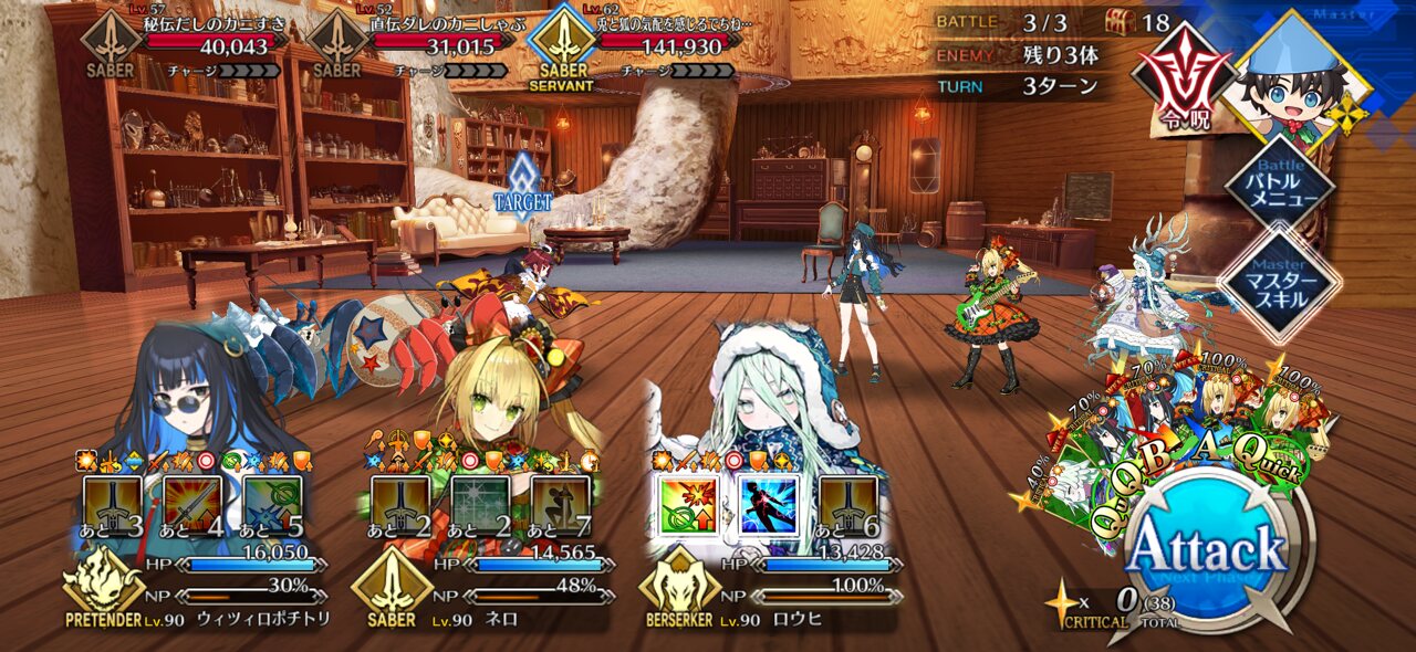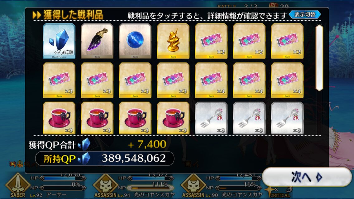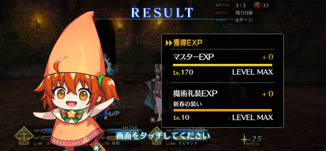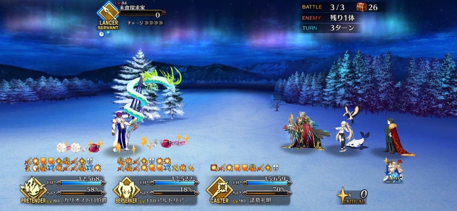 ちなみに、キャストリア&ベディヴィエール&ハベにゃん編成はキャストリア(アペ2LvMaxのフレ)の宝具を撃つことで追撃なしで行けました。