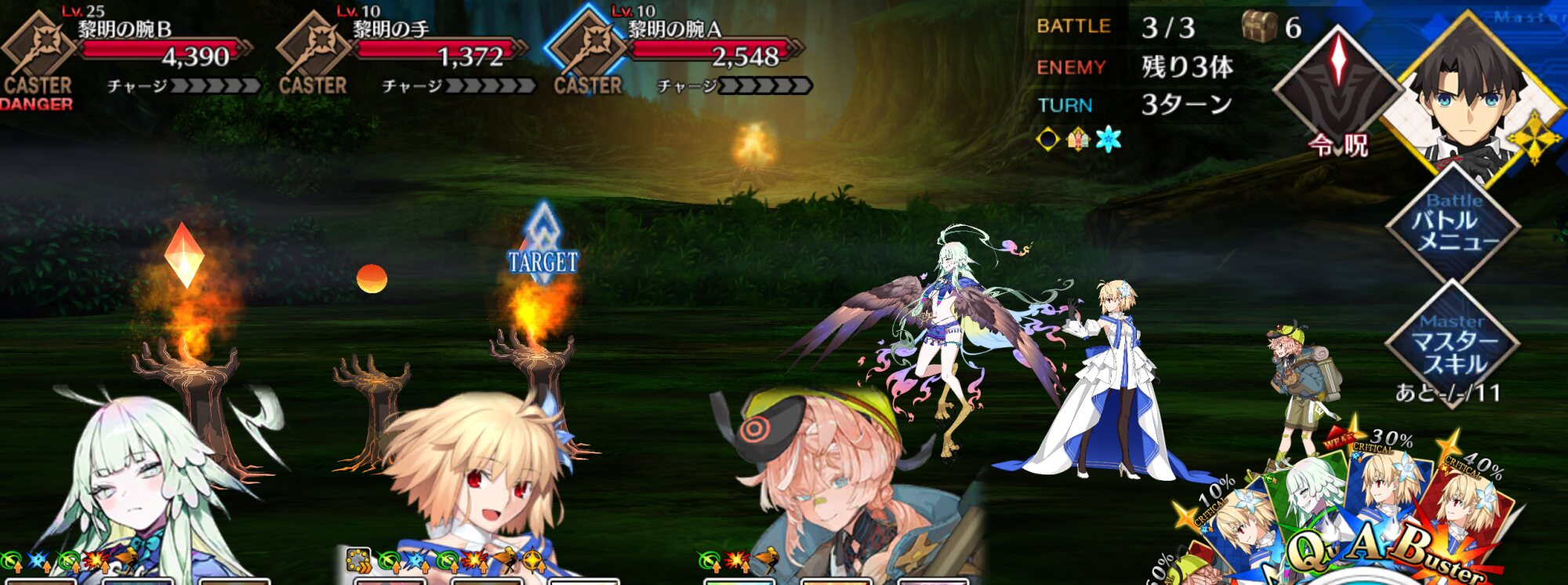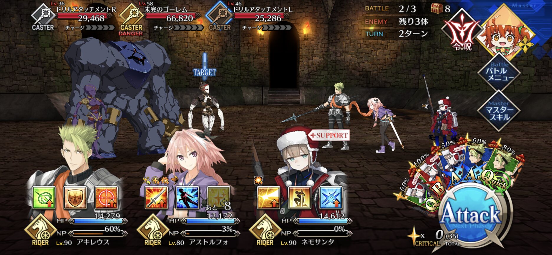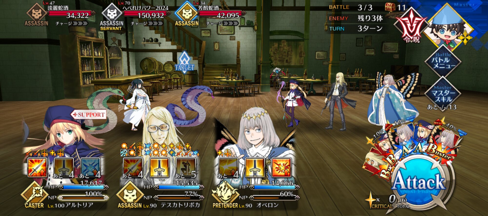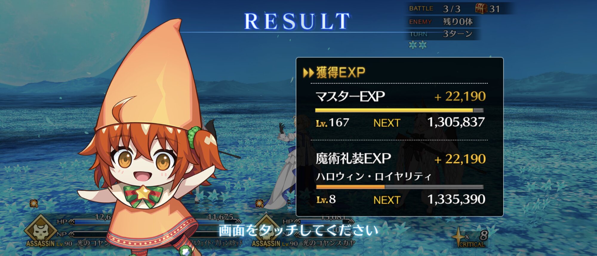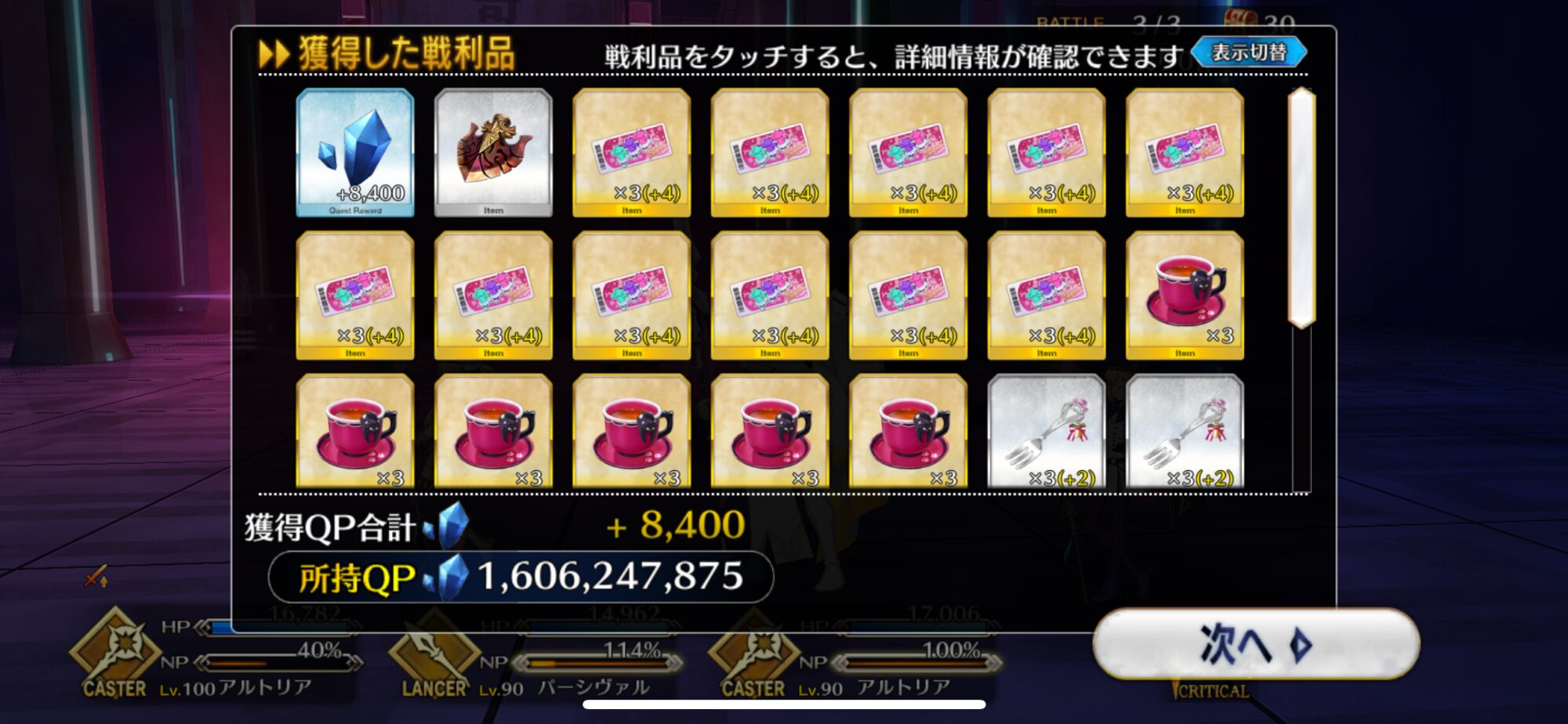 ちなみに、キャストリア&ベディヴィエール&ハベにゃん編成はキャストリア(アペ2LvMaxのフレ)の宝具を撃つことで追撃なしで行けました。