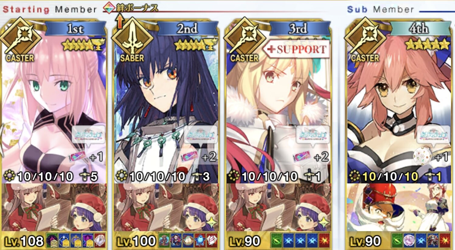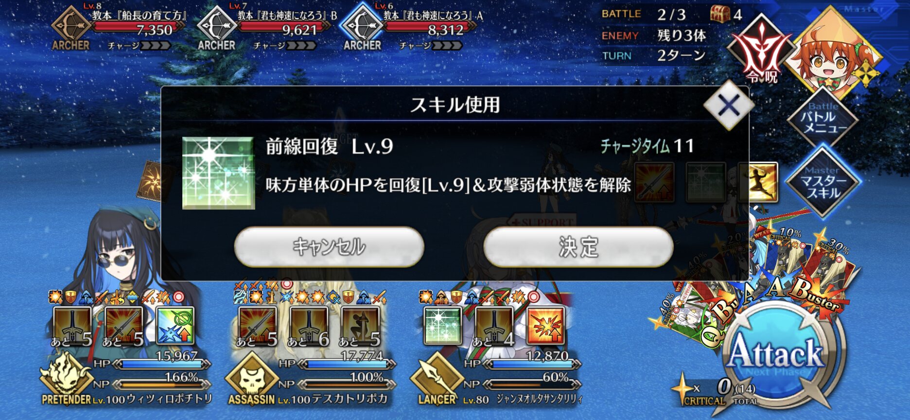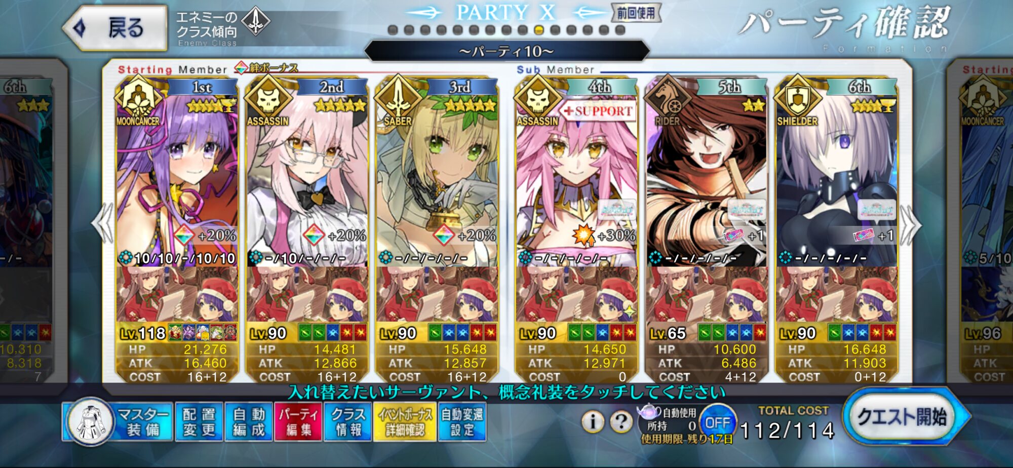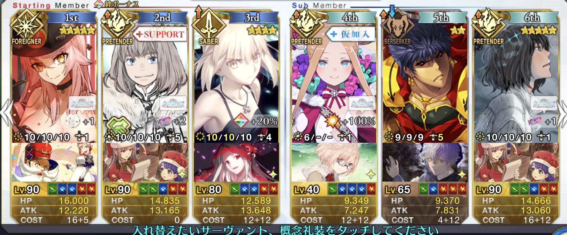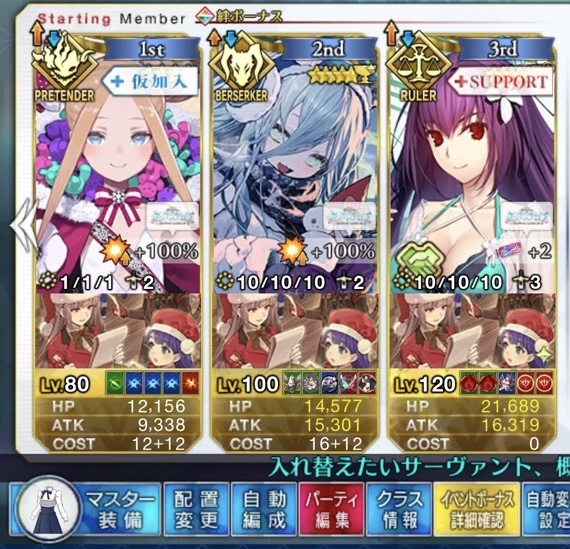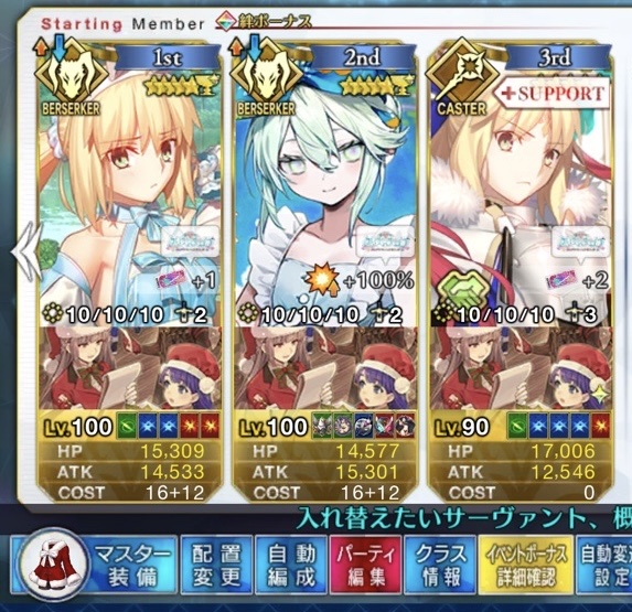 前衛のコストを抑えたくて色々と試行錯誤した結果、キャストリア&ベディヴィエール(アペ2解放のみ)&姫君(アペ2LvMax)となった。