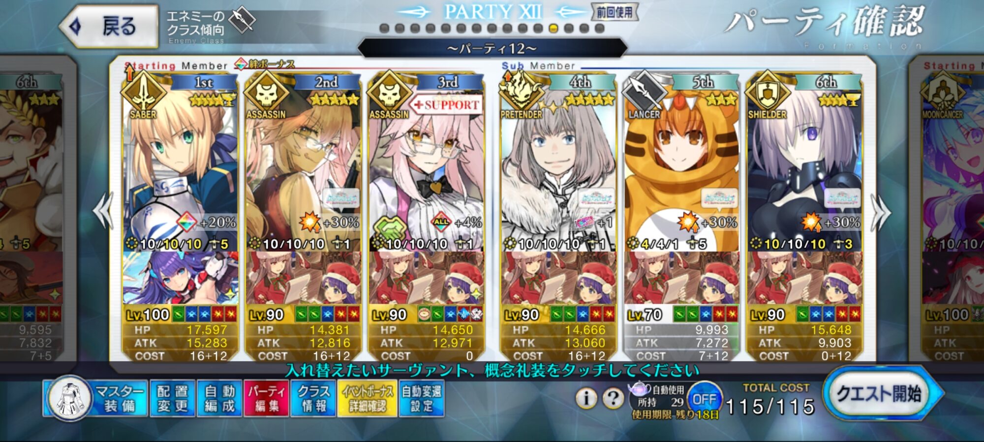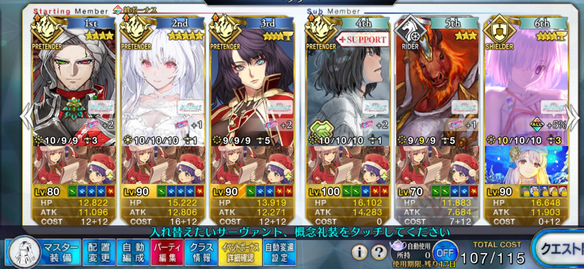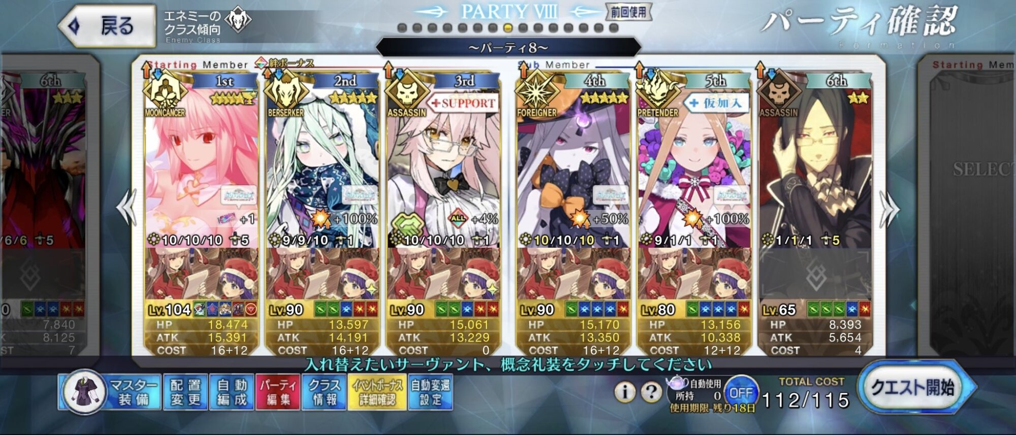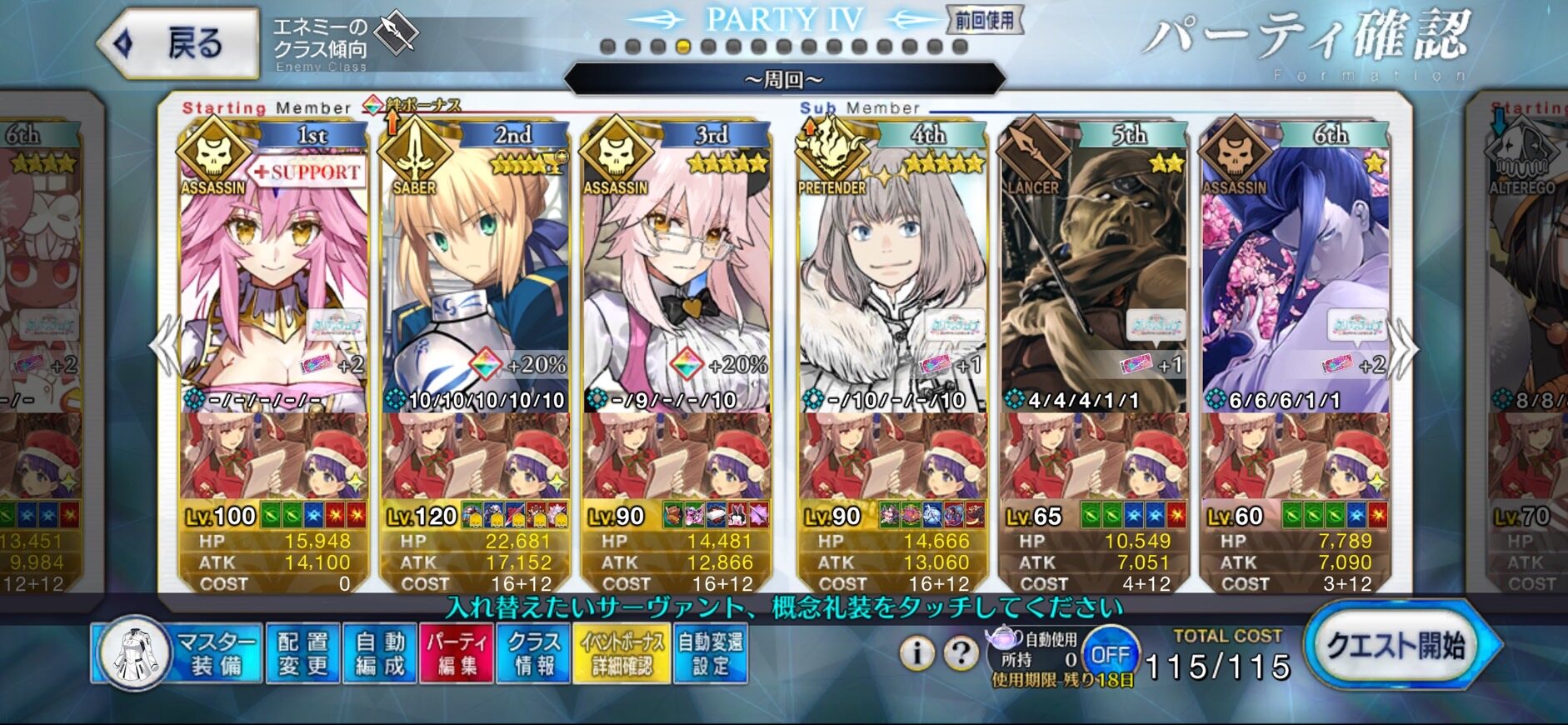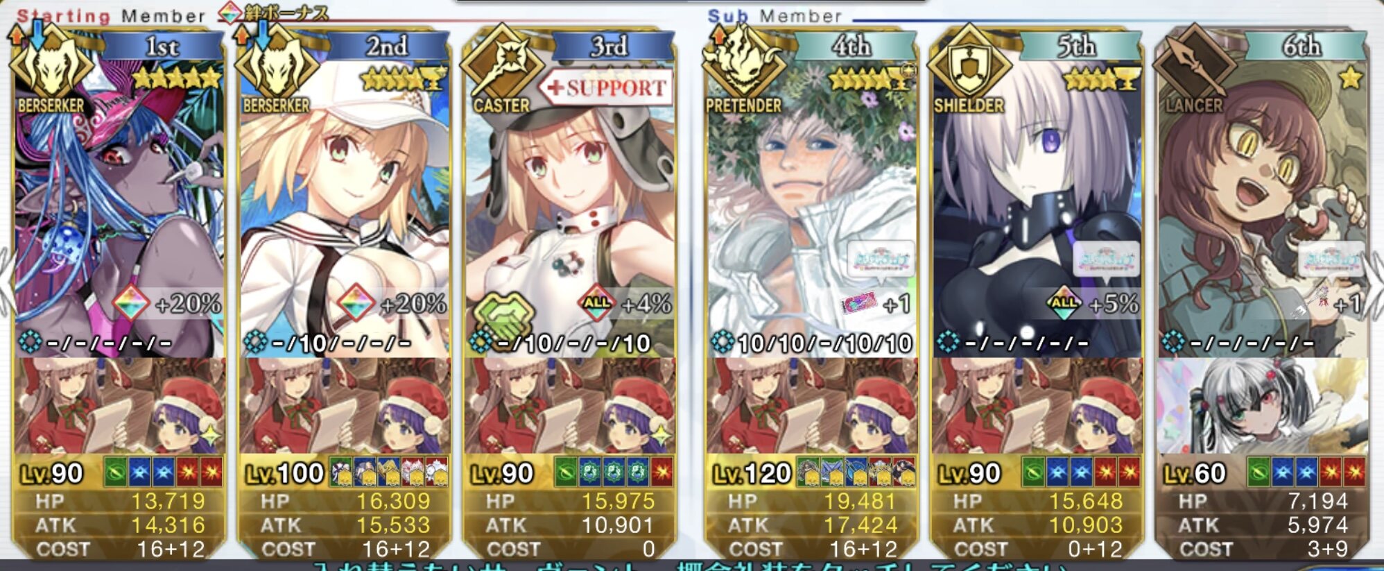 前衛のコストを抑えたくて色々と試行錯誤した結果、キャストリア&ベディヴィエール(アペ2解放のみ)&姫君(アペ2LvMax)となった。